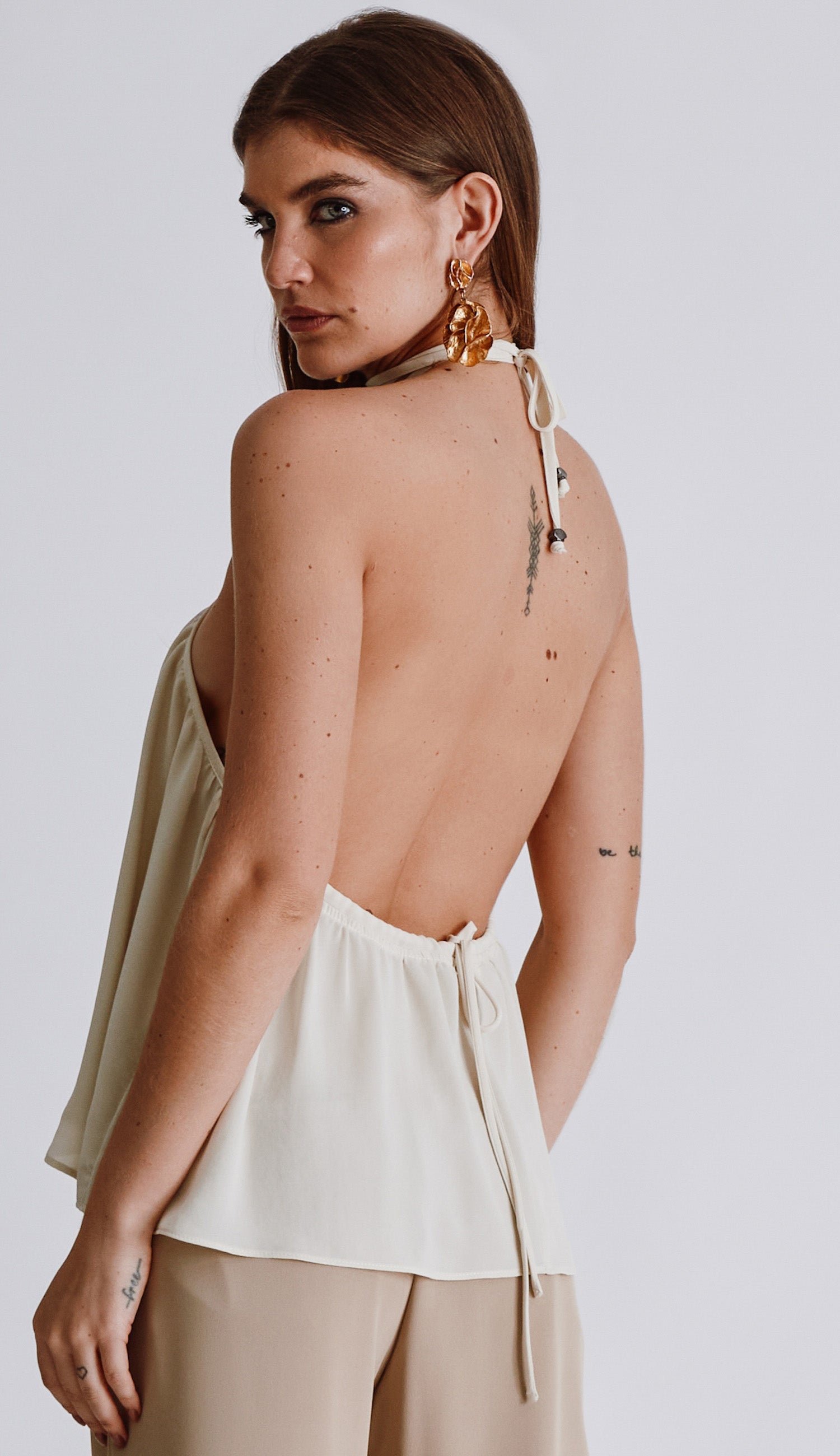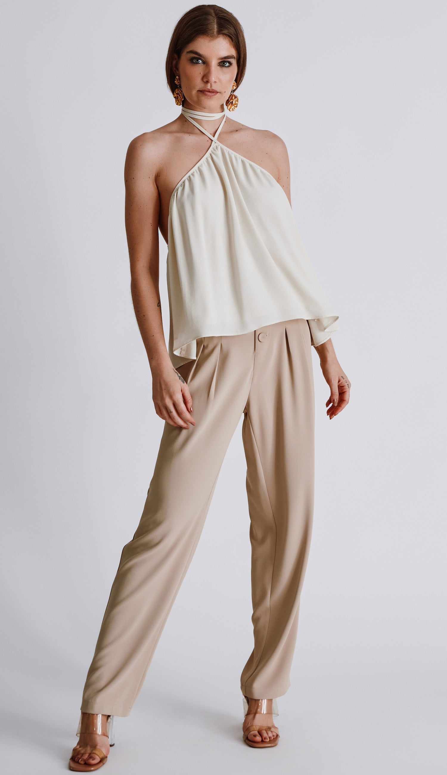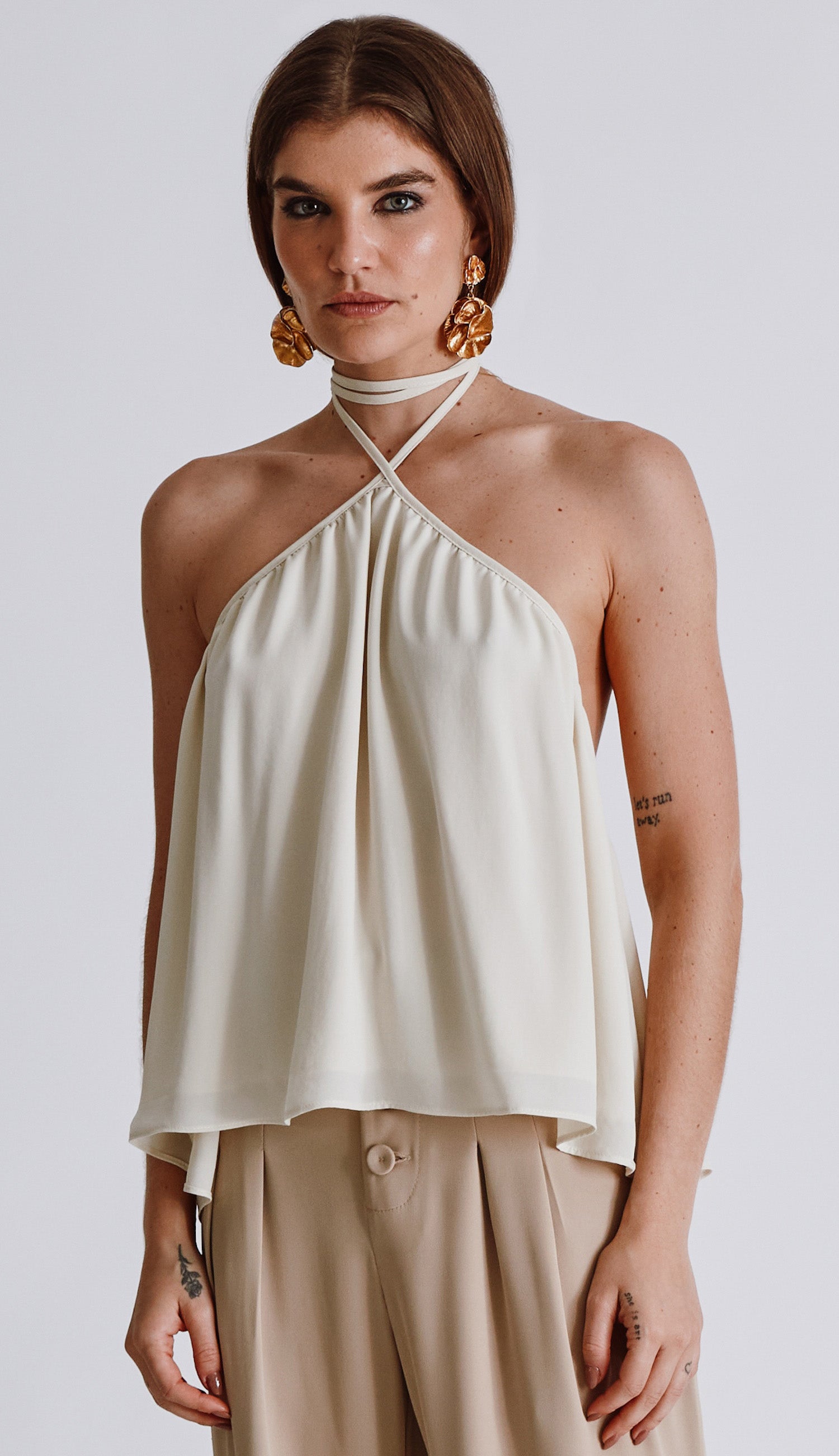 Blusa confeccionada em crepe. Possui modelagem soltinha, decote frente única com franzidinhos e tirinha comprida para amarração no pescoço com delicadas ponteiras de conchinha em metal e tira nas costas para ajuste permitindo diversos tipos de amarração.