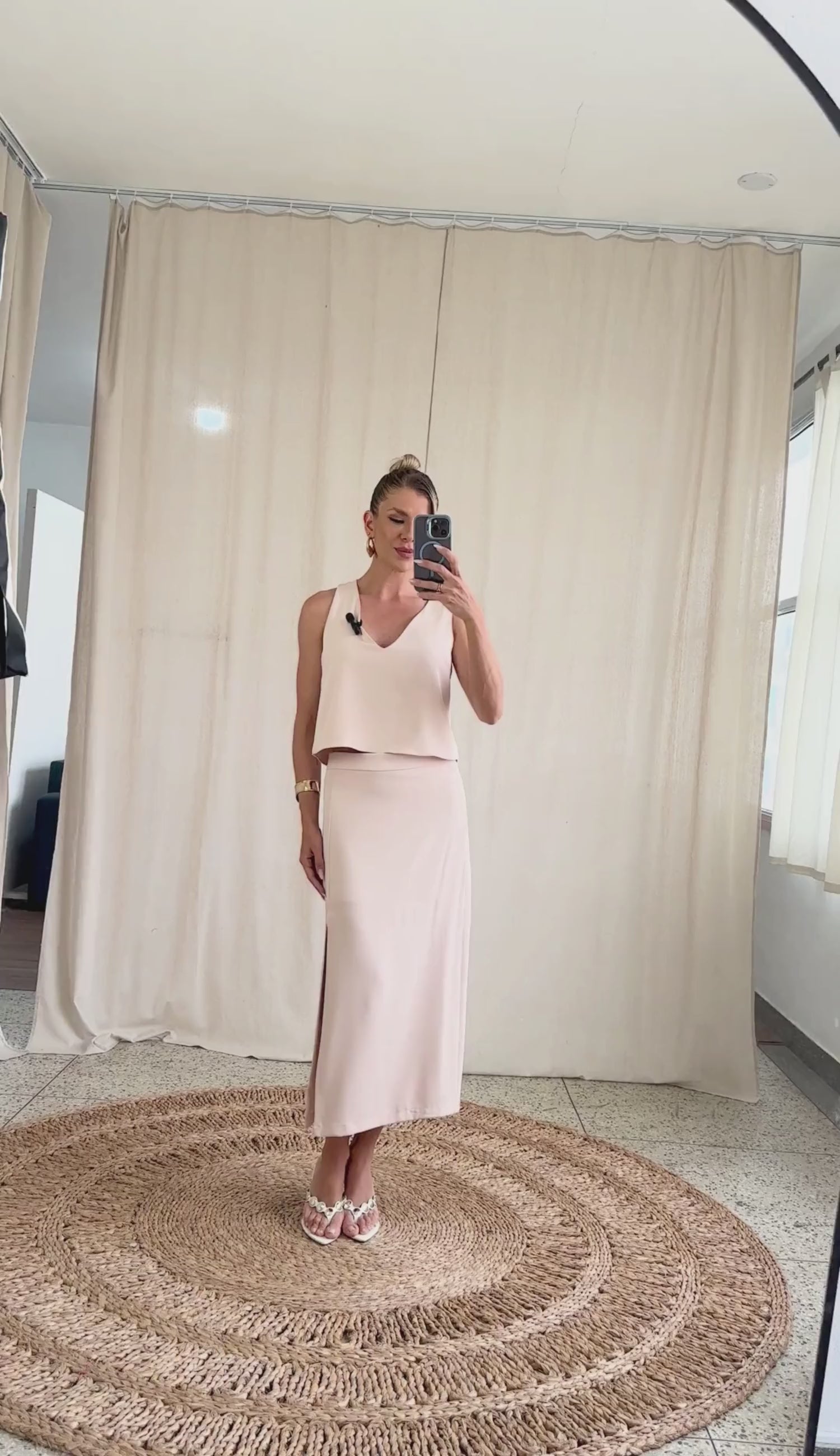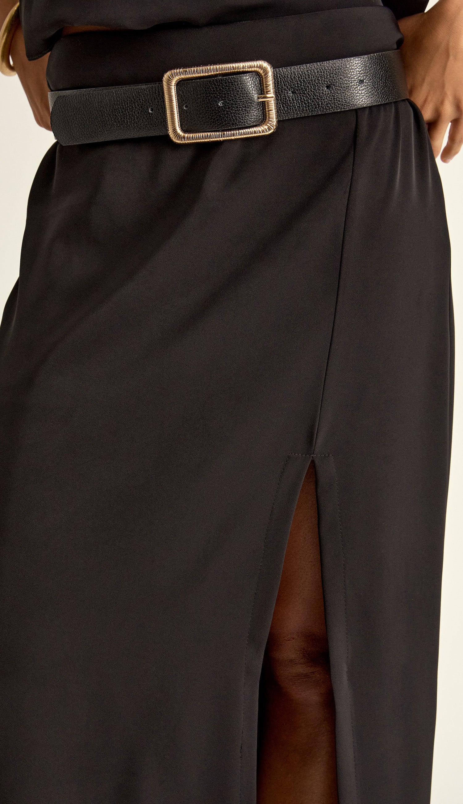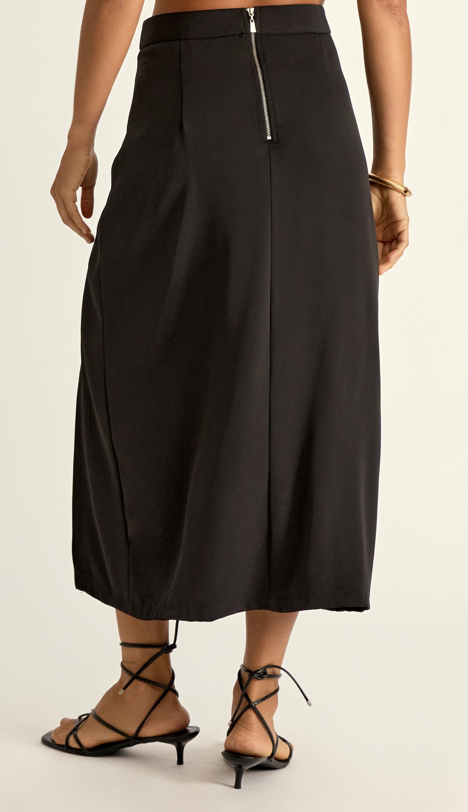 Saia lápis longuete confeccionada em crepe de alfaiataria com forro. Possui fenda frontal, recortes que modelam a silhuta da peça e fechamento traseiro por zíper de metal com pingente que tem a conchinha da Laguna gravada. A peça que une elegância e funcionalidade; oferece a versatilidade necessária para compor looks que vão do clássico ao moderno.