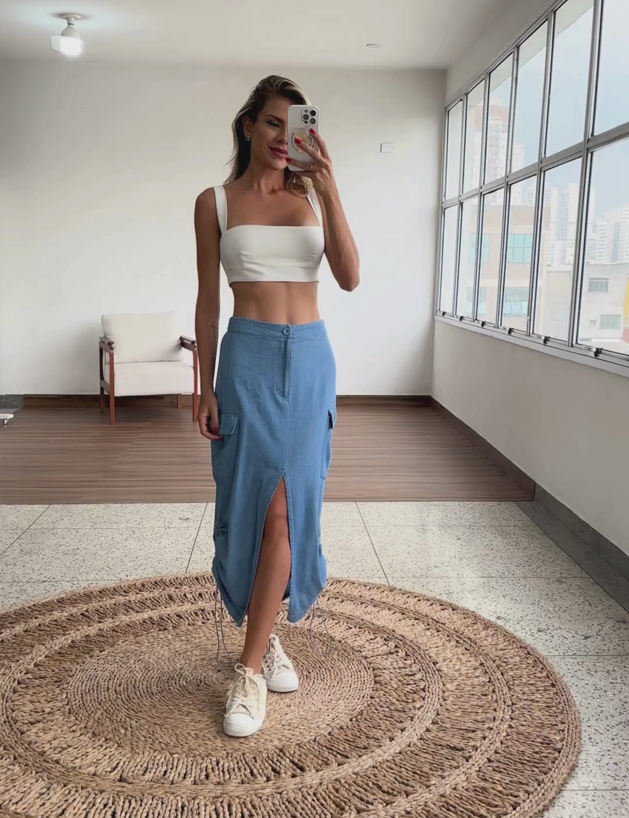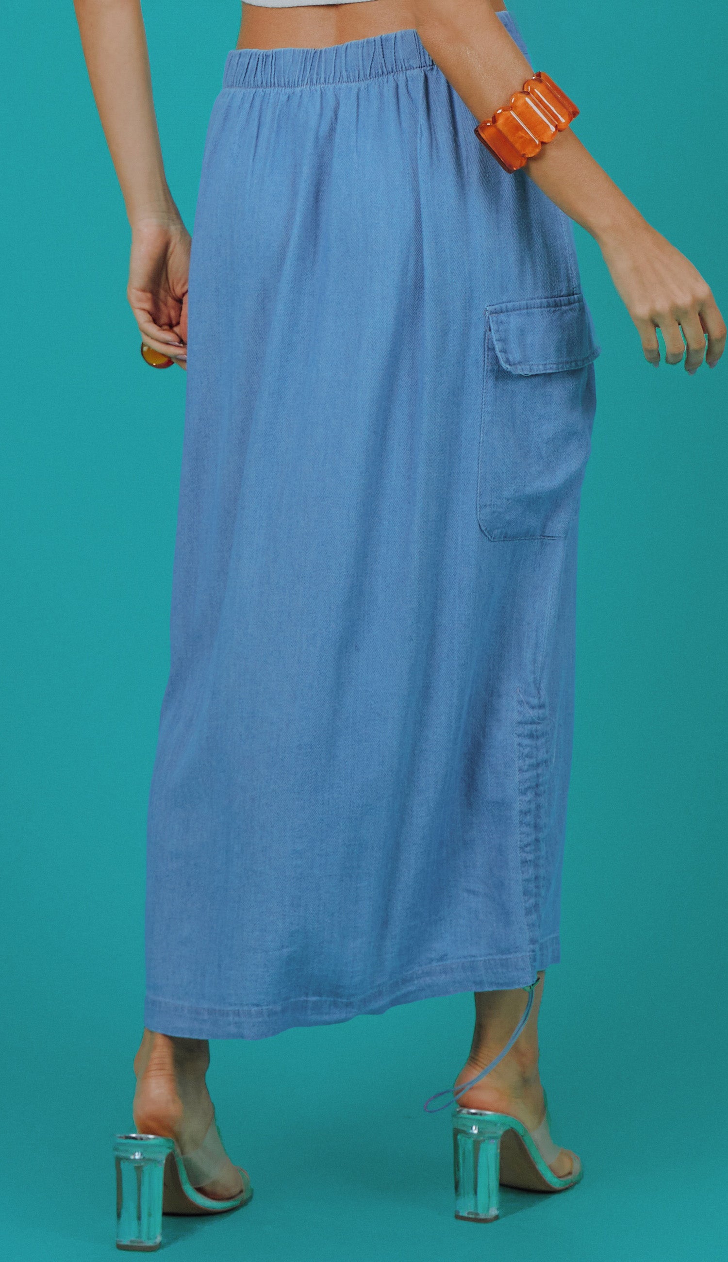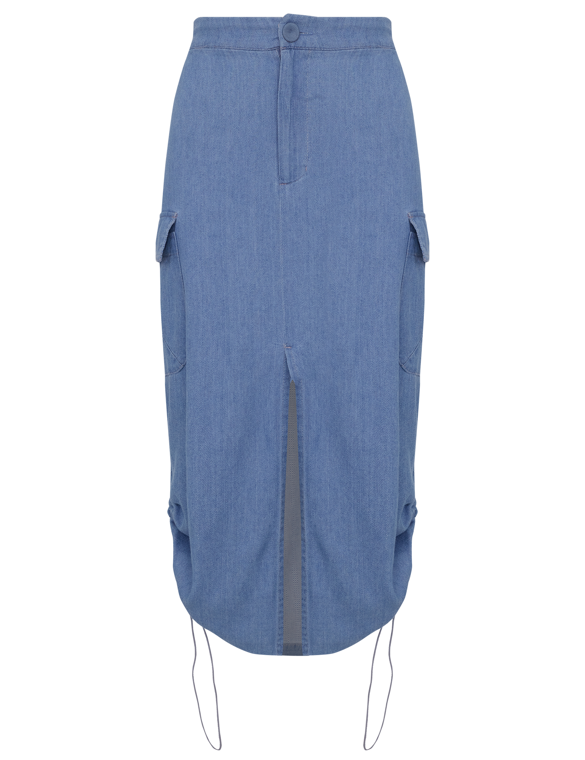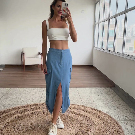 Saia jeans longuete com fechamento frontal por zíper e botão forrado, elástico no cós costas, maxi bolsos laterais com lapela no estilo cargo, fenda frontal, modelagem soltinha e ajuste das laterais por elástico embutido e reguladores de metal para franzir. O tecido é leve, fresco e macio por dentro, perfeito para os climas mais quentes.