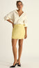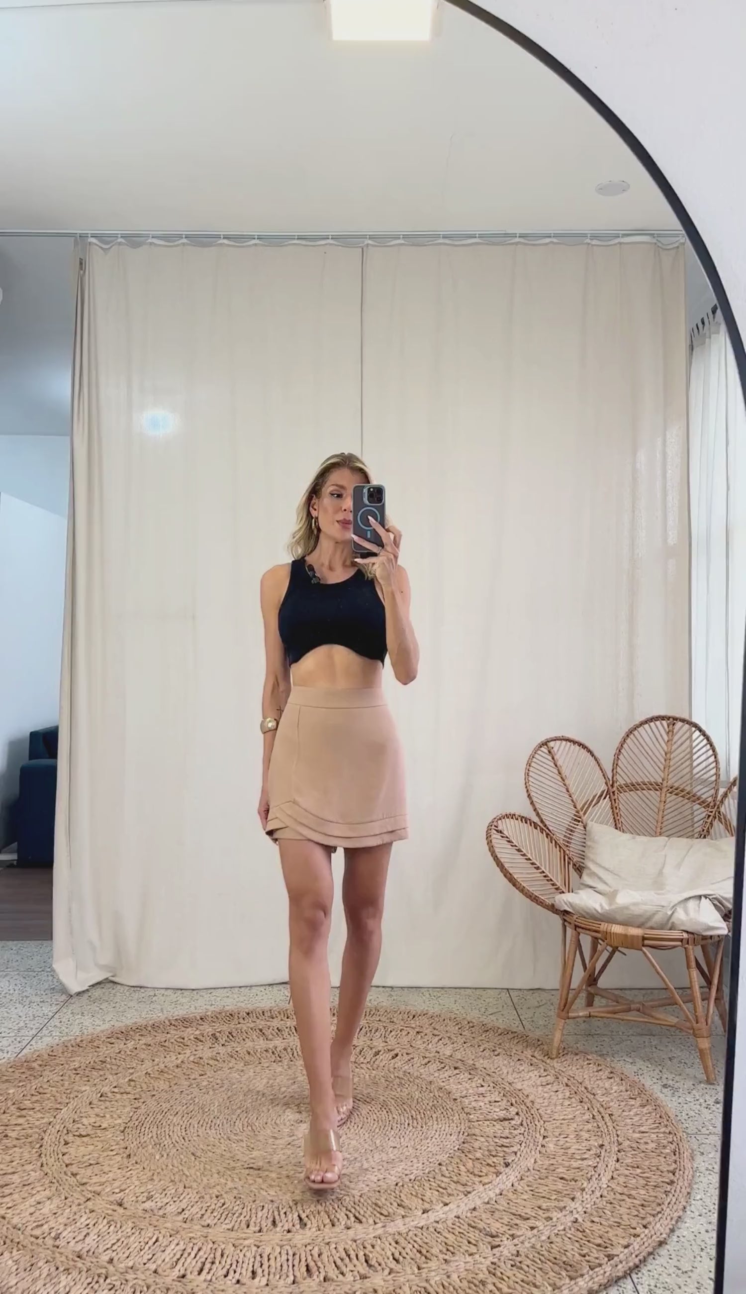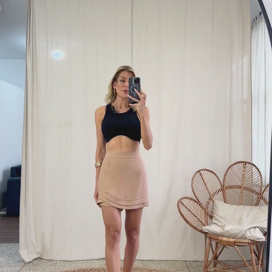 Shorts saia confeccionado em alfaiataria de poliviscose com forro. Possui fechamento traseiro por zíper de metal com pingente que tem a conchinha da Laguna gravada no metal e sobreposição frontal da saia com um barrado assimétrico com recorte arredondado e detalhe de camadas sobrepostas.