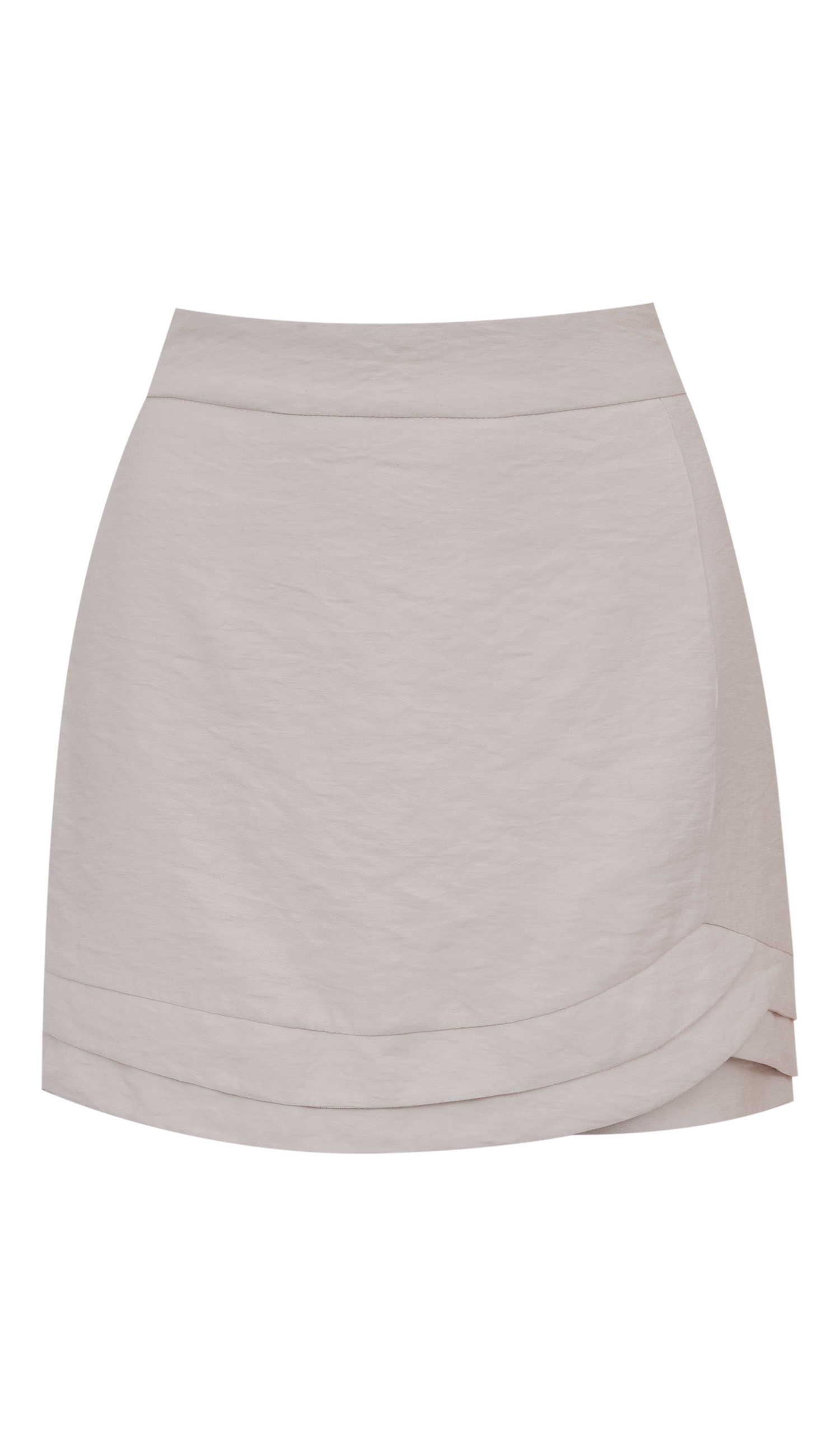 Sobreposição frontal da saia com barrado assimétrico, recorte arredondado e camadas sobrepostas
