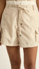 Shorts impermeável confeccionado em nylon com forro. Possui cintura ajustada com elástico franzido revestido na parte traseira do cós, pernas mais soltinhas em estilo evasê, fechamento frontal por zíper e botãozinho forrado, cós com passantes e dois ilhóses de metal frontais de onde saem tirinhas embutidas no mesmo tecido com ponteiras de metal em formato de conchinha usados para ajuste da cintura e amarração; além de bolsos laterais amplos no estilo cargo.