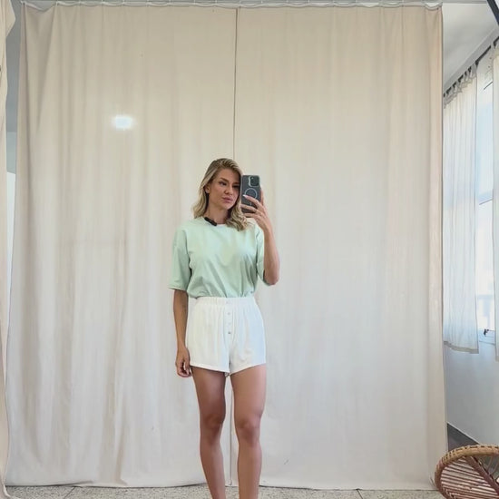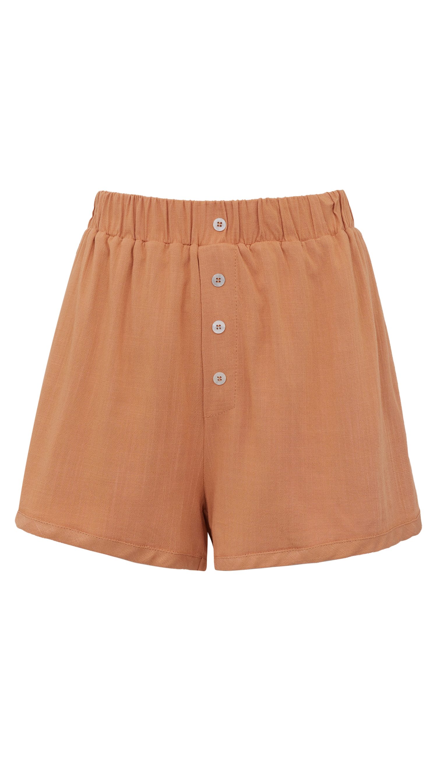 Shorts com forro, confeccionado em viscose texturizada com aspecto de linho. Possui elástico mais grosso franzido no cós, modelagem soltinha e detalhe frontal de botõesinhos em madrepérola.