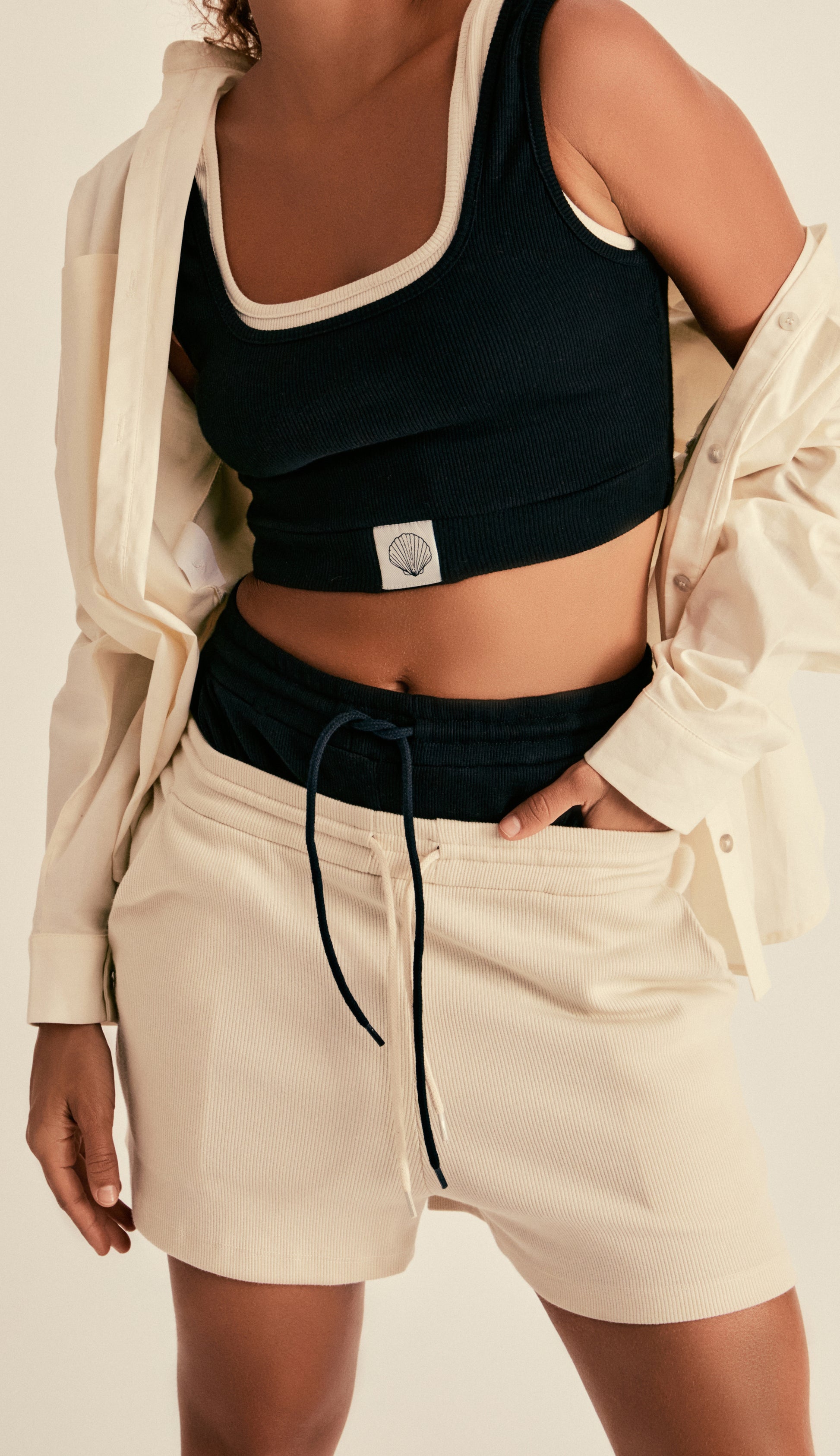 Shorts confeccionado em malha canelada. Possui elástico no cós com cordão embutido para amarração, bolsos laterais e bolso traseiro aplicado.