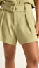 Shorts confeccionado em crepe de alfaiataria com forro. Possui modelagem clochard com cintura alta, preguinhas, passantes duplos no cós, bolsos embutidos laterais e traseiro, perna soltinha, fechamento frontal por zíper não aparente e acompanha faixa solta do mesmo tecido com fivela de metal forrada para ajuste na cintura.