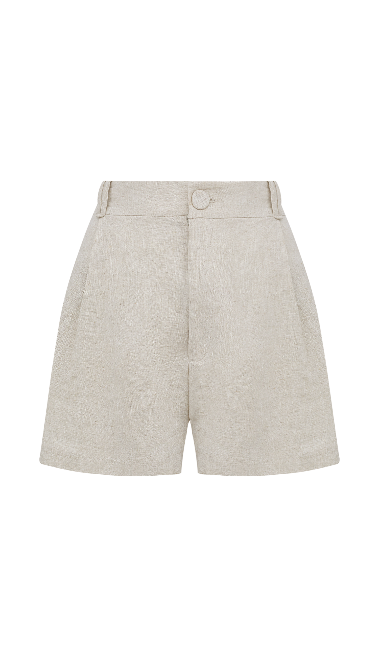 Shorts confeccionado em linho com forro. Possui modelagem clássica de alfaiataria mais soltinho, fechamento frontal por ziper e botão forrado, pregas que desenham a silhueta, delicados passantes duplos, bolsos faca laterais e bolso traseiro embutido. Feito em 100% linho - tecido nobre, leve e natural, que traduz o equilíbrio entre sofisticação e conforto. Uma peça que respira elegância e atravessa o tempo com beleza.