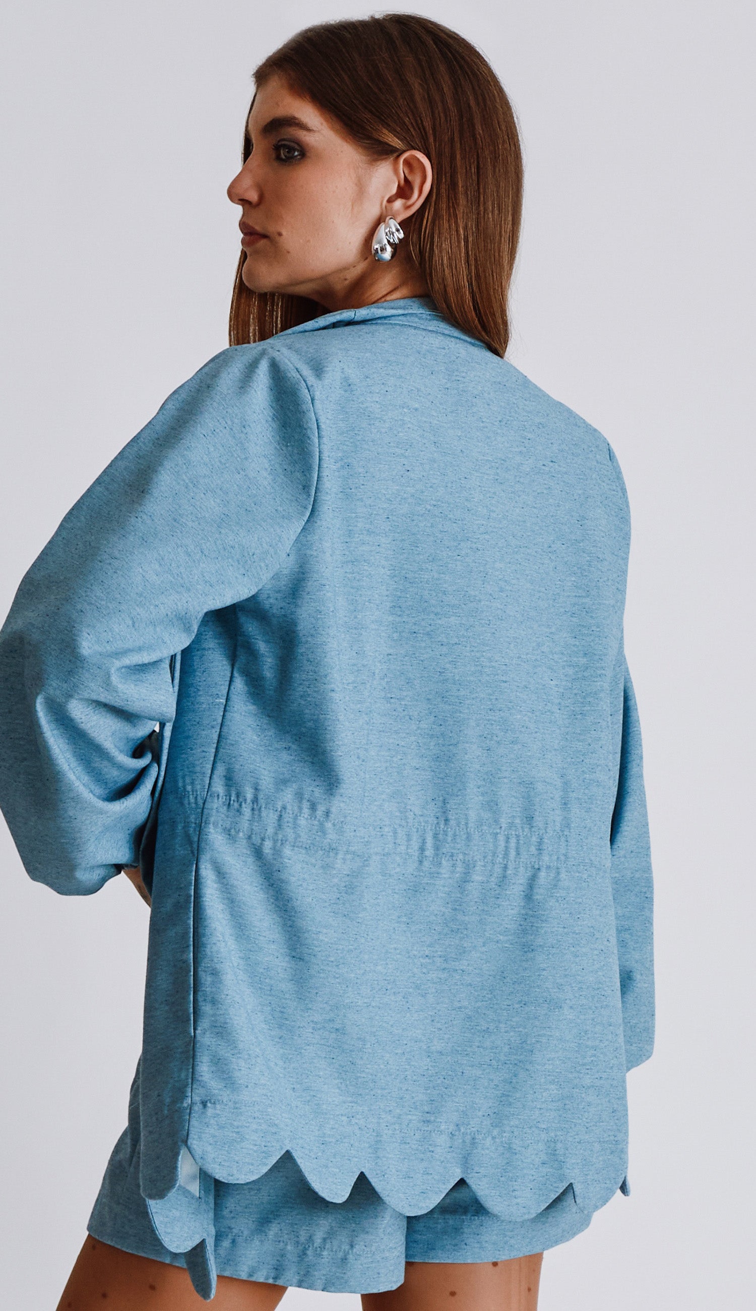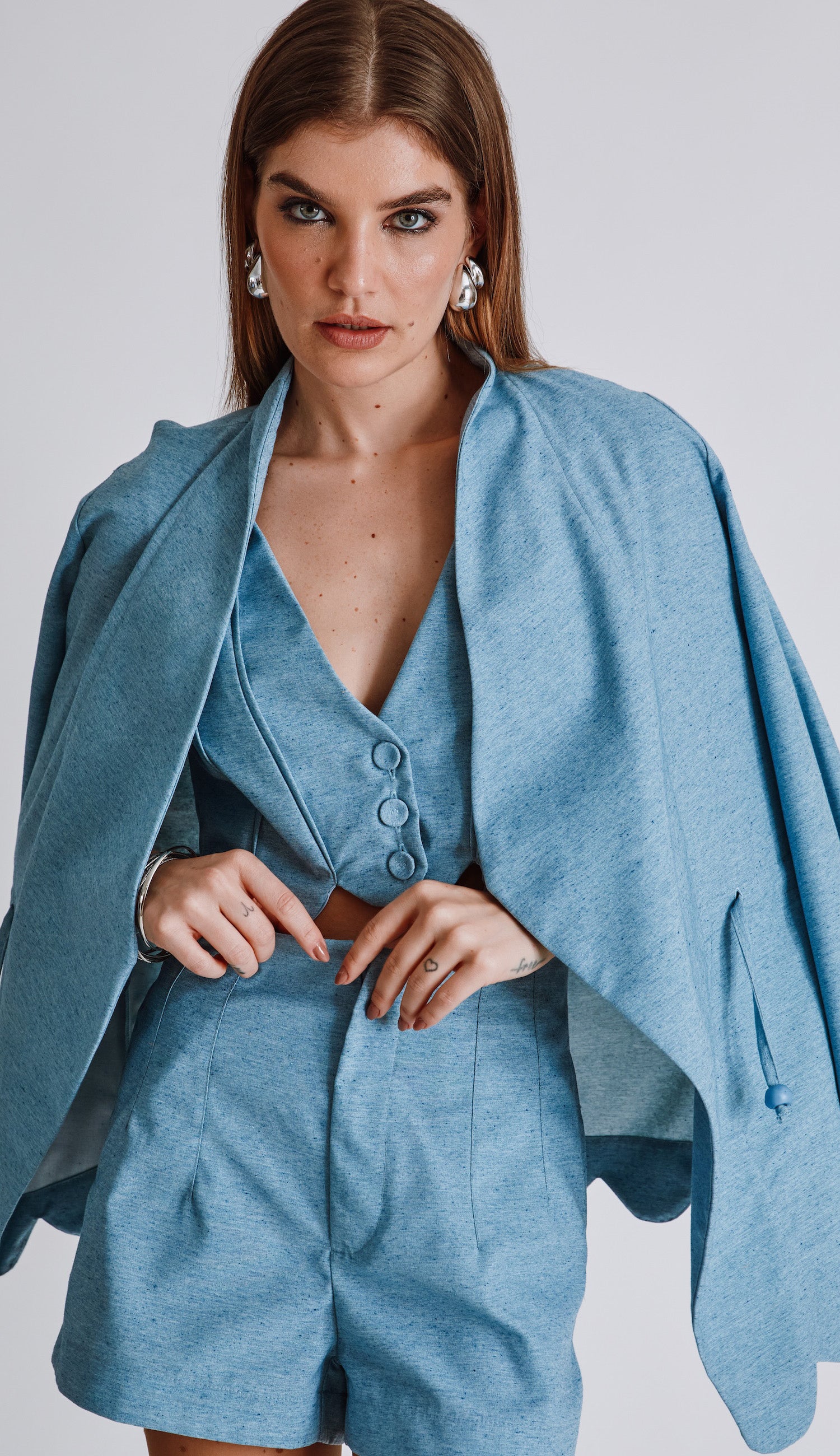 Trijunto confeccionado em linho revestido com padronagem rajada. O colete possui forro, decote em V com fechamento frontal por botões forrados, recortes verticais com detalhes em vivo e barra com recortes arredondados. O shorts possui forro, pregas, bolsos laterais e fechamento frontal por zíper. O casaco é aberto, possui modelagem alongada, ajuste na cintura por tira embutida com regulador, mangas longas com punho em lastex e lapela dobrada na gola.