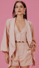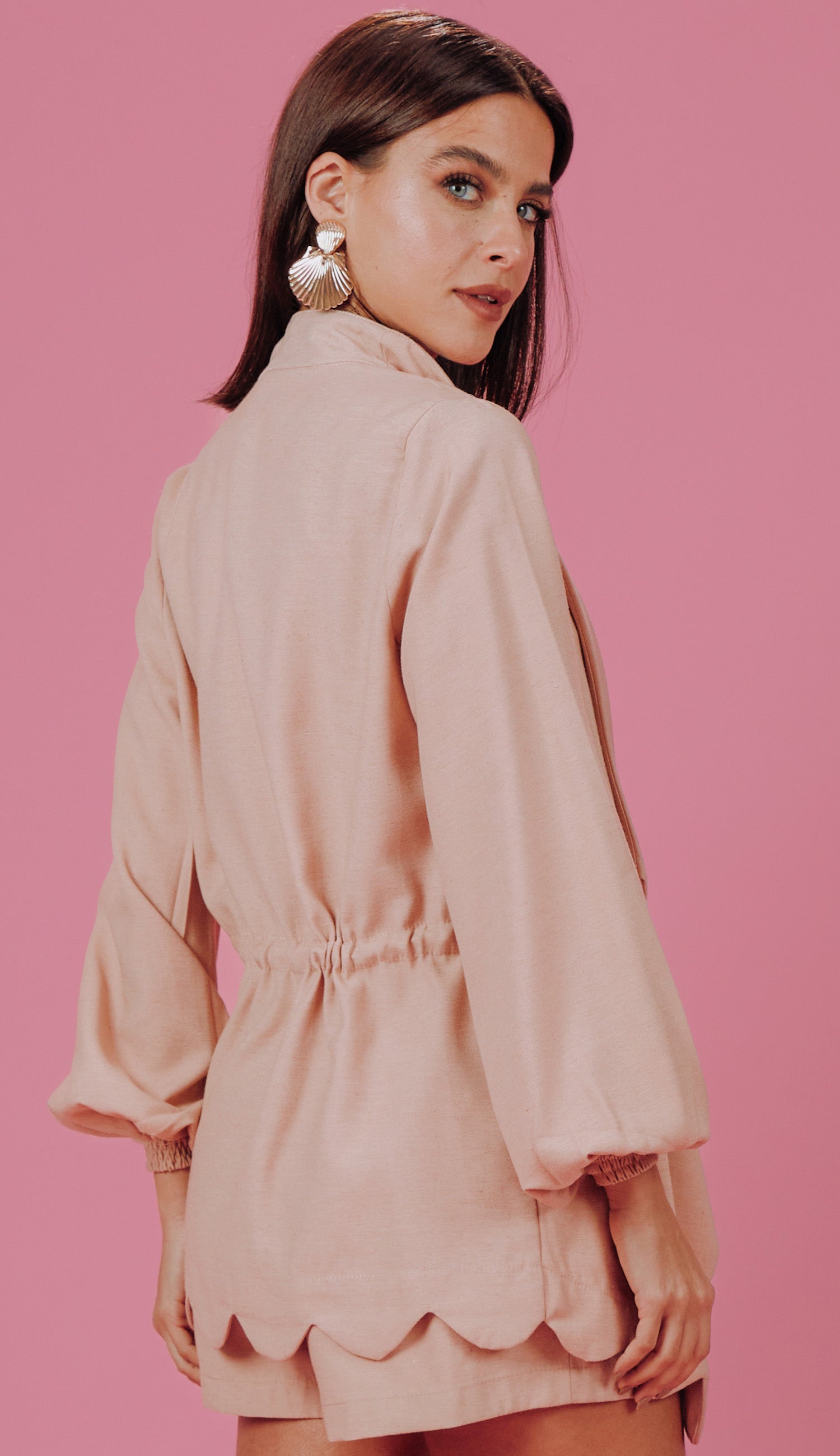 Trijunto confeccionado em linho. O colete possui forro, decote em V com fechamento frontal por botões forrados, recortes verticais com detalhes em vivo e barra com recortes arredondados. O shorts possui forro, pregas, bolsos laterais e fechamento frontal por zíper. O casaco é aberto, possui modelagem alongada, ajuste na cintura por tira embutida com regulador, mangas longas com punho em lastex e lapela dobrada na gola.