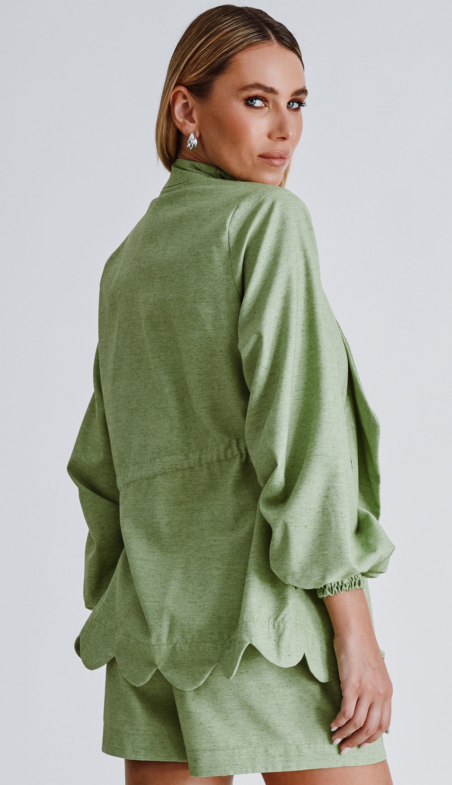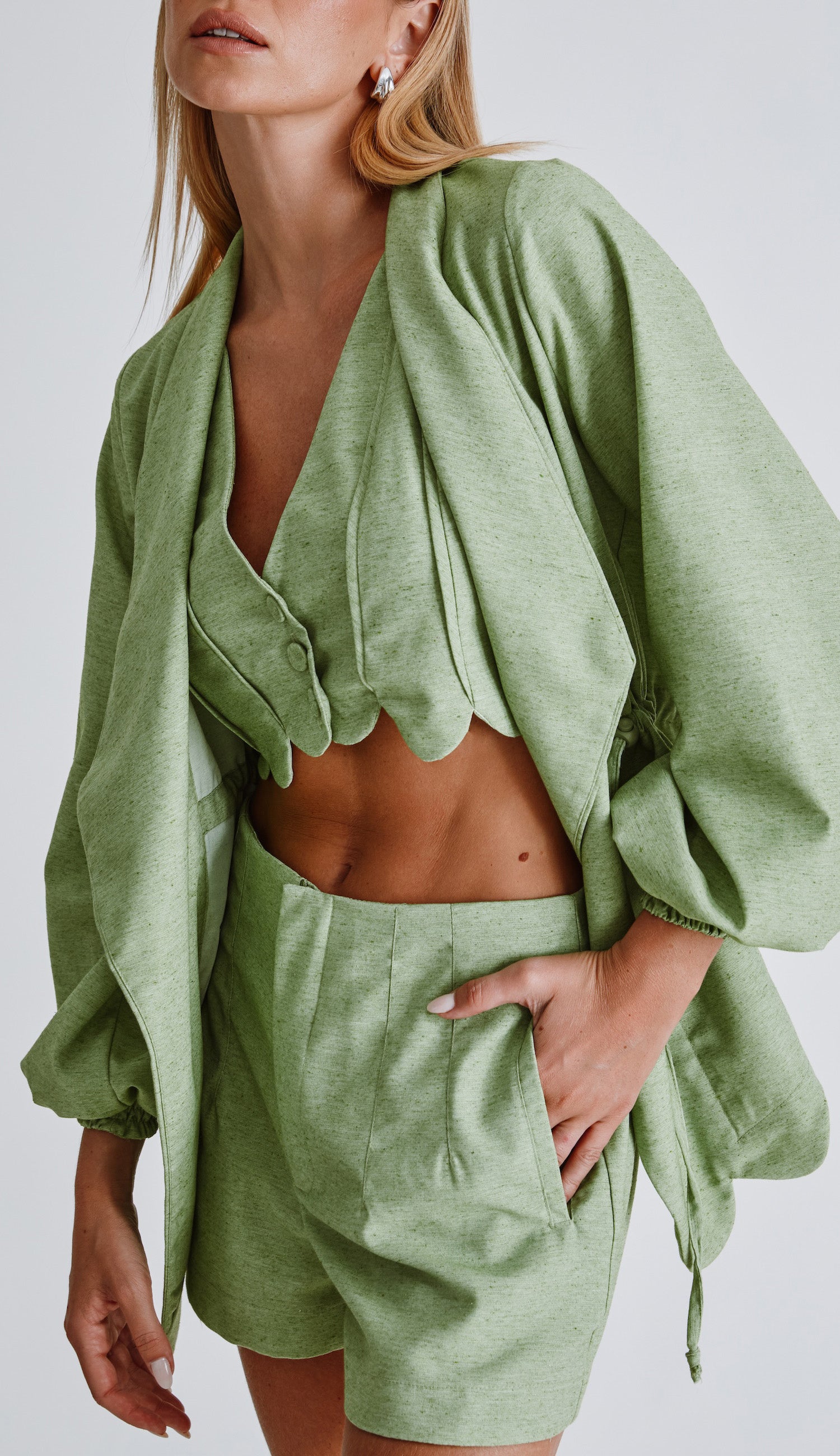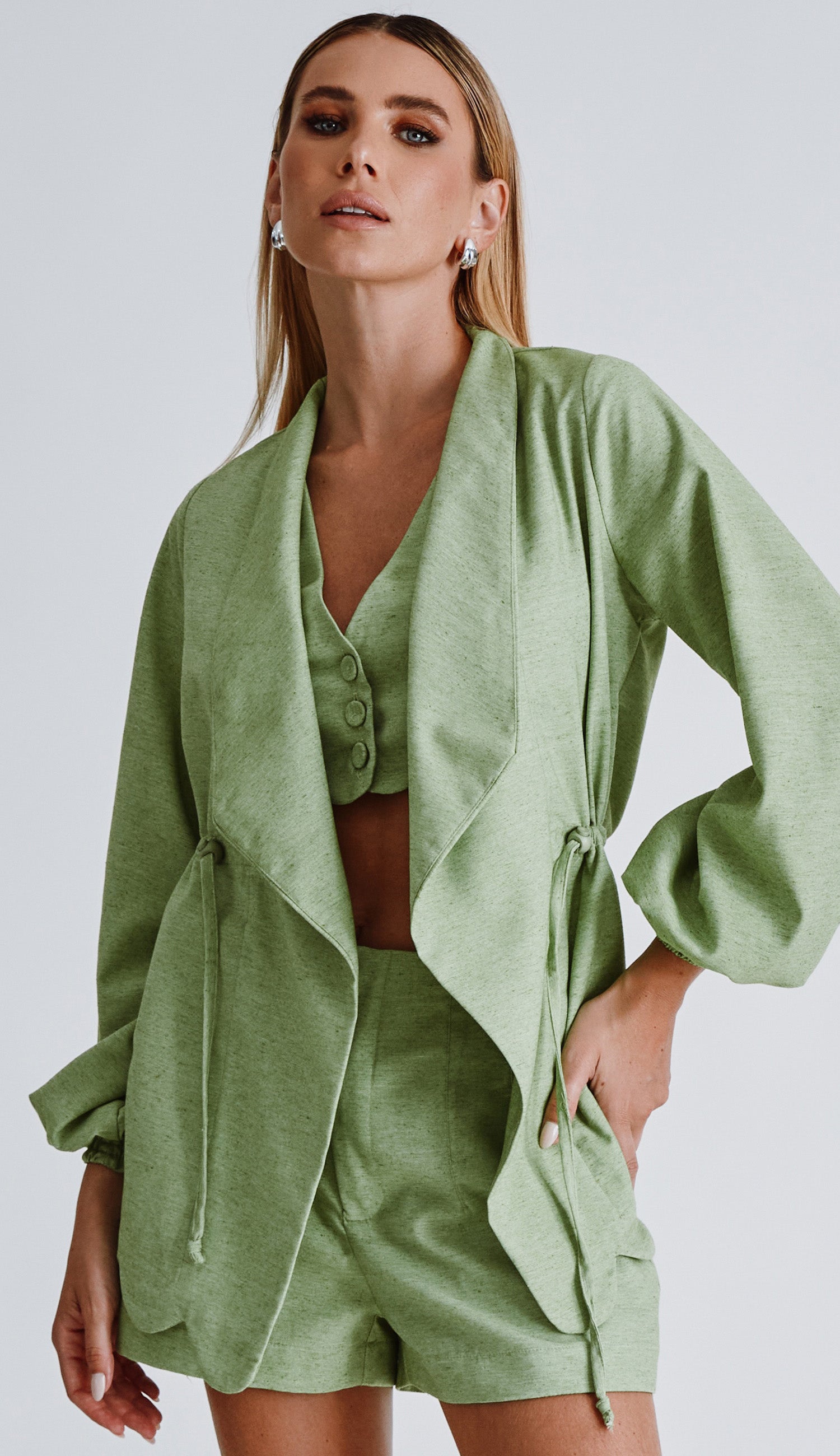 Trijunto confeccionado em linho revestido com padronagem rajada. O colete possui forro, decote em V com fechamento frontal por botões forrados, recortes verticais com detalhes em vivo e barra com recortes arredondados. O shorts possui forro, pregas, bolsos laterais e fechamento frontal por zíper. O casaco é aberto, possui modelagem alongada, ajuste na cintura por tira embutida com regulador, mangas longas com punho em lastex e lapela dobrada na gola.