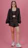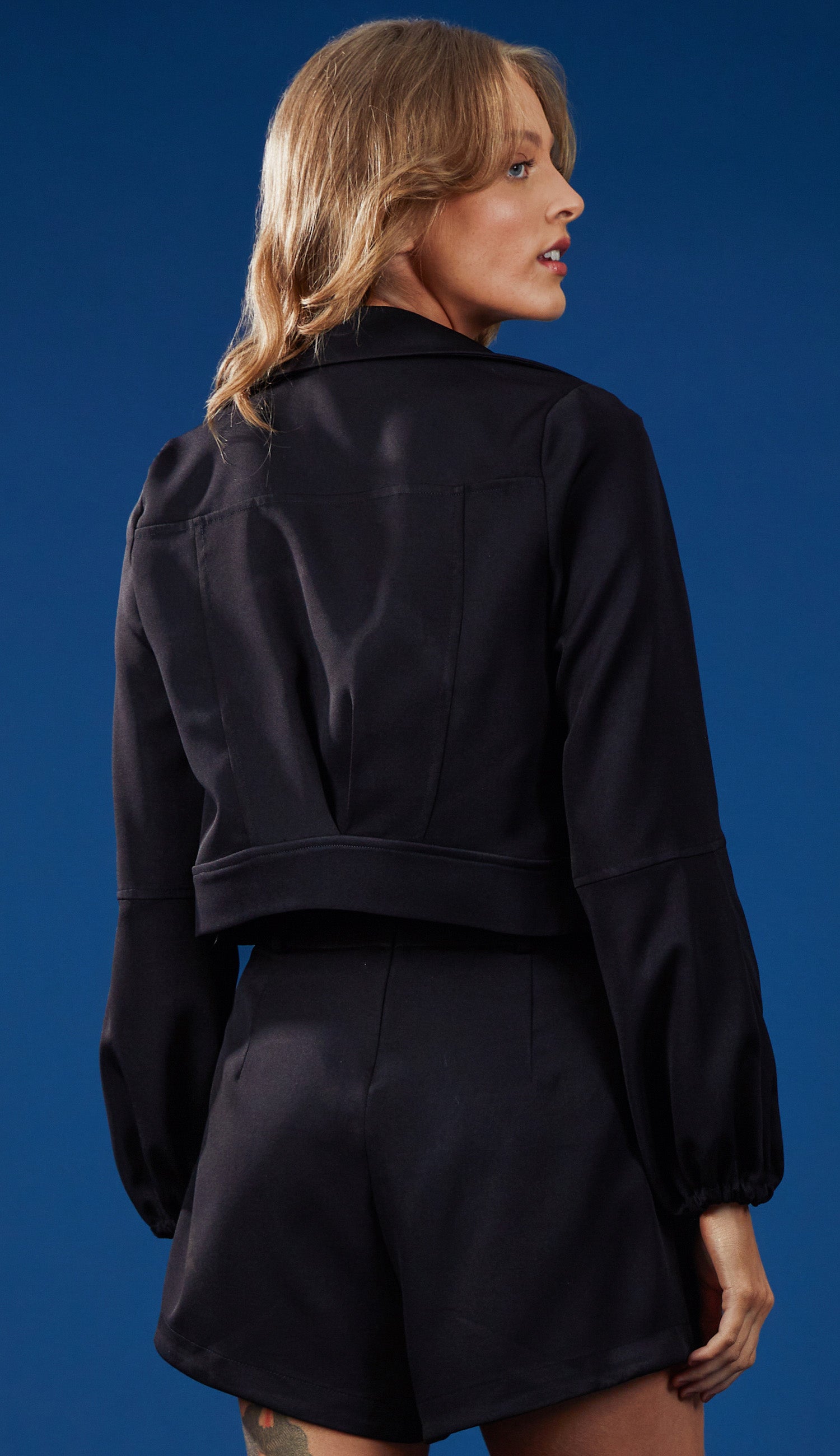Trijunto confeccionado em crepe de alfaiataria com elastano. O top é ajustado por recortes com elástico na alça costas, zíper de metal no fechamento e forro. A jaqueta possui manga bufante, preguinha nas costas e botão forrado. E o shorts com bolso na frente, conta com botões forrados e modelagem mais soltinha.