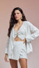 Trijunto com forro, confeccionado em poliviscose texturizado com aspecto de linho e efeito amassadinho. O colete possui decote em V, alças com elástico nas costas, recortes que modelam a peça, fechamento frontal por botõezinhos forrados e recorte geométrico na barra. O shorts saia possui modelagem soltinhas, fechamento lateral por zíper de metal com pingente que tem a conhcinha da Laguna gravada, bolsos traseiros e sobreposição assimétrica na frente. O blazer possui modelagem acinturada, decote em V, fechamento frontal por botões forrados, lapela dobrada na gola e mangas longas com martingale.