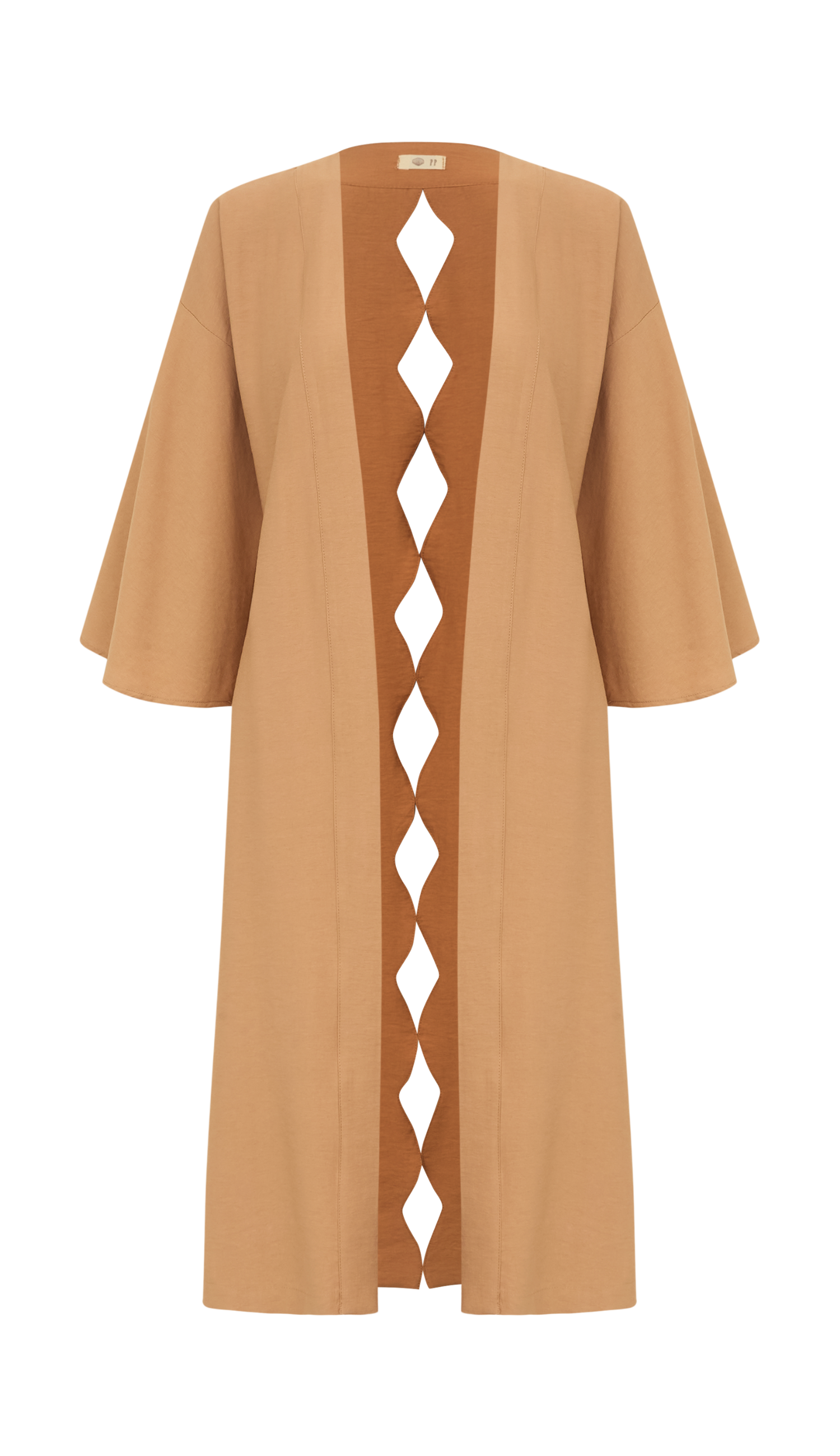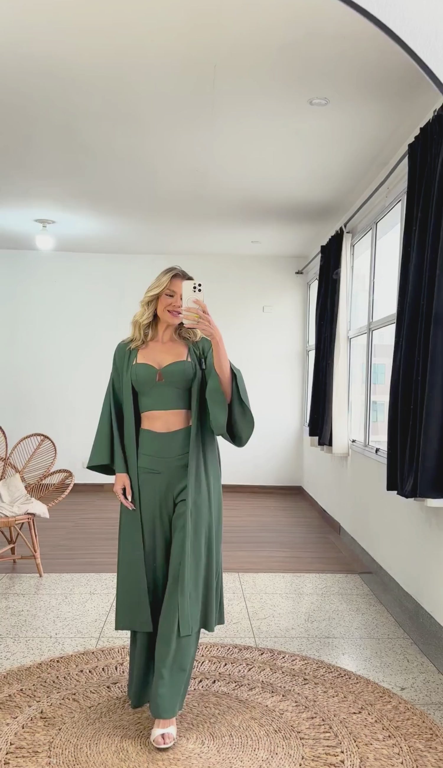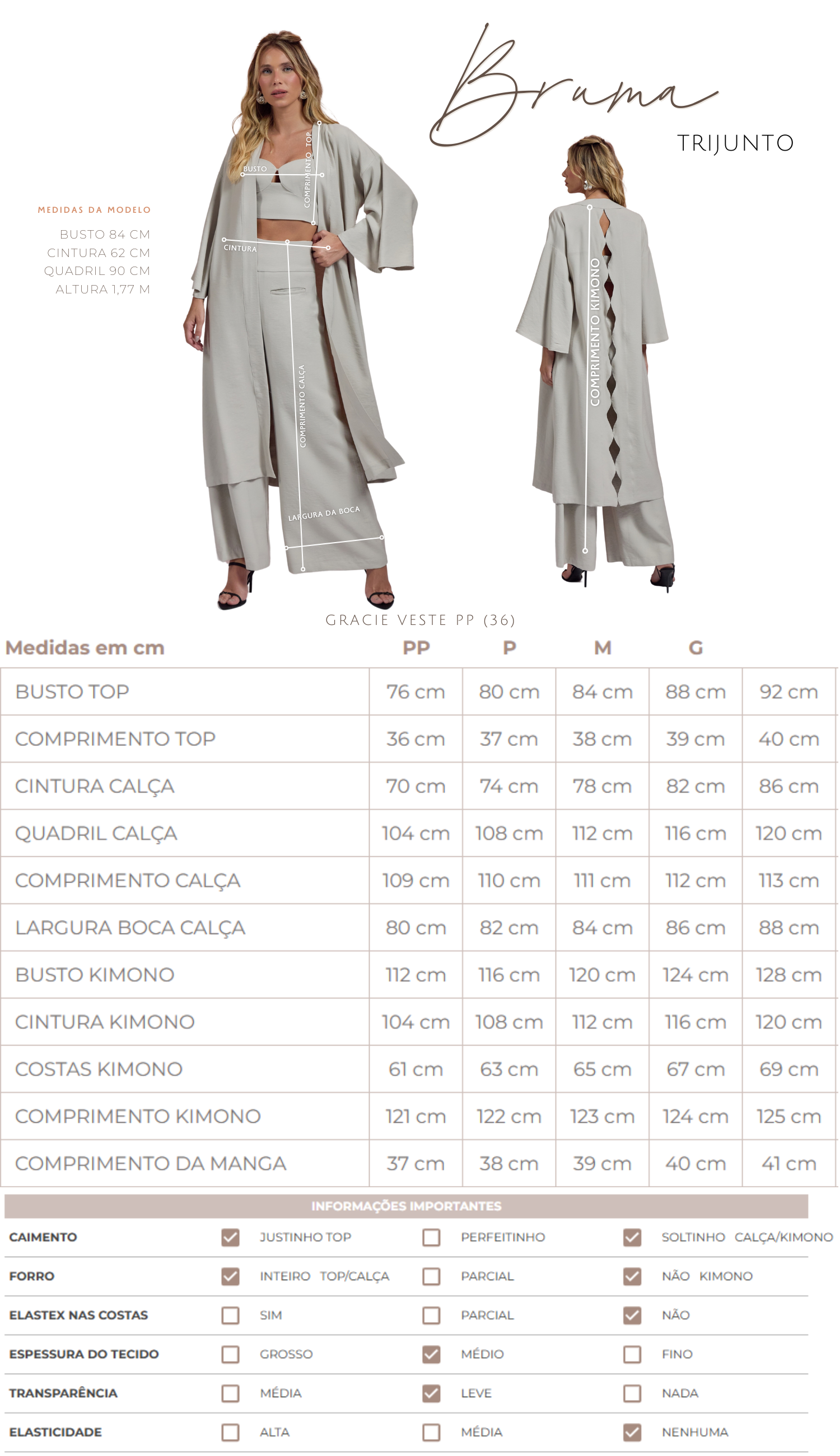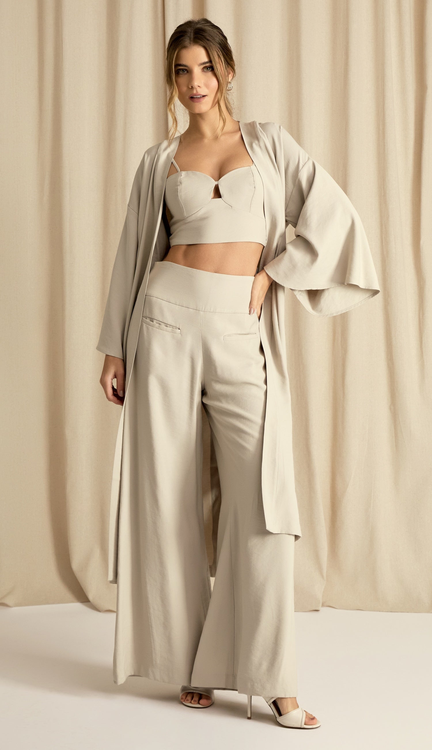 Trijunto confeccionado em sarja de alfaiataria em viscose mais encorpada. O top possui tecido duplo para não ficar transparente, decote coração com detalhe vazado no centro, recortes que modelam o busto, alcinhas reguláveis, pala logo abaixo do busto e fechamento traseiro por zíper de metal. A calça é pantalona e possui forro, pala larga no cós, bolsos frontais e fechamento lateral por zíper invisível. O kimono é aberto e longo, com modelagem ampla, mangas sino raglan longas e detalhe nas costas de recortes vazados geométricos que dão um charme especial à peça.