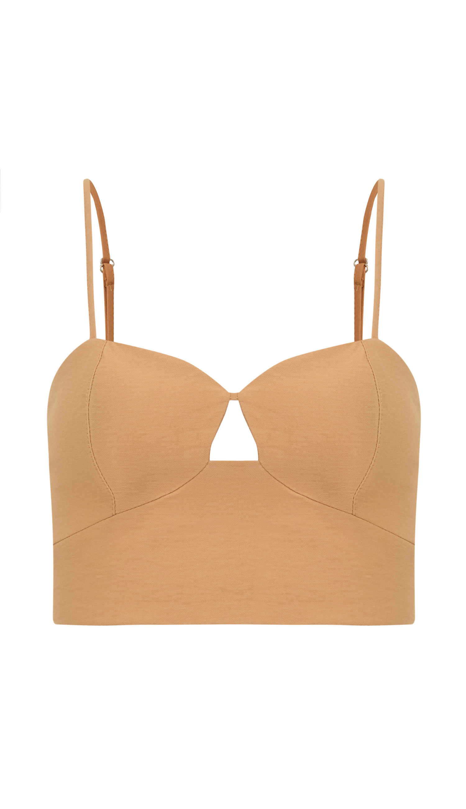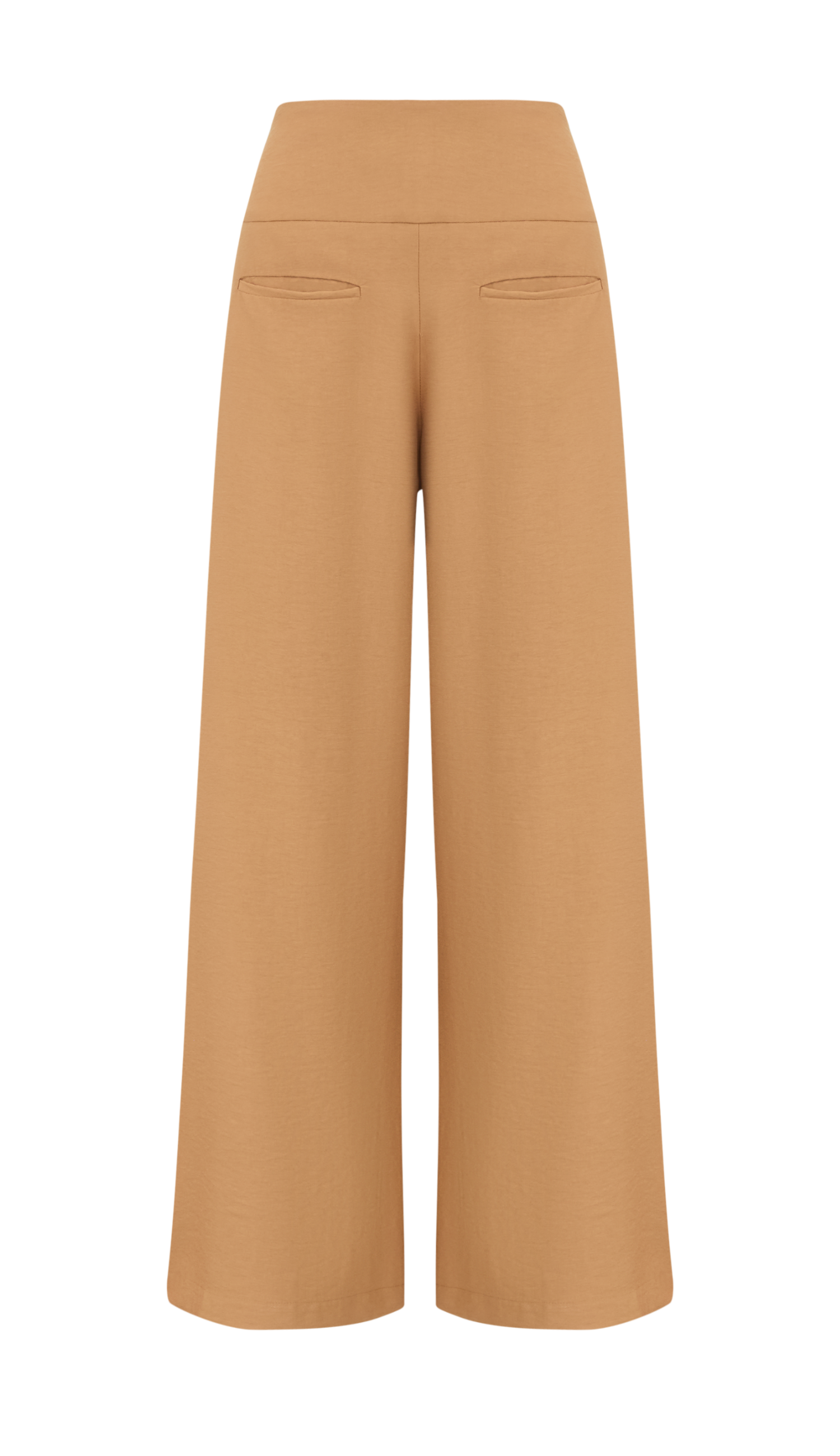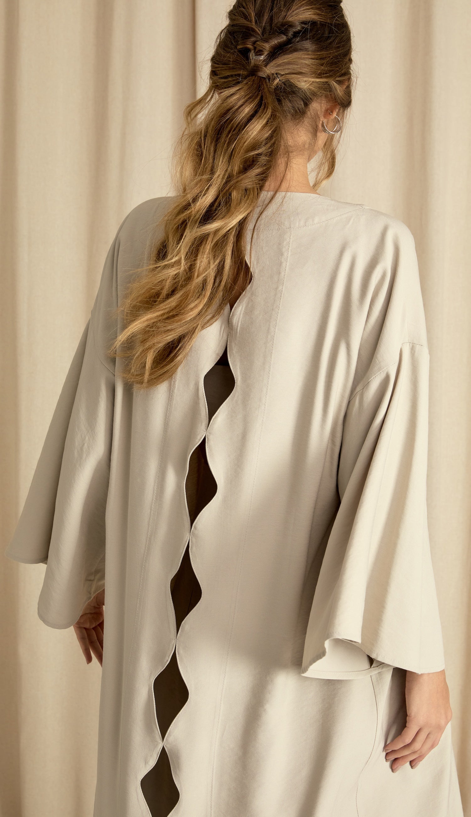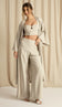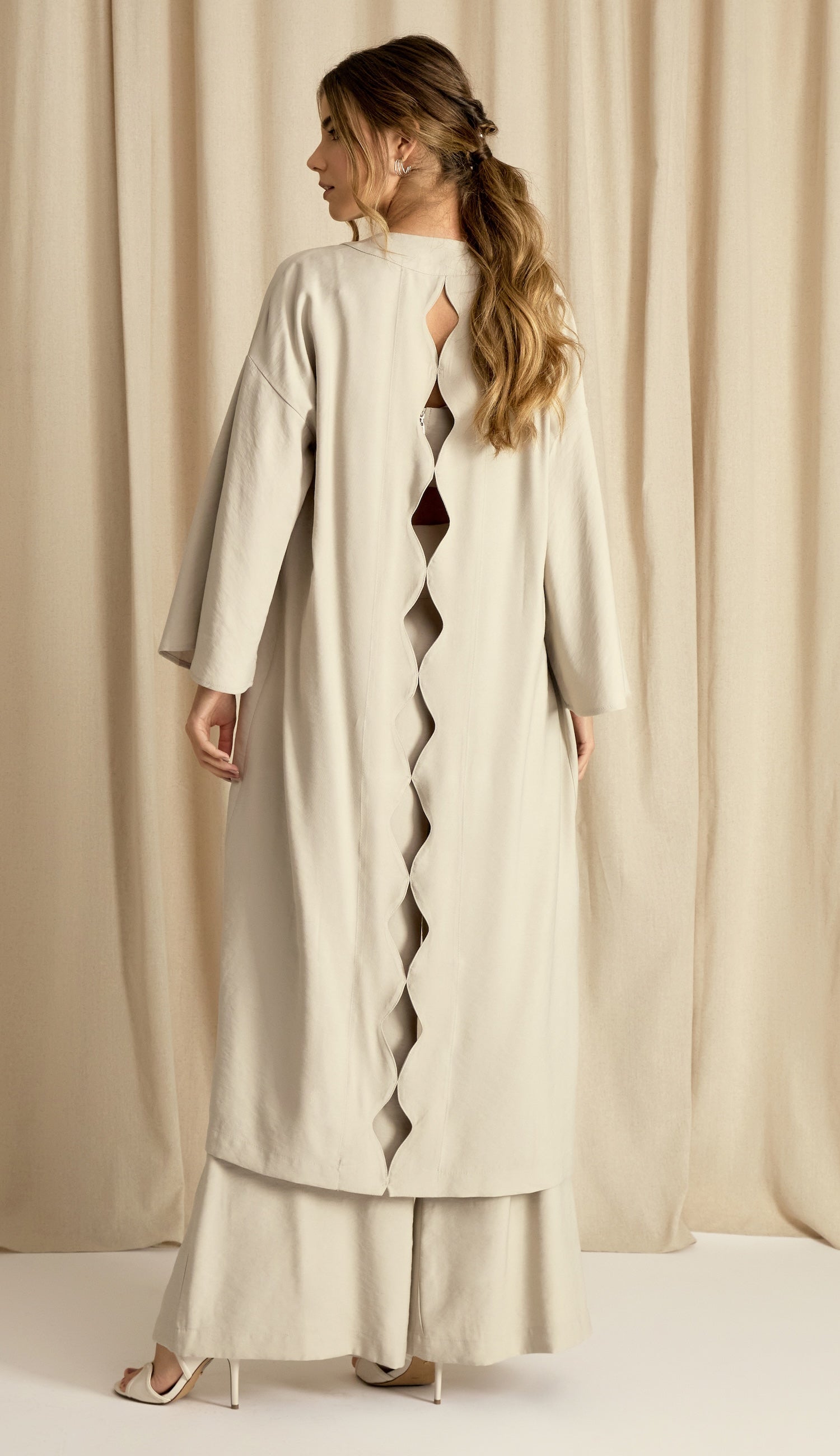 Trijunto confeccionado em sarja de alfaiataria em viscose mais encorpada. O top possui tecido duplo para não ficar transparente, decote coração com detalhe vazado no centro, recortes que modelam o busto, alcinhas reguláveis, pala logo abaixo do busto e fechamento traseiro por zíper de metal. A calça é pantalona e possui forro, pala larga no cós, bolsos frontais e fechamento lateral por zíper invisível. O kimono é aberto e longo, com modelagem ampla, mangas sino raglan longas e detalhe nas costas de recortes vazados geométricos que dão um charme especial à peça.