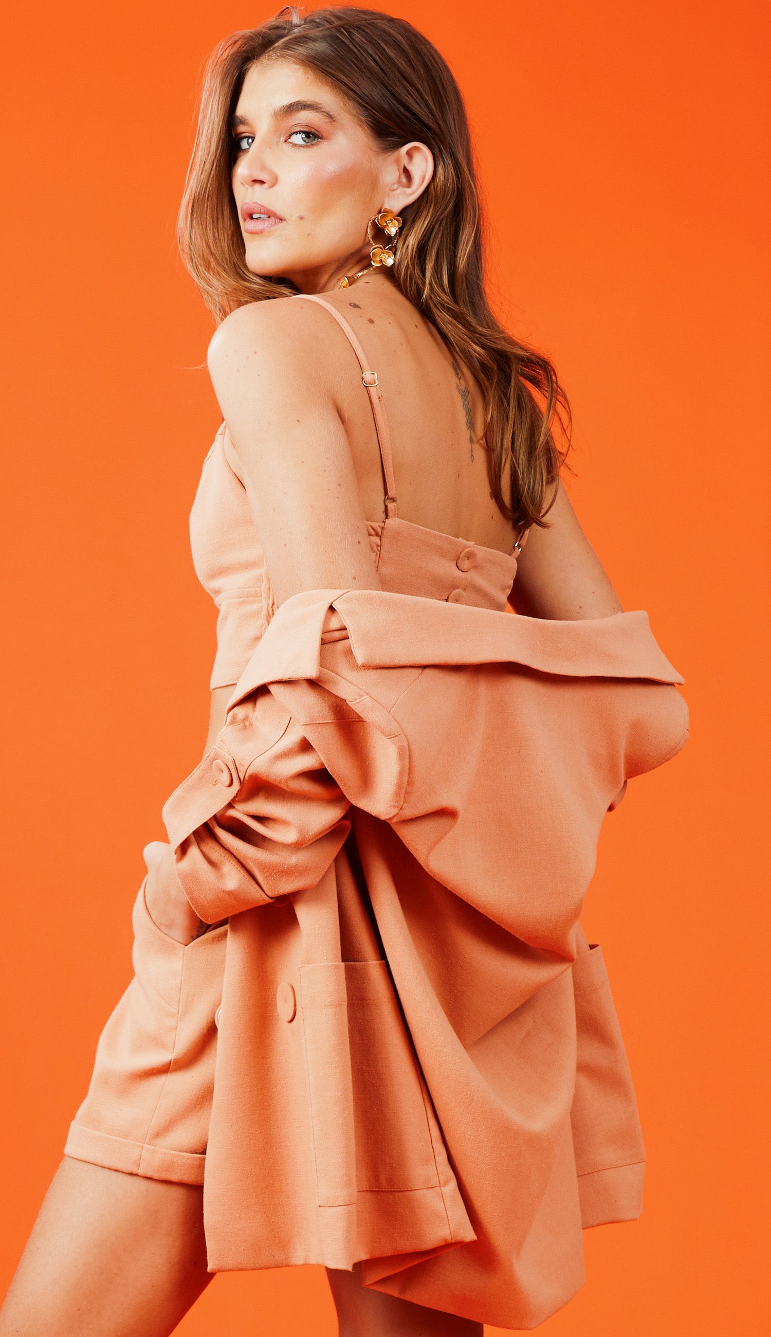 Trijunto confeccionado em linho com forro. O cropped possui alças finas reguláveis, recortes no busto para melhor ajuste e lastex e botões forrados nas costas. O blazer é oversized com a frente transpassada com 4 botões e o shorts é estilo alfaiataria com bolsos, botão forrado e barra dobrada. Despojado e com estilo praiano, nosso trijunto de linho é escolha certa para curtir os melhores momentos com a brisa do mar.