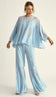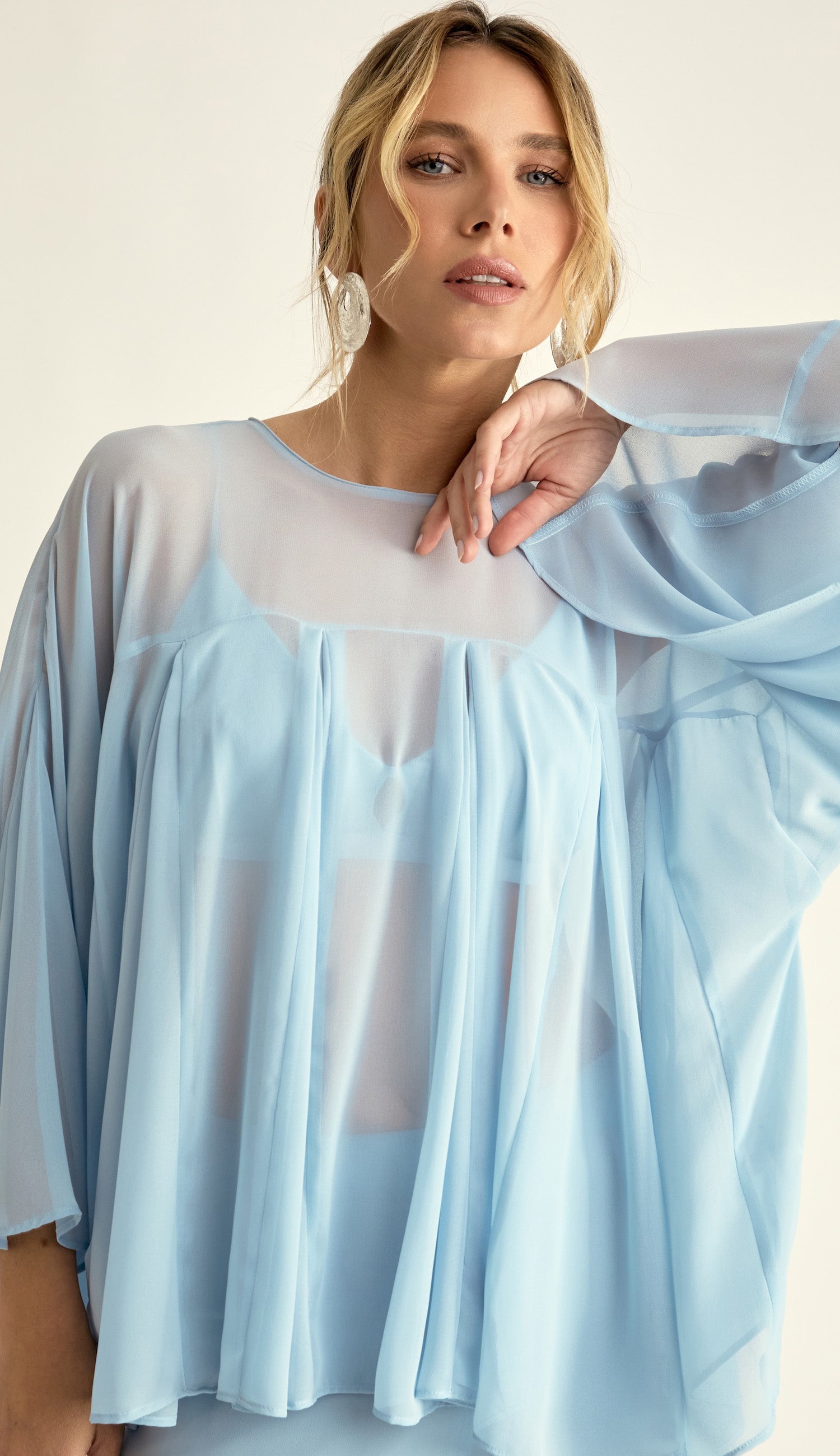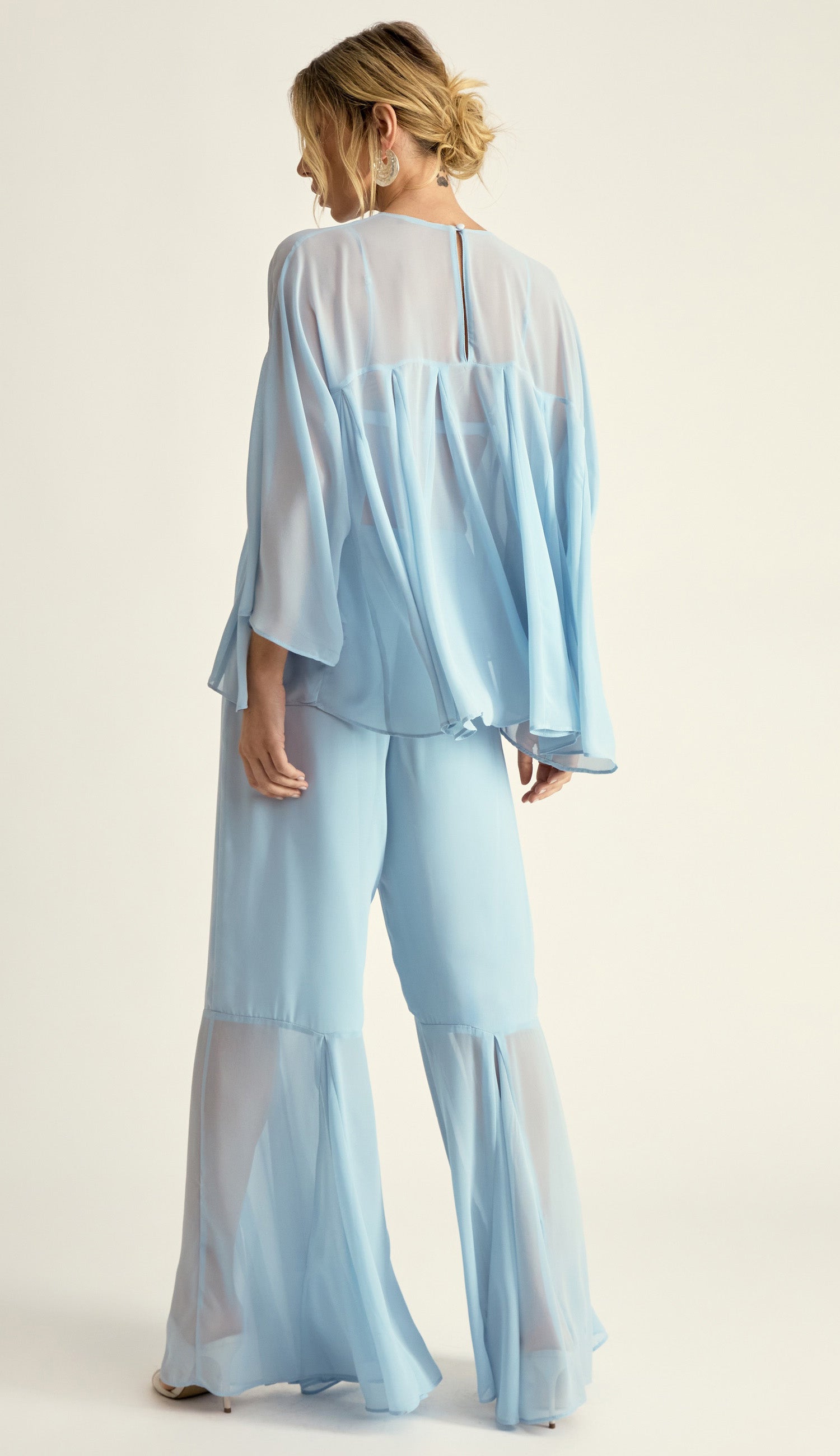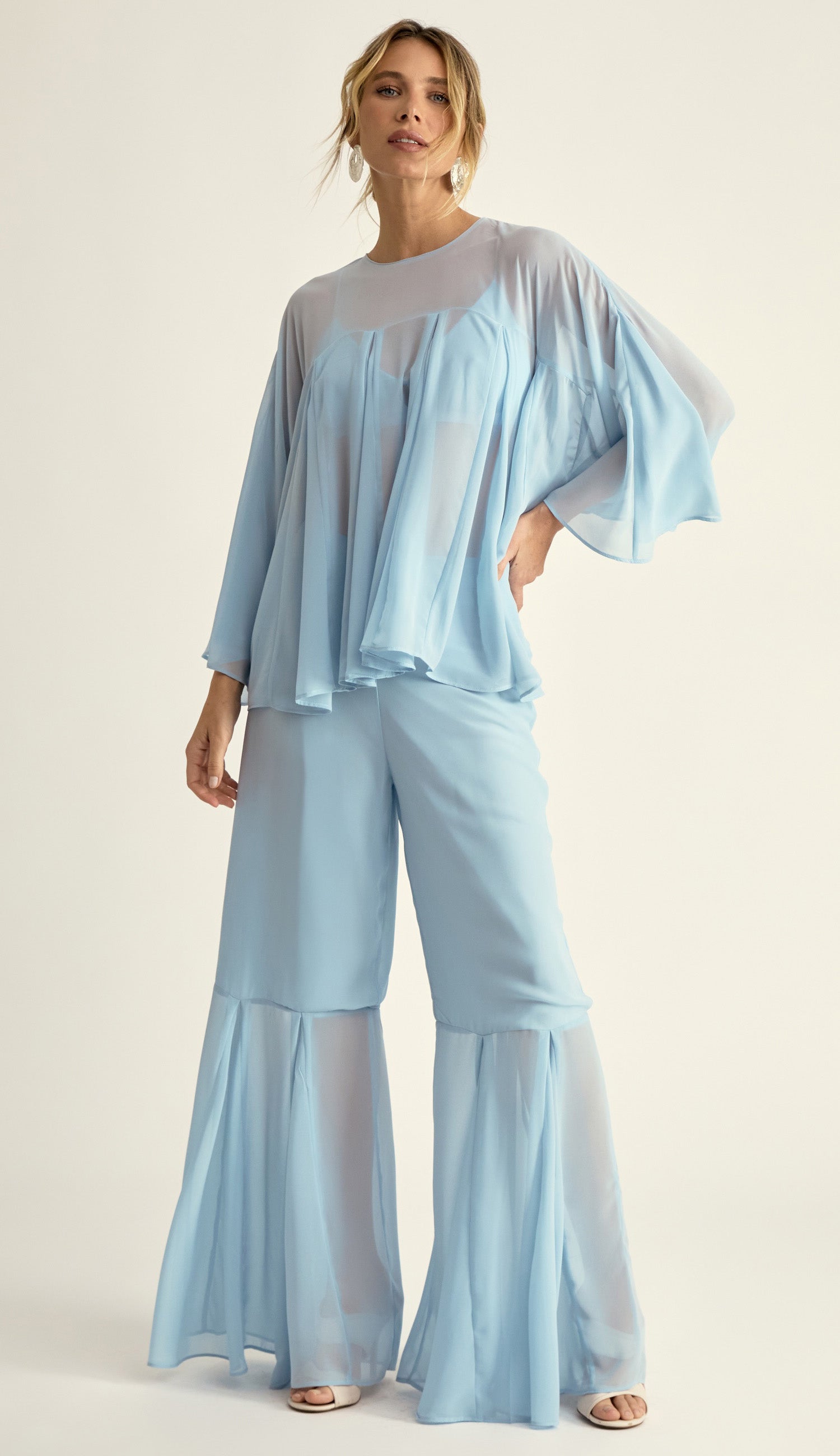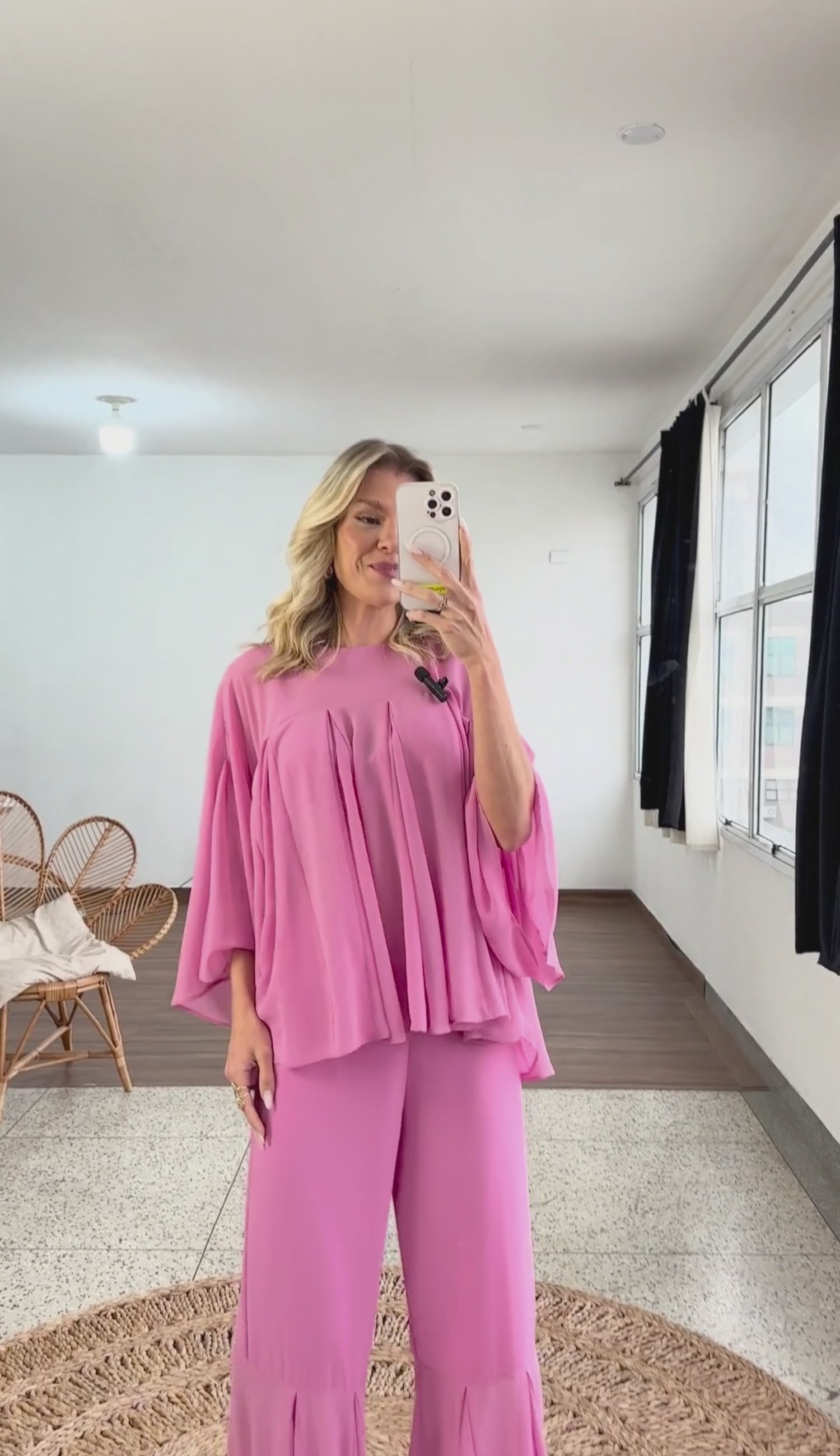 Conjunto confeccionado em crepe leve com transparência. A blusa é estilo bata, com modelagem bem ampla com recortes e nesgas que deixam a peça bem fluida; possui decote careca bem fechado, pala na região do colo do busto, mangas morcego 7/8 bem amplas e fechamento na nuca por botão esmaltado. O top por baixo da blusa é no estilo biquíni e possui forro, decote em V, alcinhas reguláveis e elástico logo abaixo do busto com regulador de metal nas costas para ajuste e fechamento. A calça é pantalona e possui forro, fechamento lateral por zíper invisível e recorte na altura da panturrilha com o mesmo detalhe de nesgas, deixando a barra bem ampla e sem forro nessa região, o que cria um visual de transparência nas pernas bem charmoso.