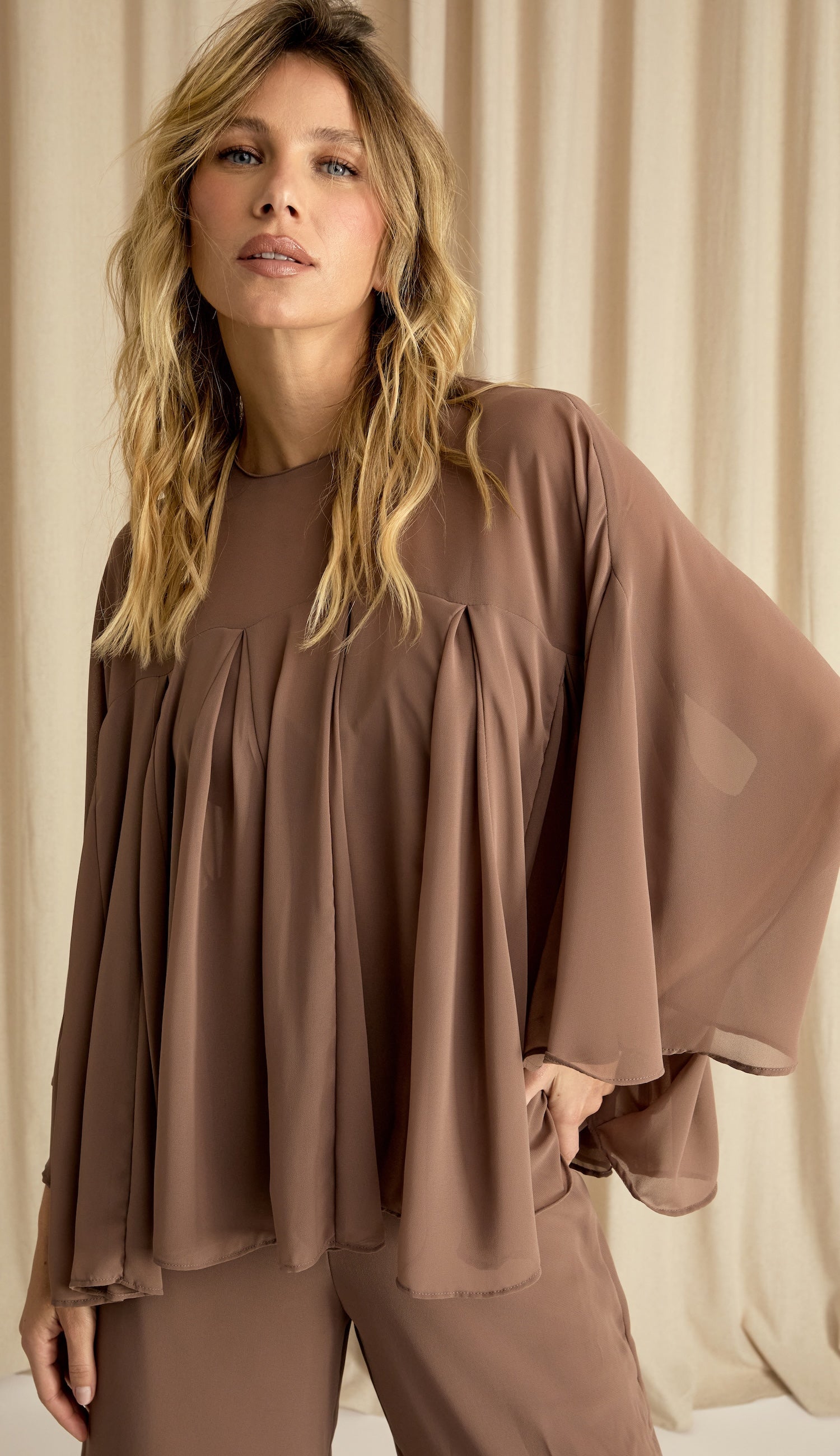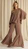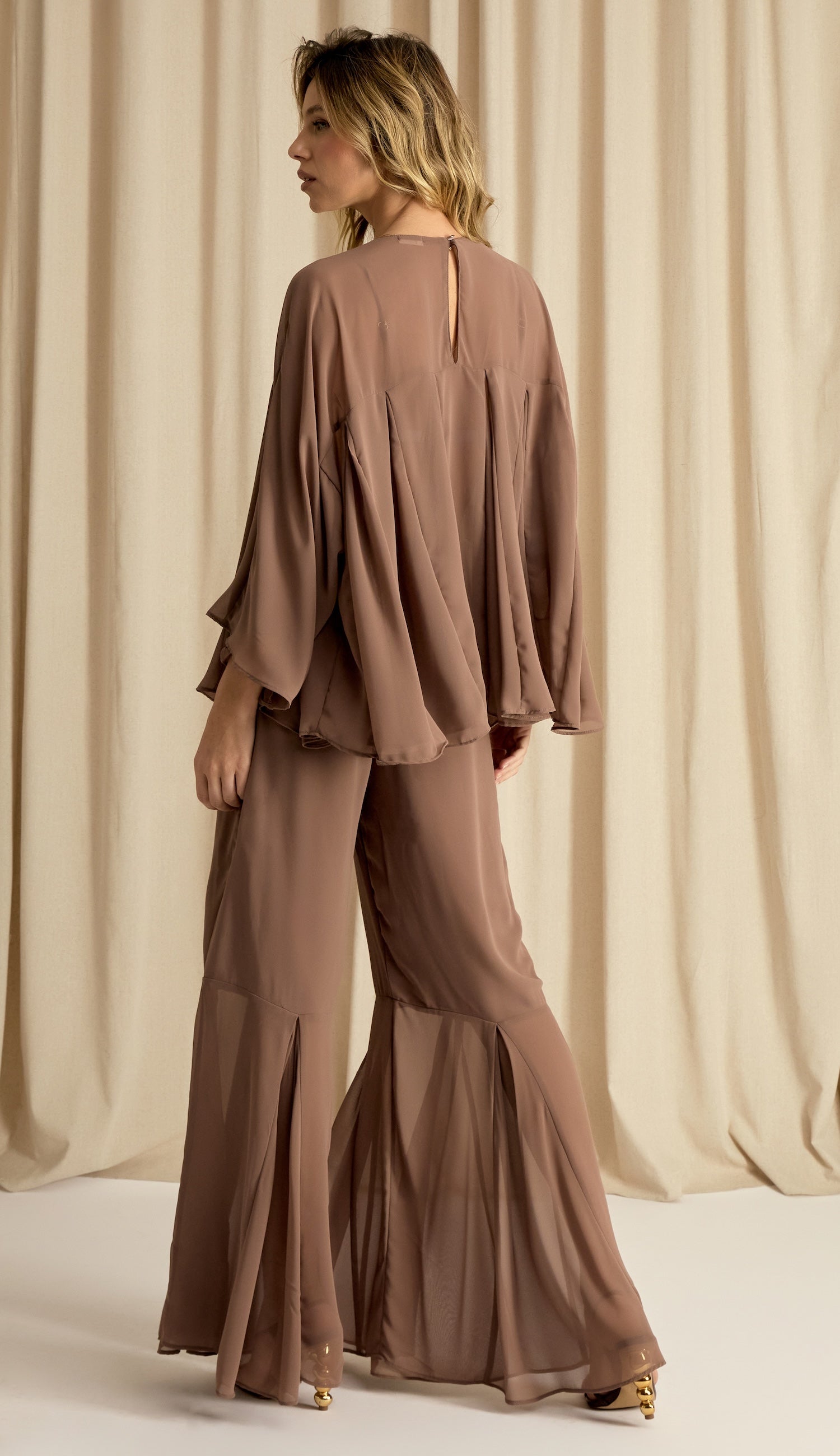 Conjunto confeccionado em crepe leve com transparência. A blusa é estilo bata, com modelagem bem ampla com recortes e nesgas que deixam a peça bem fluida; possui decote careca bem fechado, pala na região do colo do busto, mangas morcego 7/8 bem amplas e fechamento na nuca por botão esmaltado. O top por baixo da blusa é no estilo biquíni e possui forro, decote em V, alcinhas reguláveis e elástico logo abaixo do busto com regulador de metal nas costas para ajuste e fechamento. A calça é pantalona e possui forro, fechamento lateral por zíper invisível e recorte na altura da panturrilha com o mesmo detalhe de nesgas, deixando a barra bem ampla e sem forro nessa região, o que cria um visual de transparência nas pernas bem charmoso.