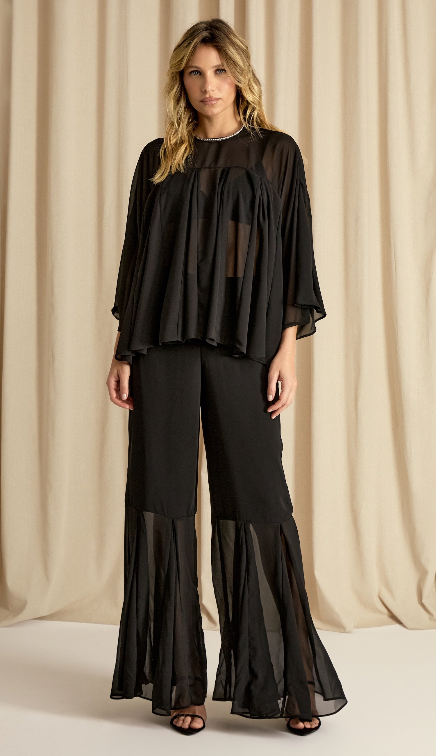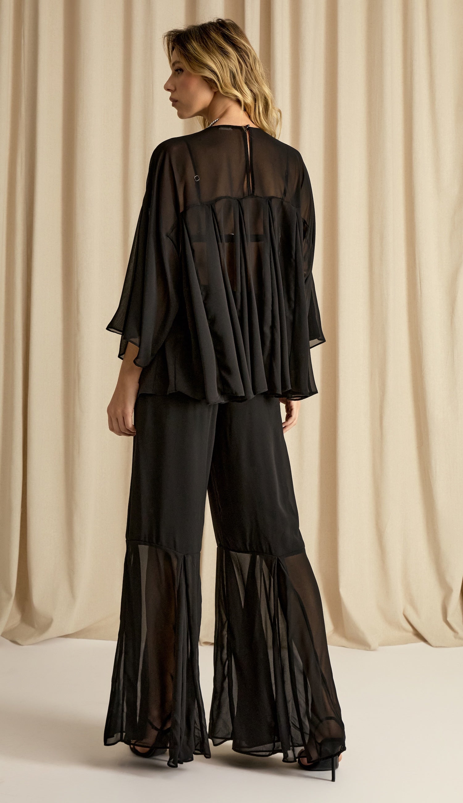 Conjunto confeccionado em crepe leve com transparência. A blusa é estilo bata, com modelagem bem ampla com recortes e nesgas que deixam a peça bem fluida; possui decote careca bem fechado, pala na região do colo do busto, mangas morcego 7/8 bem amplas e fechamento na nuca por botão esmaltado. O top por baixo da blusa é no estilo biquíni e possui forro, decote em V, alcinhas reguláveis e elástico logo abaixo do busto com regulador de metal nas costas para ajuste e fechamento. A calça é pantalona e possui forro, fechamento lateral por zíper invisível e recorte na altura da panturrilha com o mesmo detalhe de nesgas, deixando a barra bem ampla e sem forro nessa região, o que cria um visual de transparência nas pernas bem charmoso.