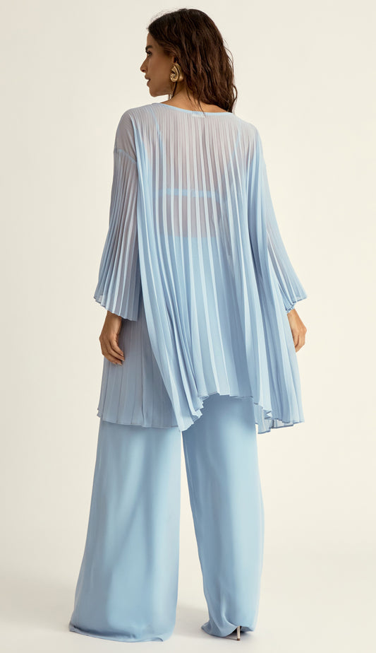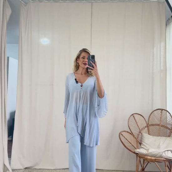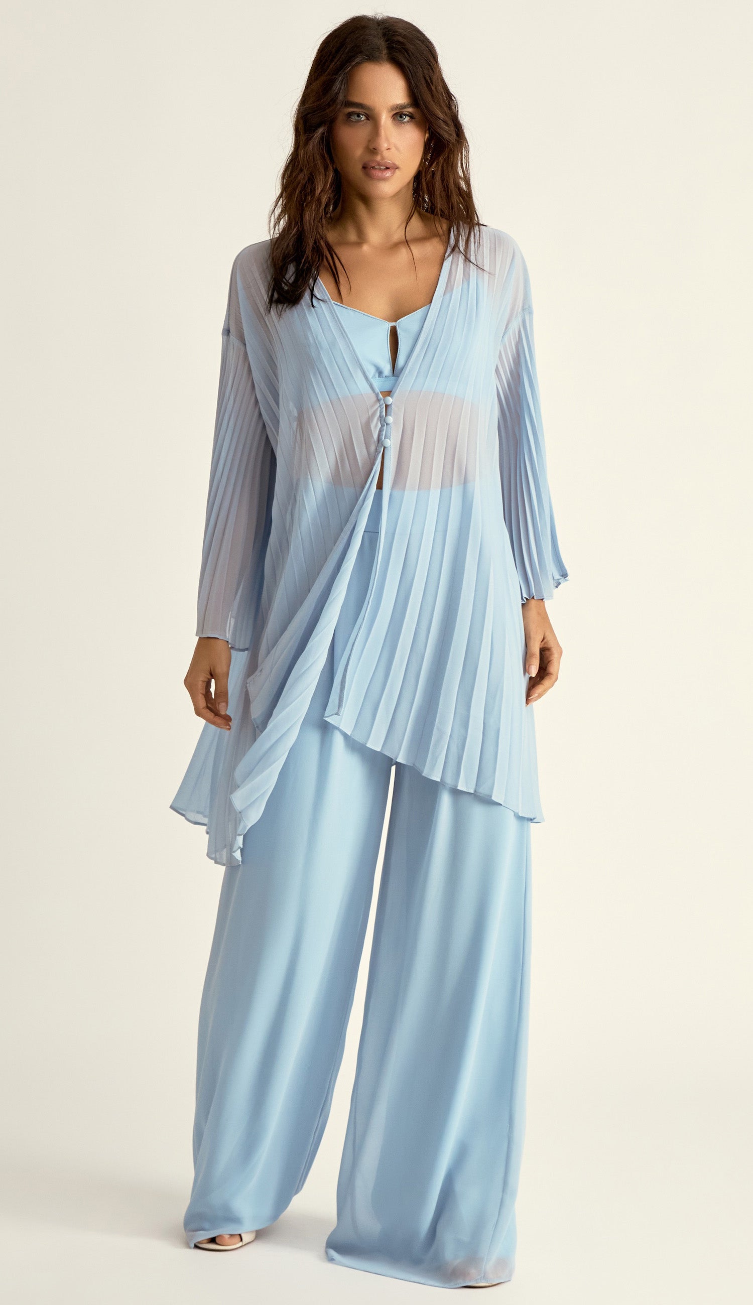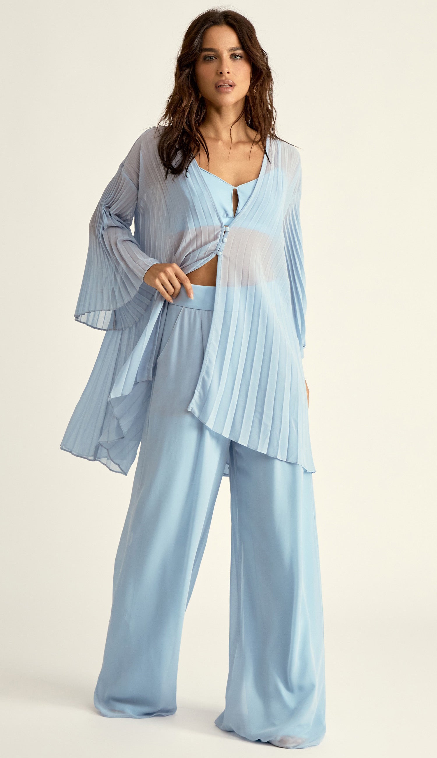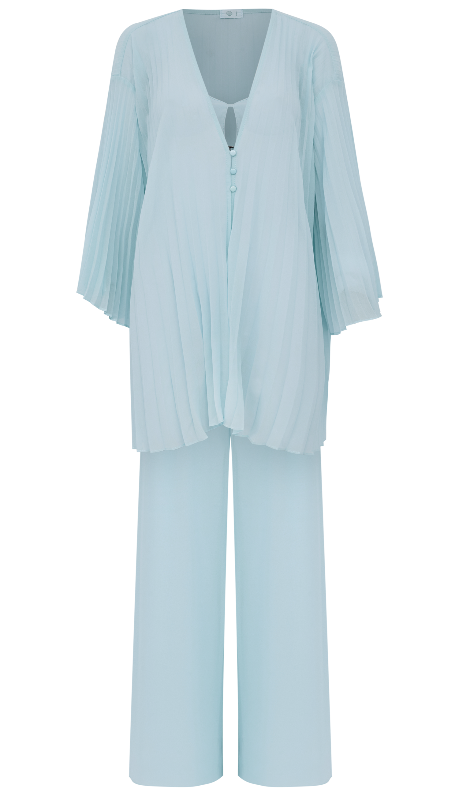 Trijunto confeccionado em crepe. O top possui forro, decote redondo, alcinhas reguláveis, elástico com franzidinhos logo abaixo do busto e fechamento traseiro por gancho de metal. A calça é pantalona e possui forro, fechamento lateral por zíper invisível e pregas frontais. O kimono é todo plissado e possui modelagem alongada e ampla, mangas sino 7/8 e fechamento frontal por botões esmaltados.
