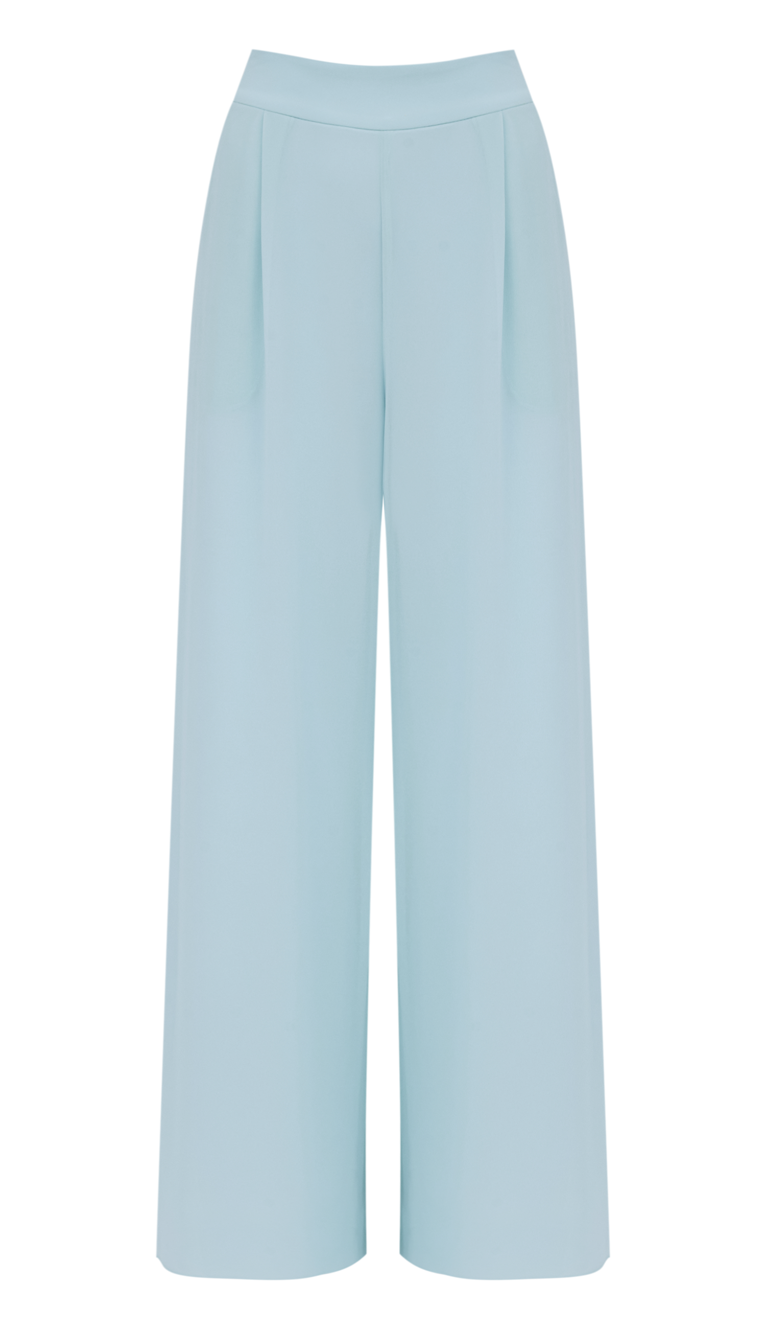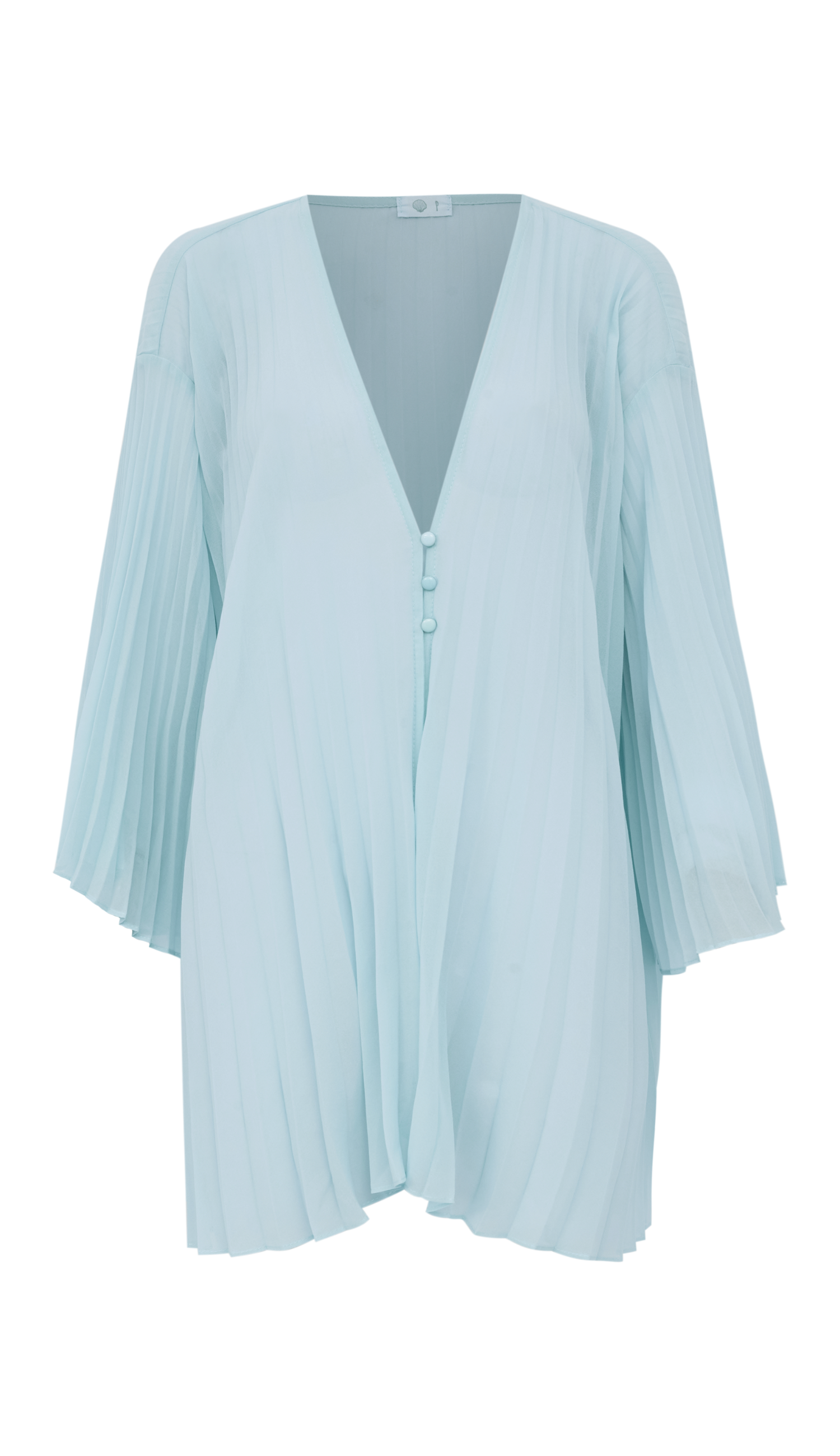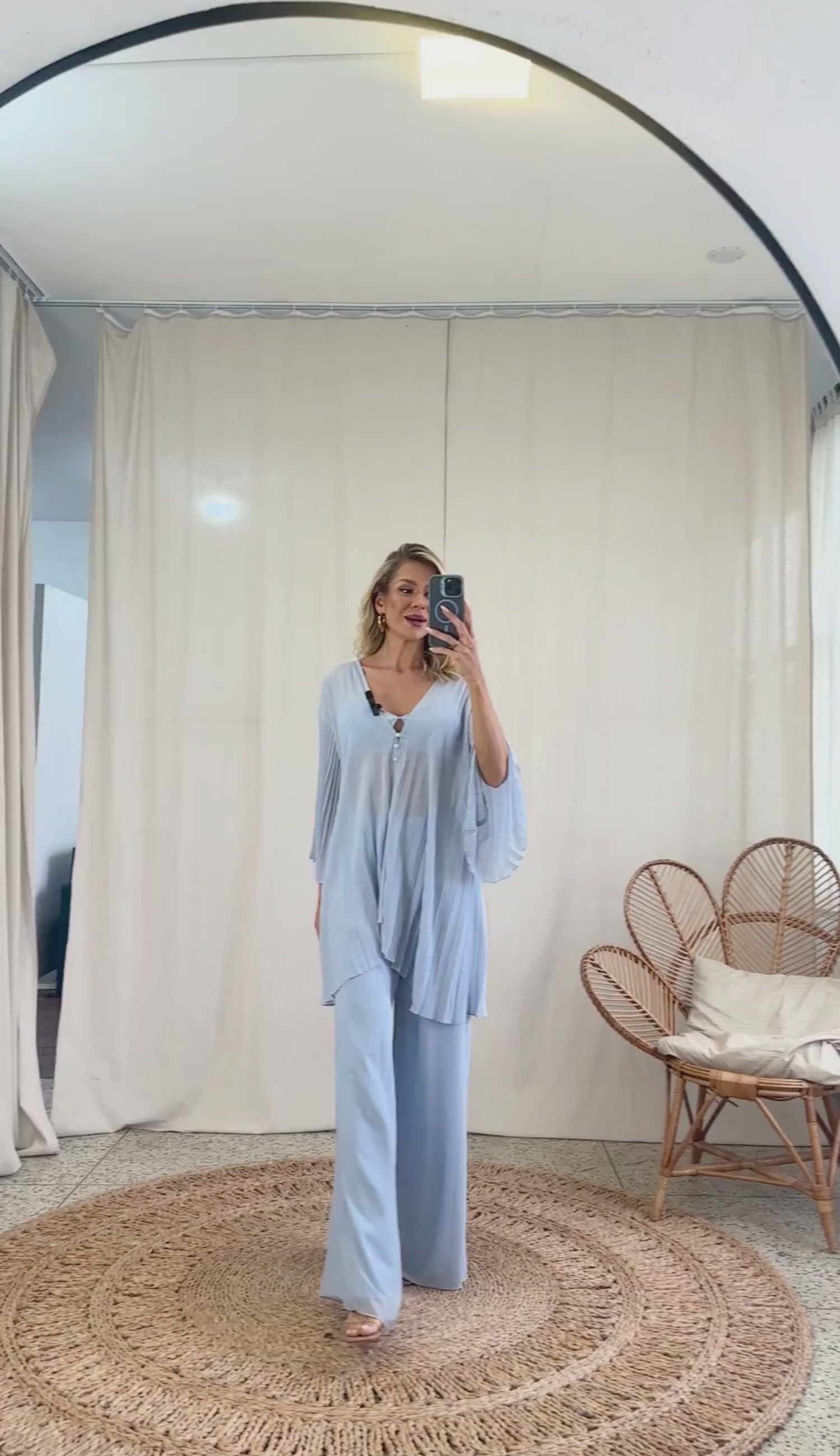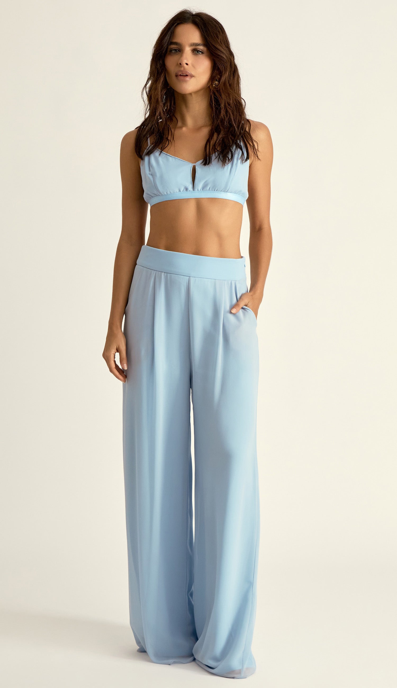 Trijunto confeccionado em crepe. O top possui forro, decote redondo, alcinhas reguláveis, elástico com franzidinhos logo abaixo do busto e fechamento traseiro por gancho de metal. A calça é pantalona e possui forro, fechamento lateral por zíper invisível e pregas frontais. O kimono é todo plissado e possui modelagem alongada e ampla, mangas sino 7/8 e fechamento frontal por botões esmaltados.
