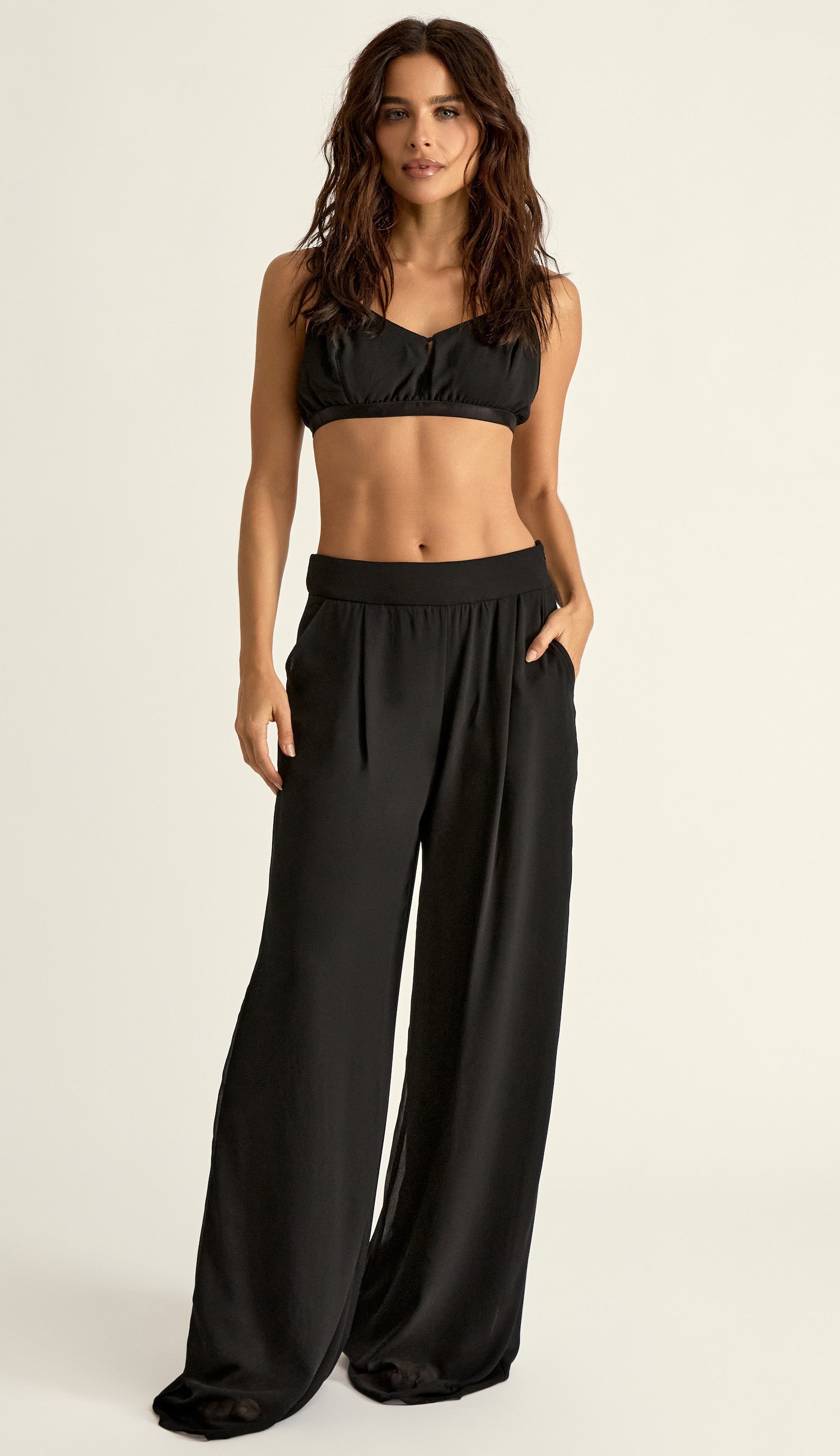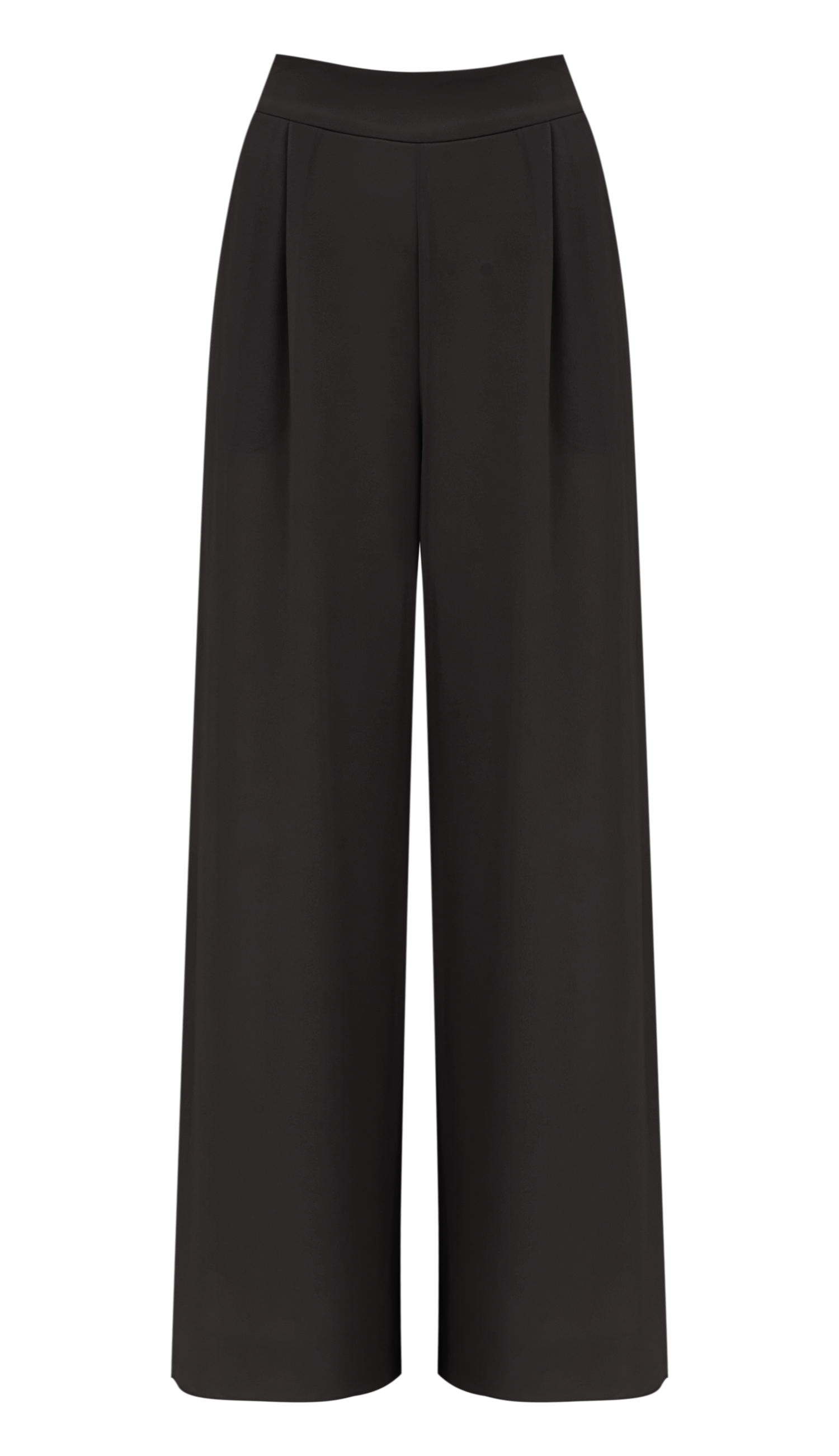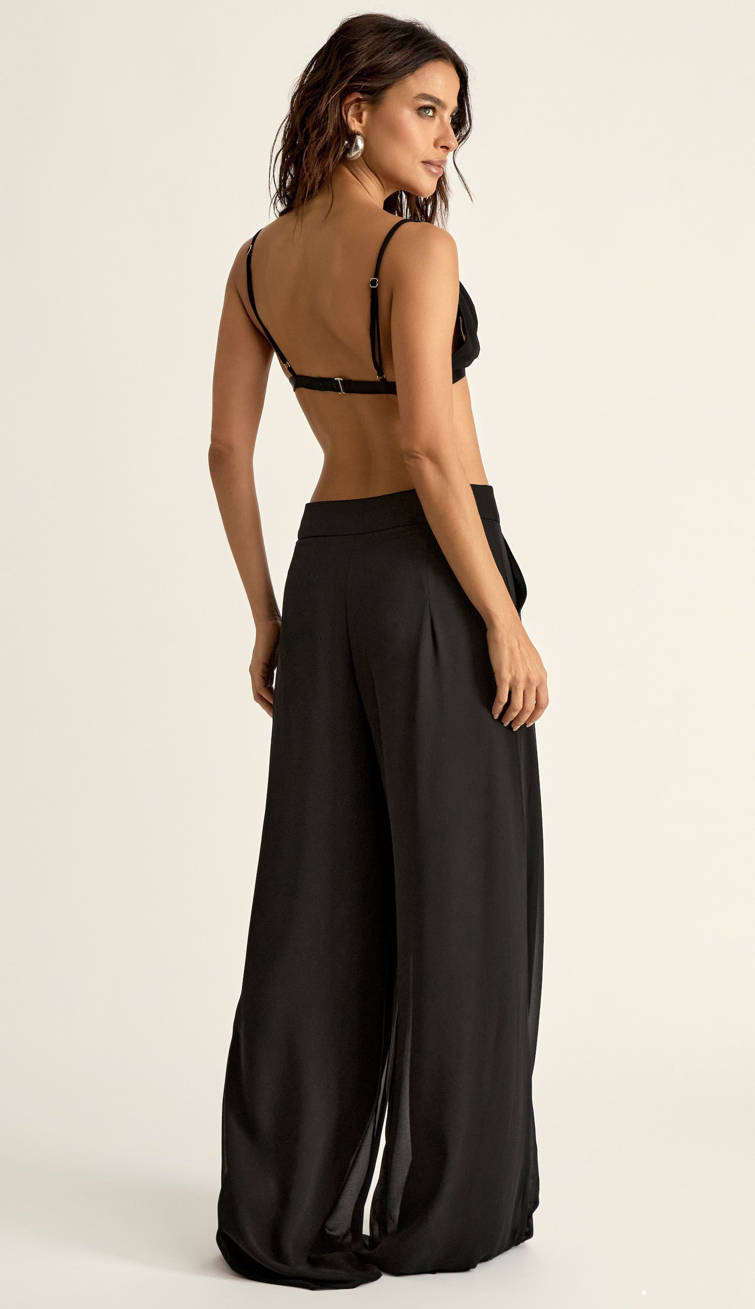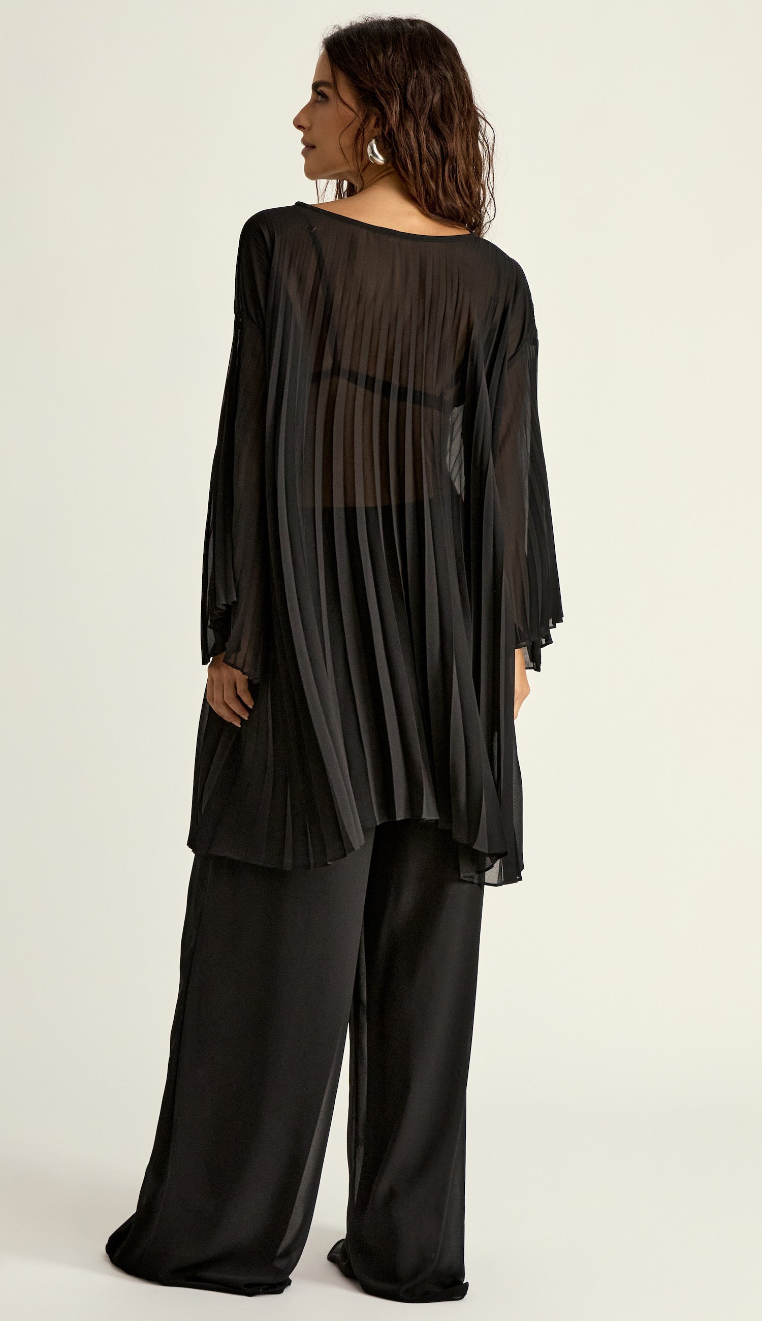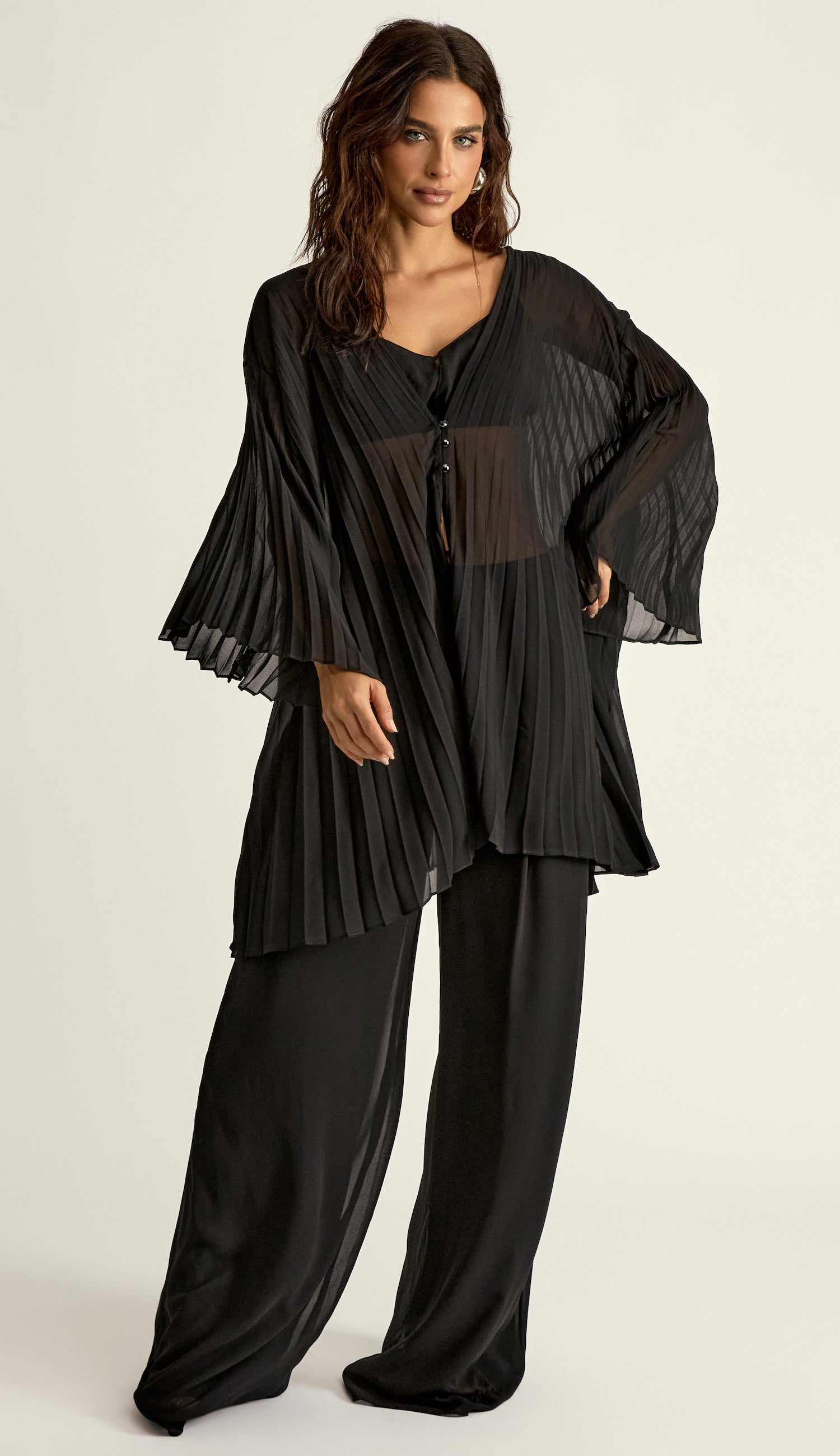 Trijunto confeccionado em crepe. O top possui forro, decote redondo, alcinhas reguláveis, elástico com franzidinhos logo abaixo do busto e fechamento traseiro por gancho de metal. A calça é pantalona e possui forro, fechamento lateral por zíper invisível e pregas frontais. O kimono é todo plissado e possui modelagem alongada e ampla, mangas sino 7/8 e fechamento frontal por botões esmaltados.