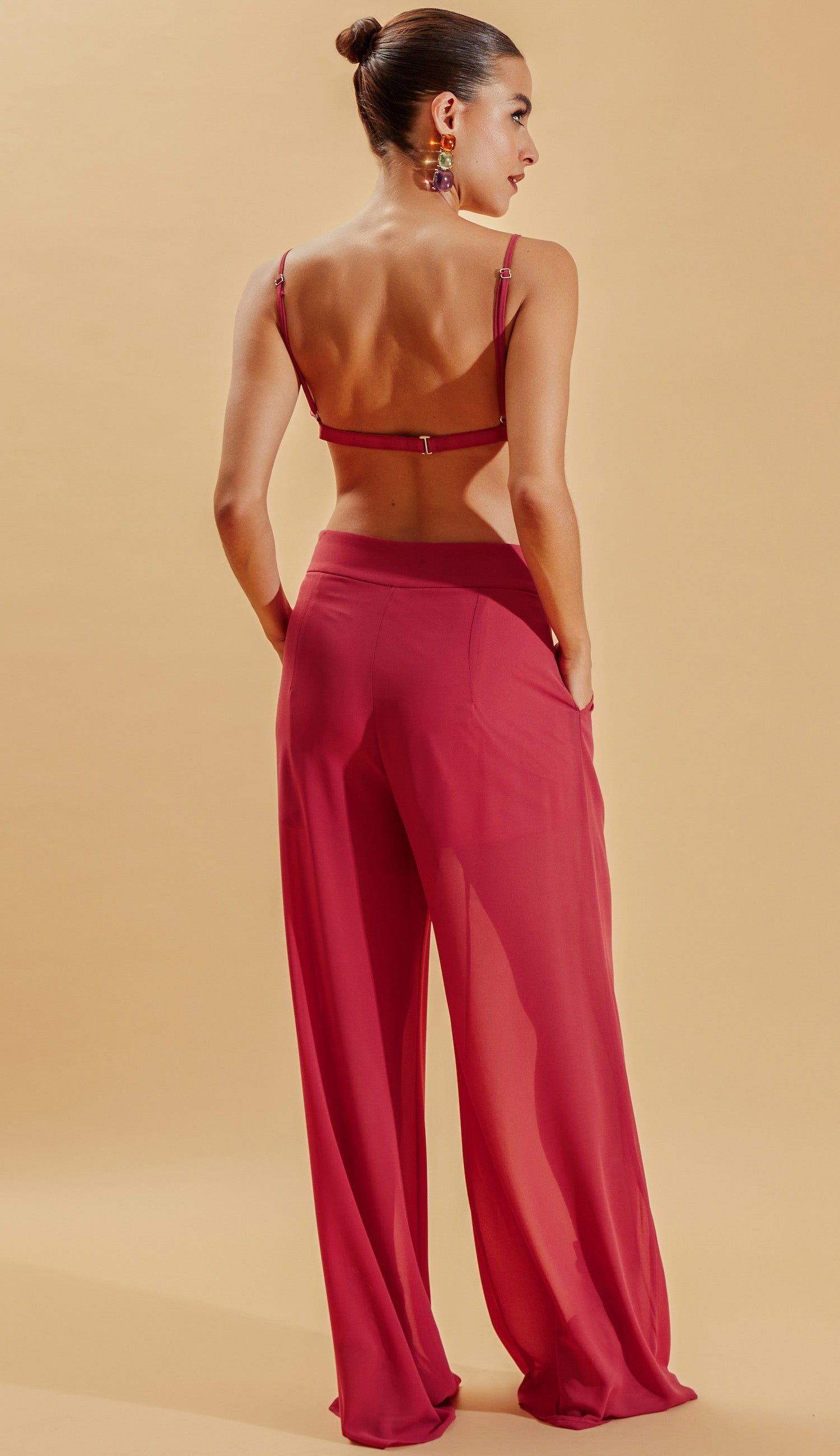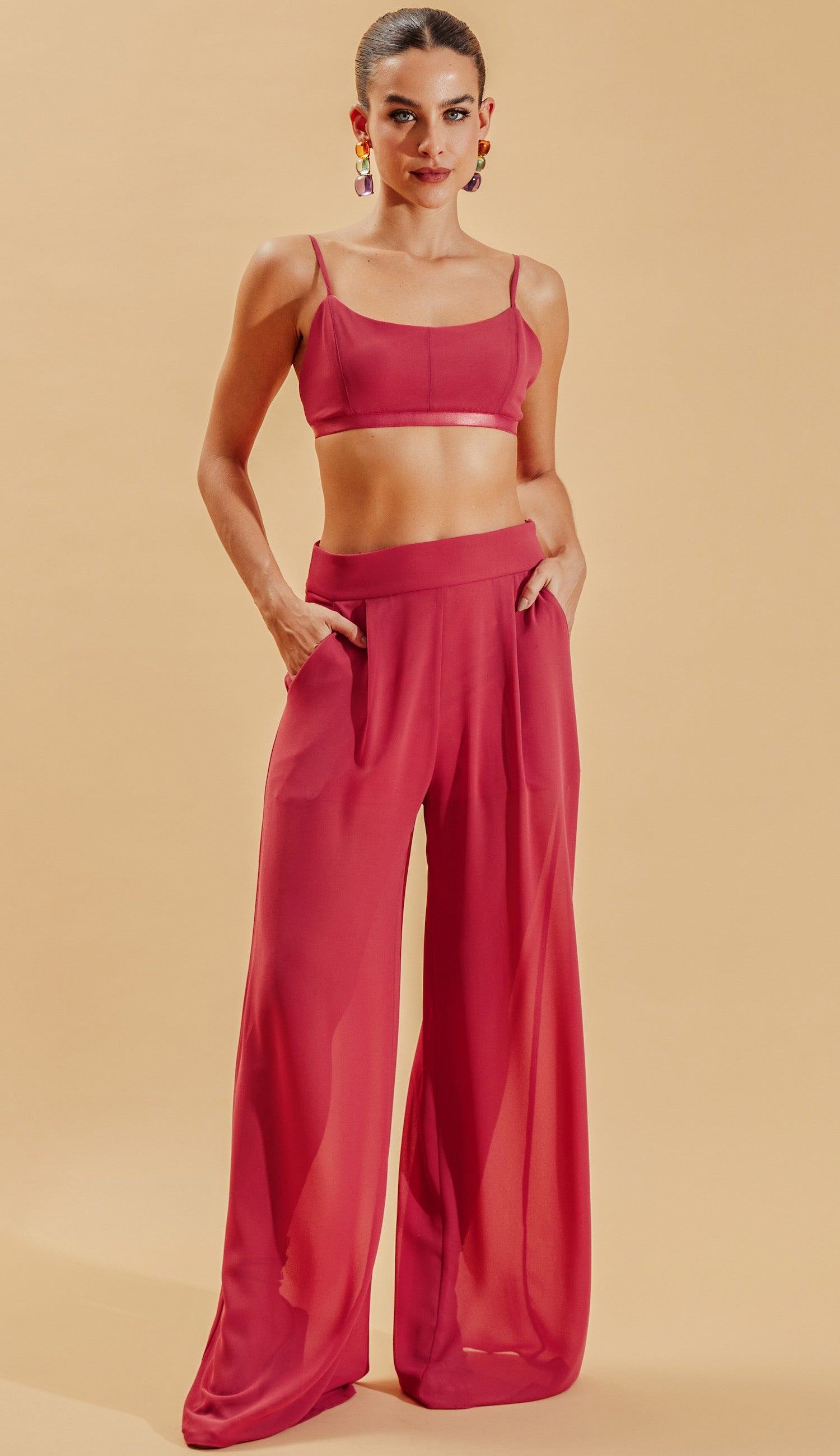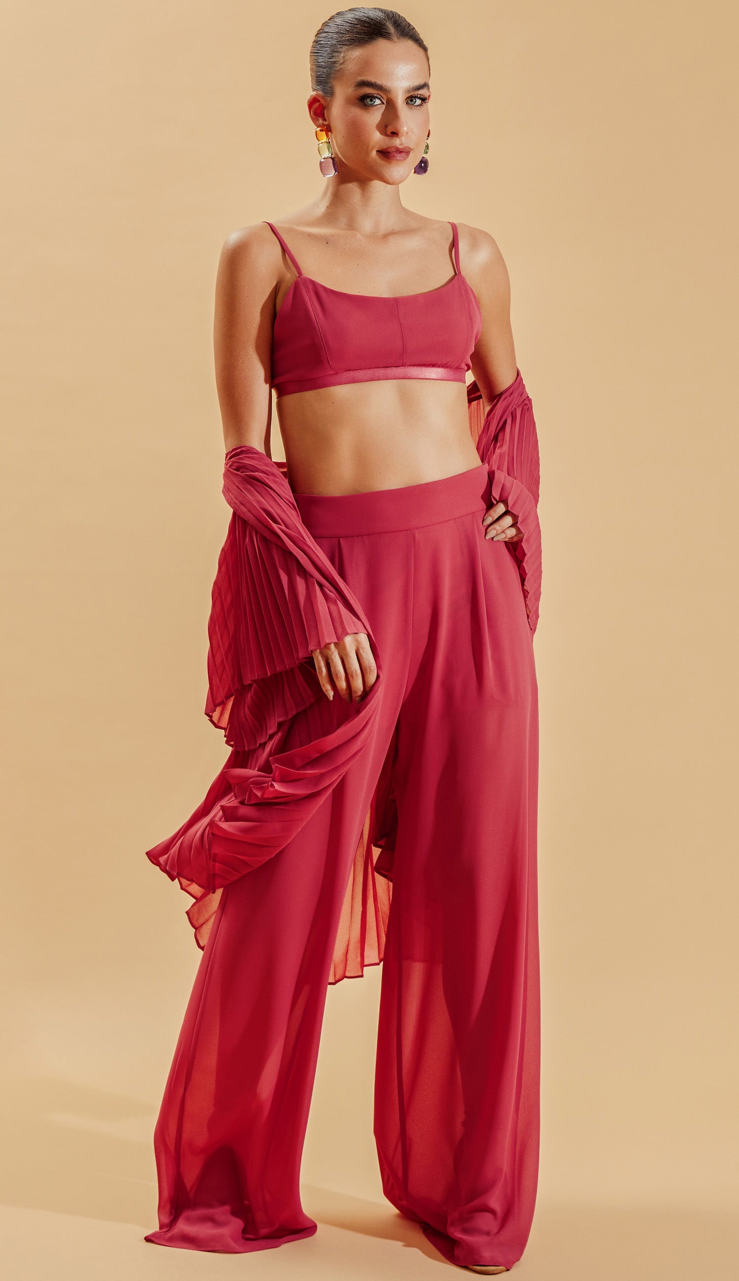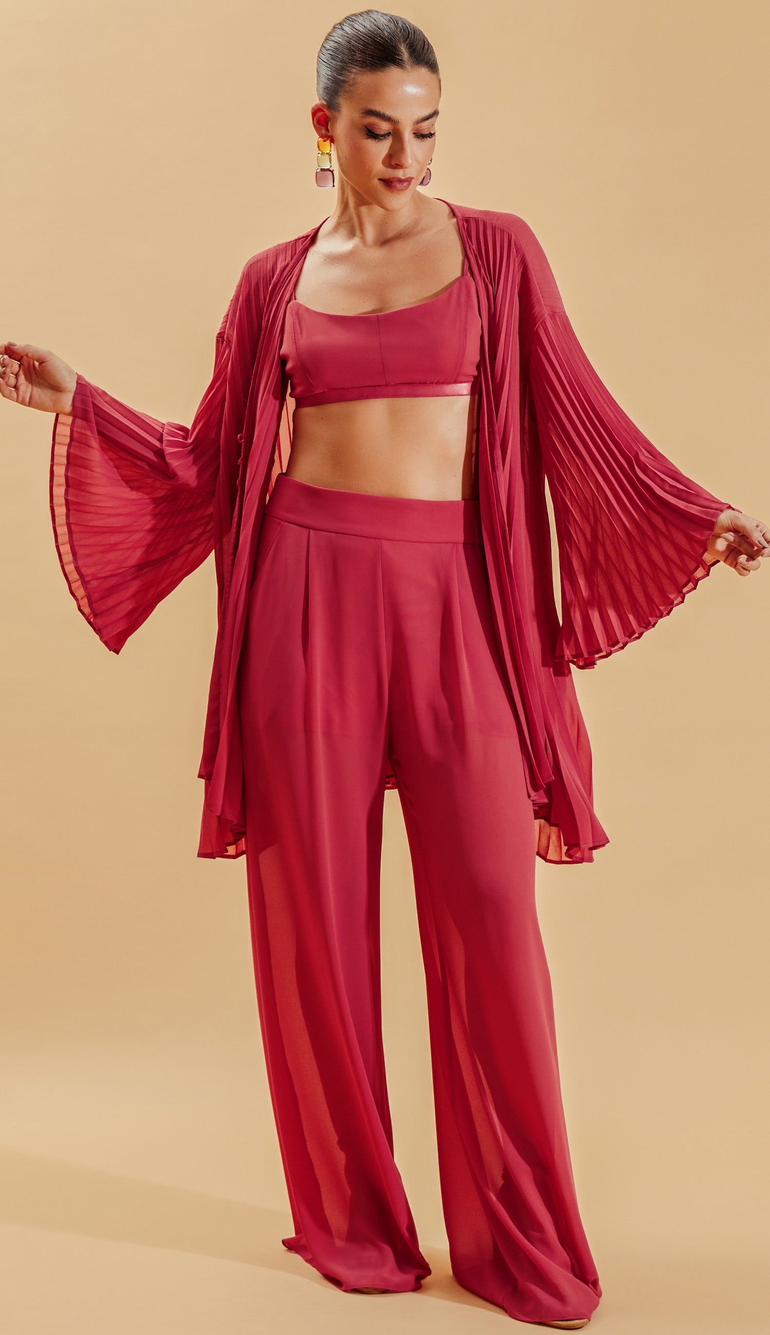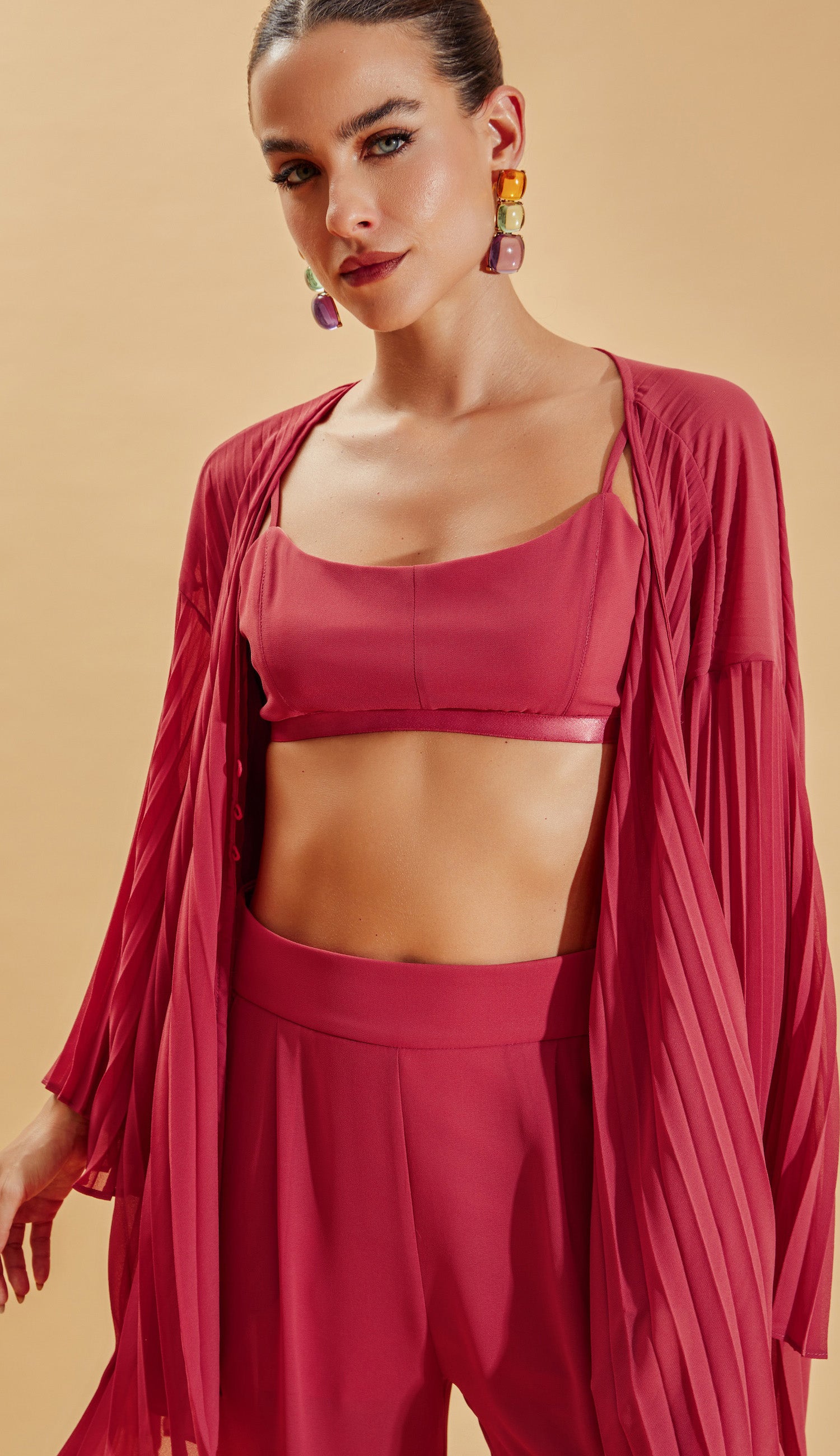 Trijunto confeccionado em crepe. O top possui forro, decote redondo, alcinhas reguláveis, elástico com franzidinhos logo abaixo do busto e fechamento traseiro por gancho de metal. A calça é pantalona e possui forro, fechamento lateral por zíper invisível e pregas frontais. O kimono é todo plissado e possui modelagem alongada e ampla, mangas sino 7/8 e fechamento frontal por botões esmaltados.