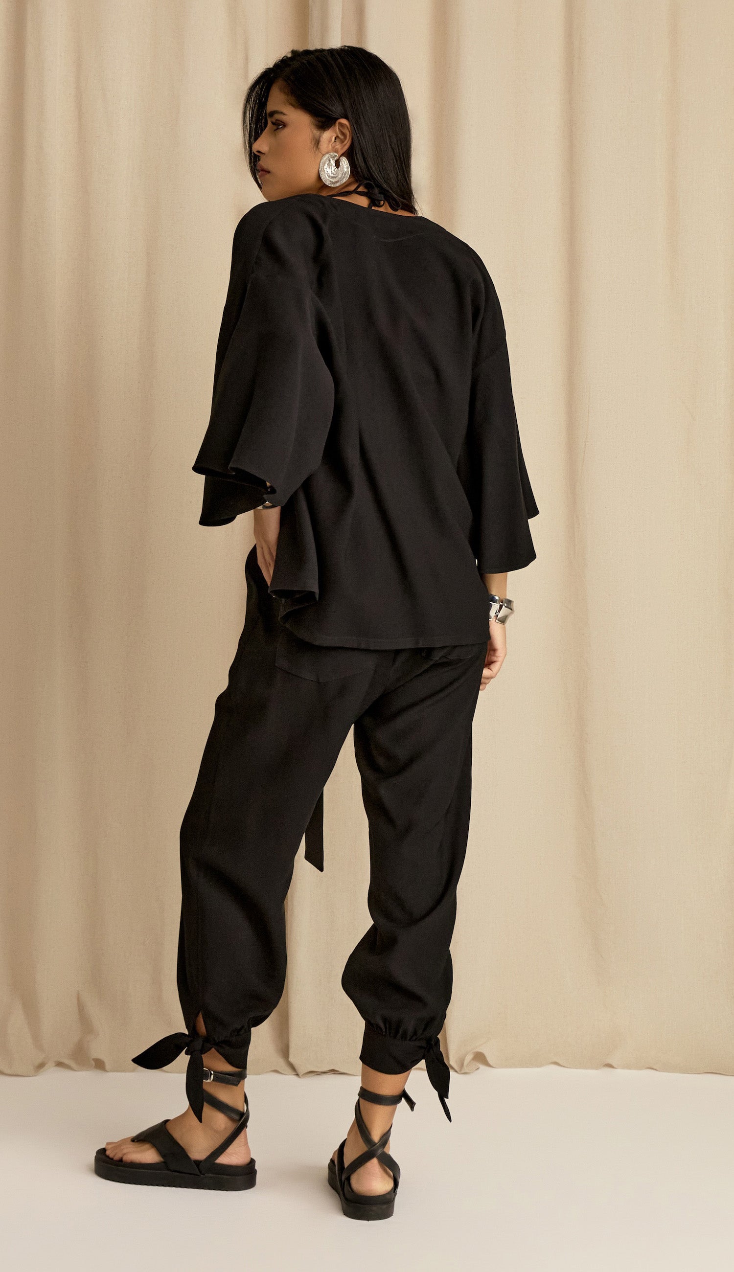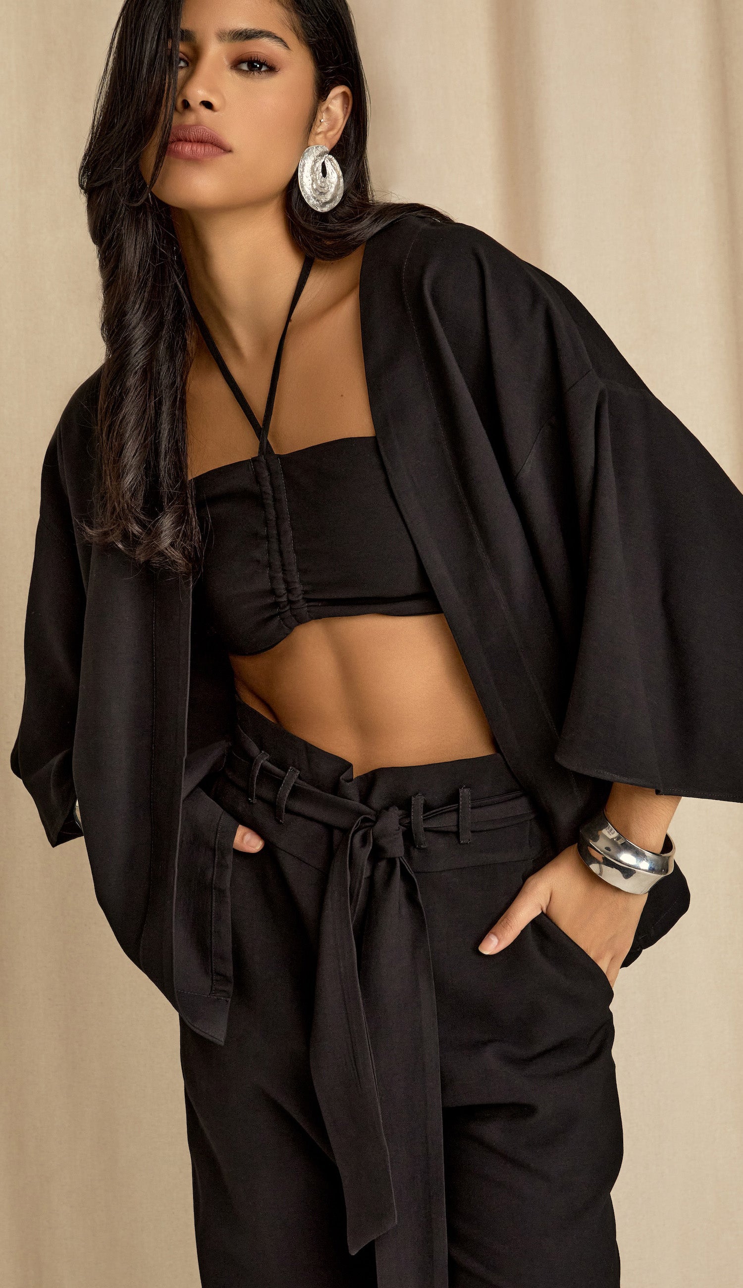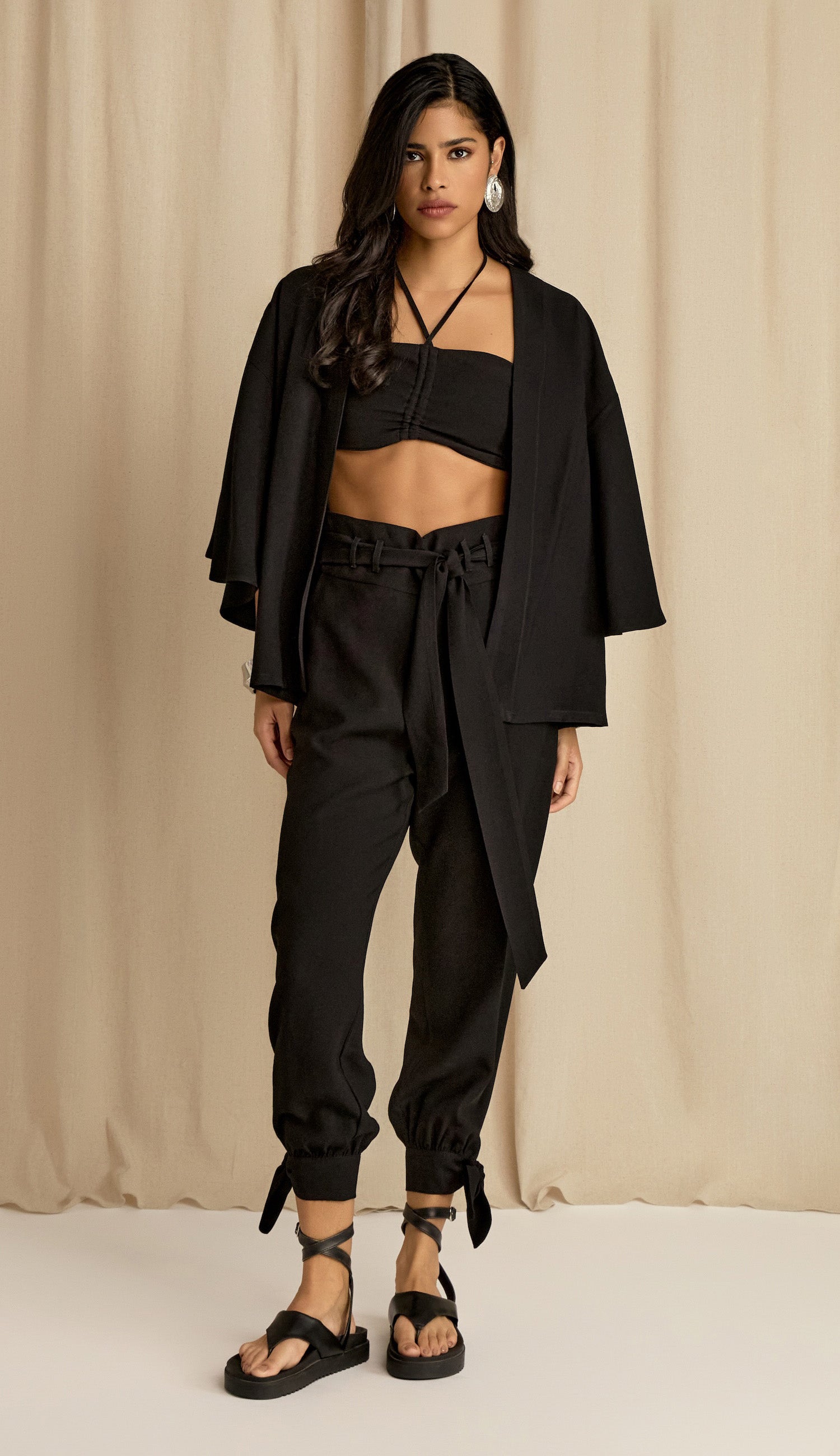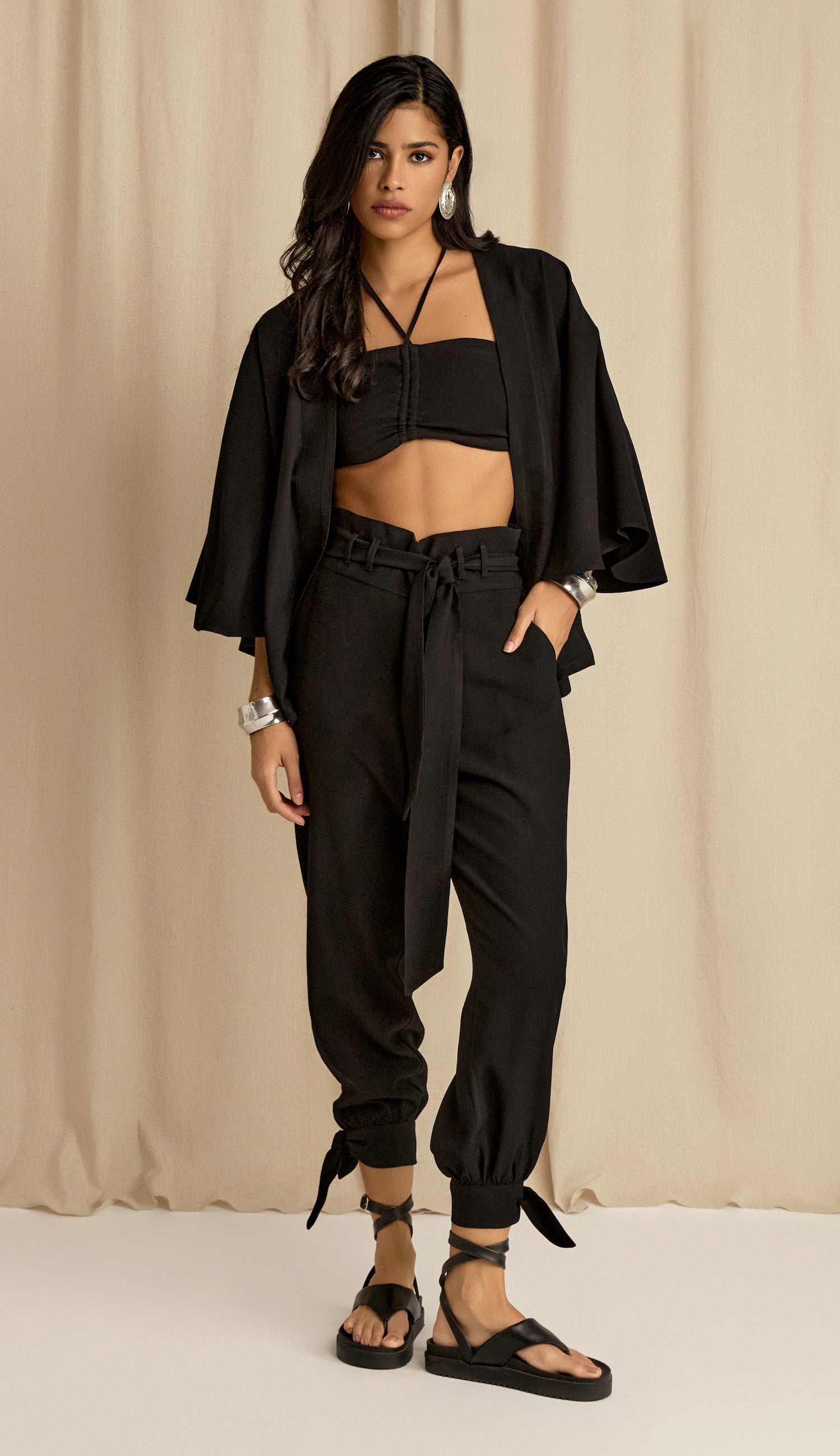 Trijunto confeccionado em sarja de alfaiataria em viscose mais encorpada. O top não tem mangas e possui silicone no decote para dar maior sustentação, lastex nas costas para melhor ajuste ao corpo e tirinhas embutidas no centro do busto para franzir e prender no pescoço, permitindo diversos tipos de amarrações e usos para a peça. A calça é no estilo clochard com cós largo com passantes e faixa para amarrar na cintura, modelagem soltinha, bolsos laterais e traseiros, fechamento lateral por zíper invisível e tiras fixas para amarrar nas barras e ajustar o punho. O kimono é aberto e amplo e possui mangas sino 7/8.
