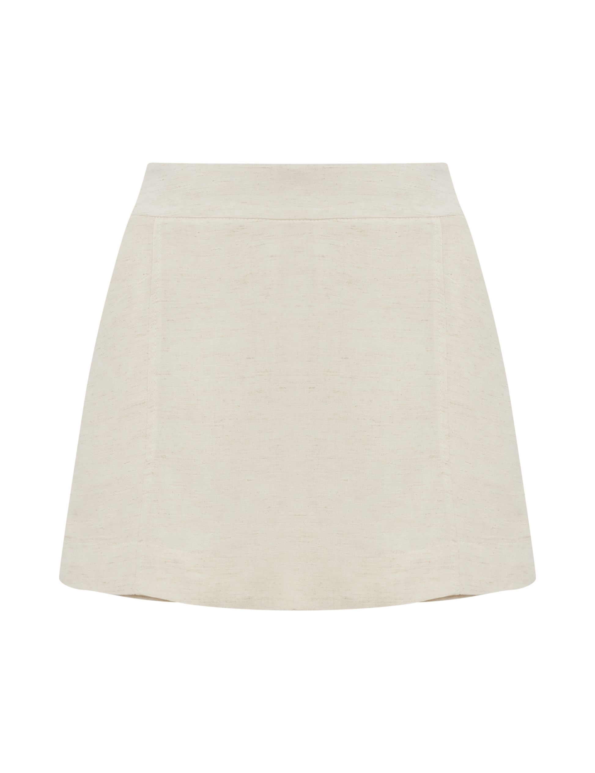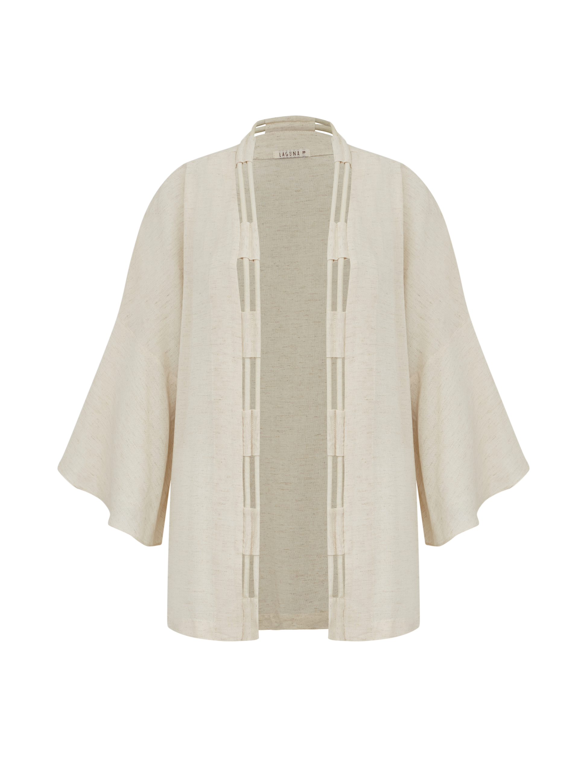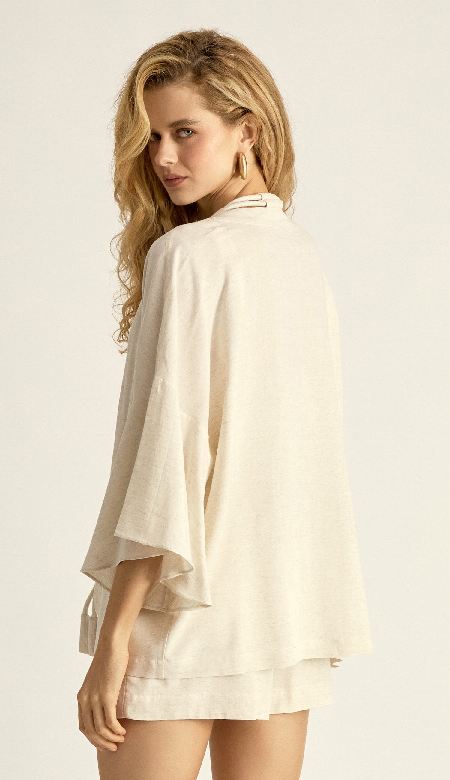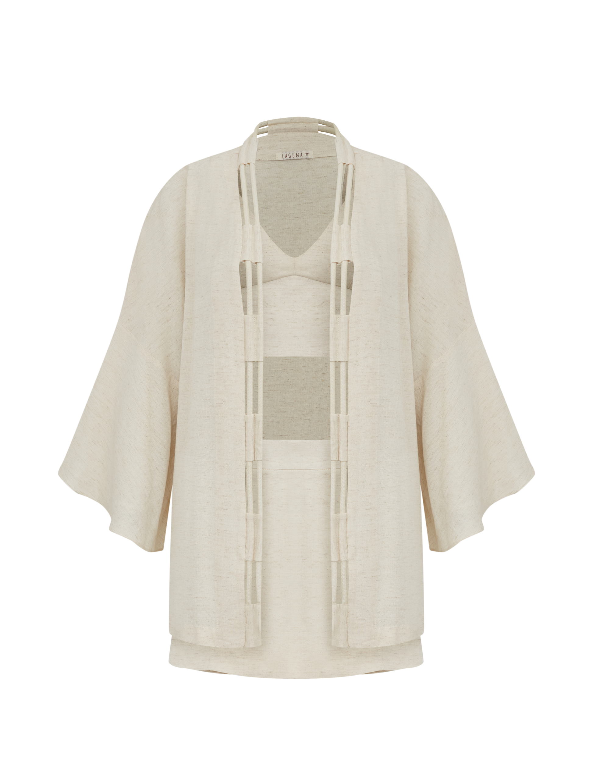 Trijunto confeccionado em linho. O top possui forro, decote em V com recortes que modelam o busto, pala na cintura, alças grossas com elástico franzido atrás e lastex nas costas para maior conforto. O shorts saia também possui forro, recortes frontais, bolsos e fechamento lateral por zíper invisível. O kimono é amplo e aberto, conta com mangas sino 3/4 raglan e recorte frontal com detalhe de cordões e vazados.