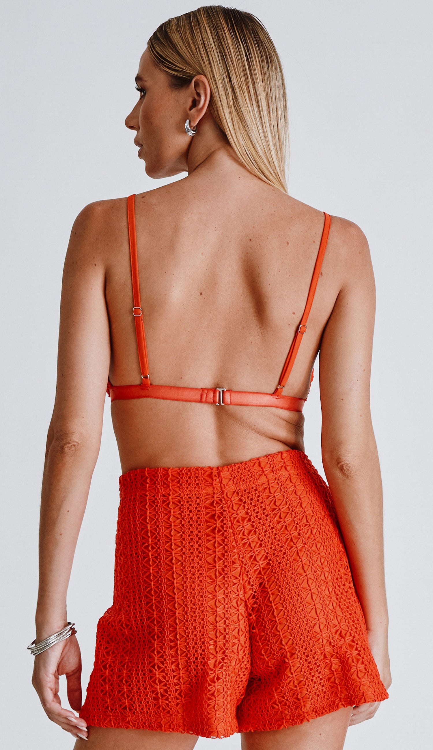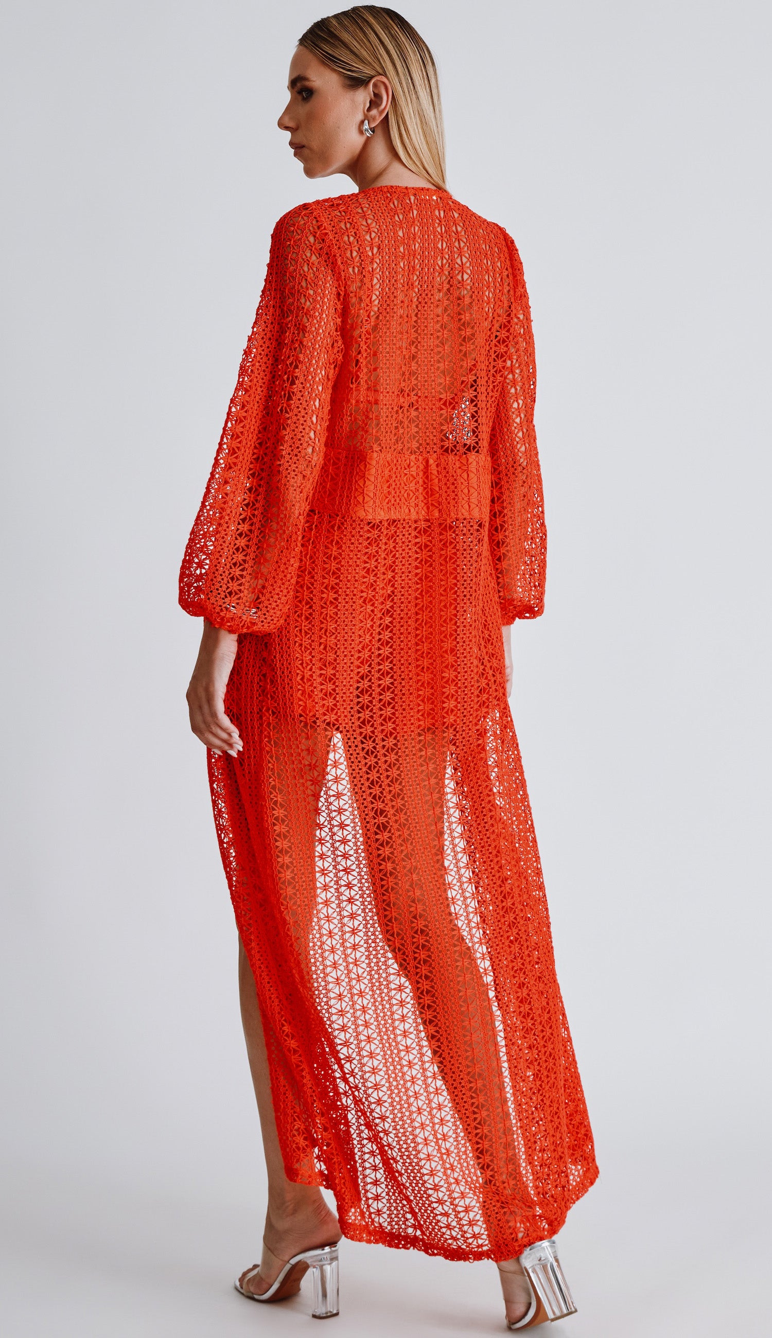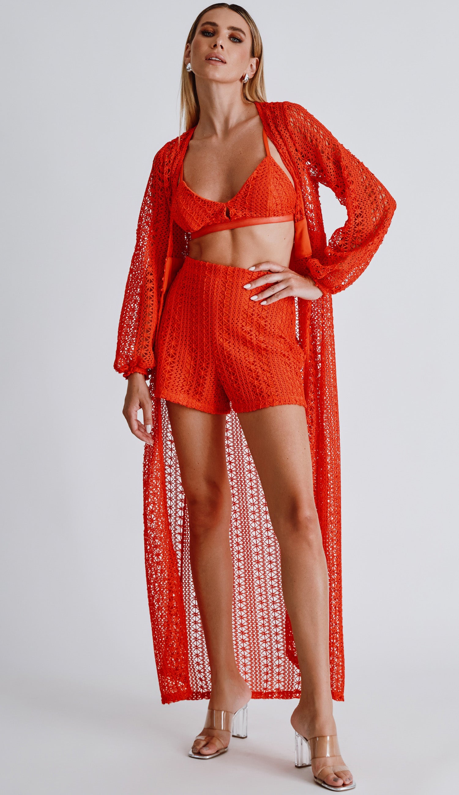 Trijunto confeccionado em renda vazada. O top é triângulo e possui forro, alcinhas reguláveis e elástico abaixo do busto com fecho de metal para ajuste e fechamento nas costas. O shorts possui forro, pernas soltinhas e fechamento lateral por zíper invisível. O vestido é longo e não possui forro, deixando assim, as demais peças à mostra; conta com mangas longas com lastex no punho, decote aberto com fechamento frontal apenas na pala da cintura por botõezinhos esmaltados; parecendo um maxi kimono.