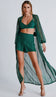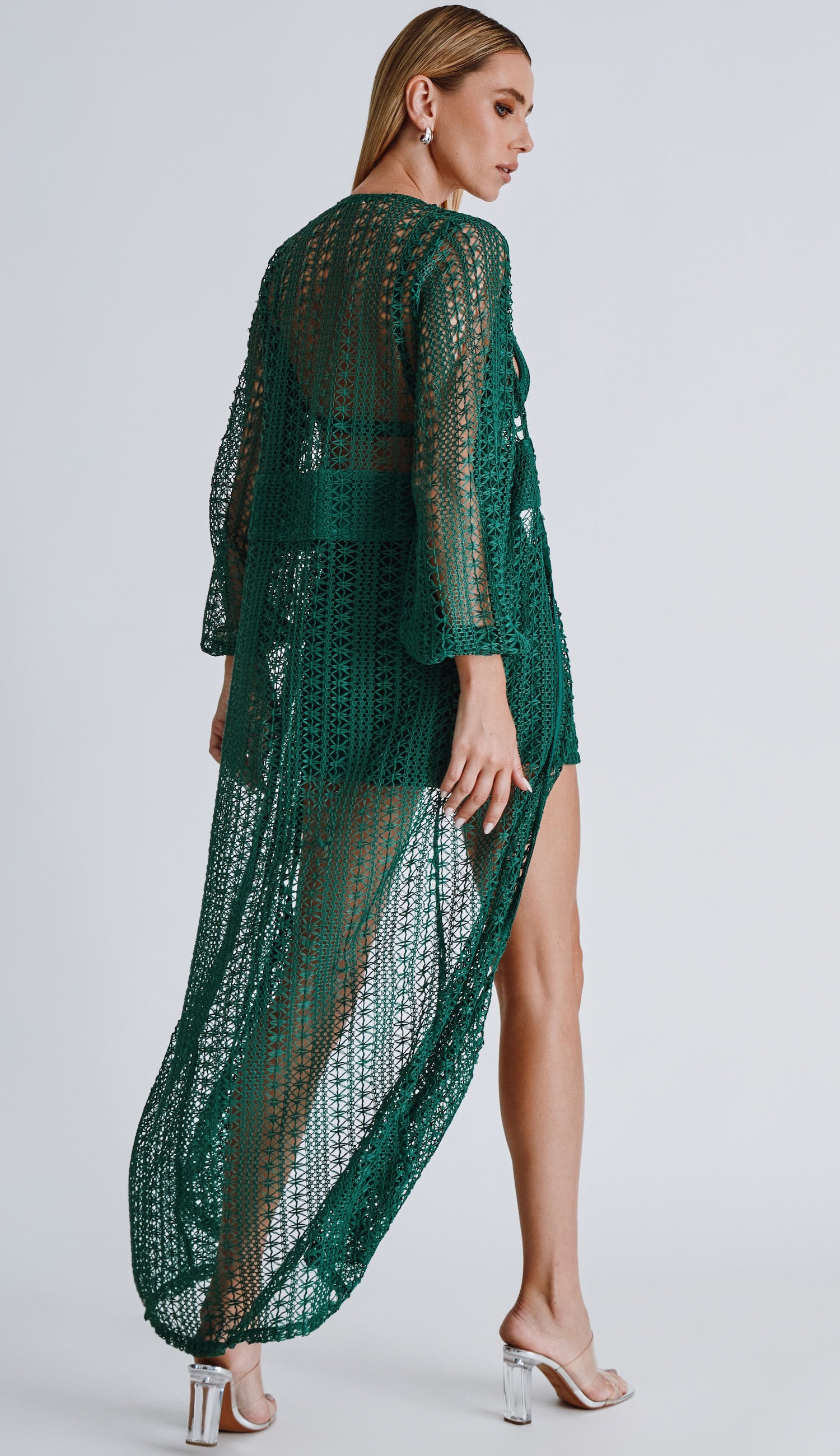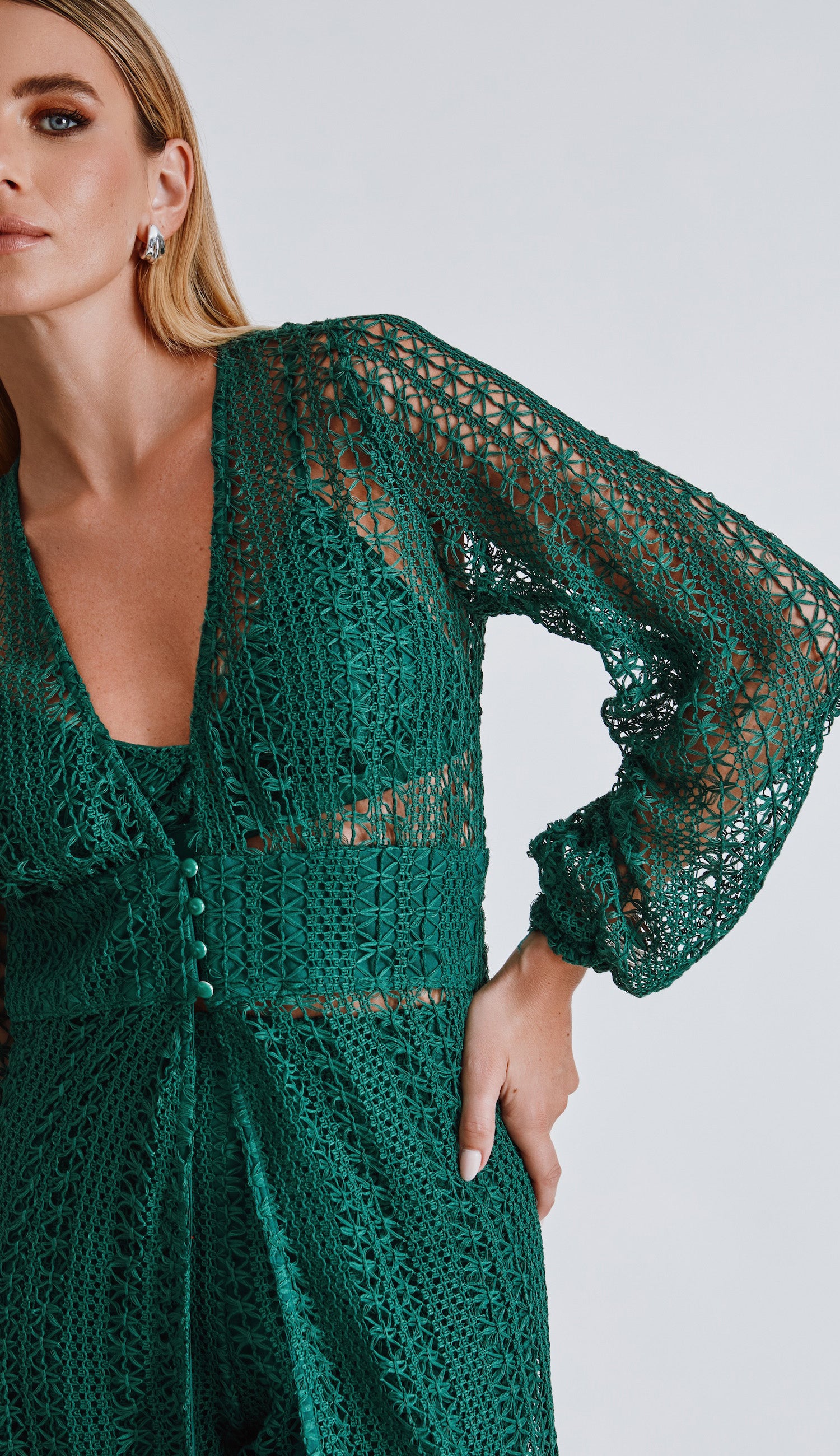 Trijunto confeccionado em renda vazada. O top é triângulo e possui forro, alcinhas reguláveis e elástico abaixo do busto com fecho de metal para ajuste e fechamento nas costas. O shorts possui forro, pernas soltinhas e fechamento lateral por zíper invisível. O vestido é longo e não possui forro, deixando assim, as demais peças à mostra; conta com mangas longas com lastex no punho, decote aberto com fechamento frontal apenas na pala da cintura por botõezinhos esmaltados; parecendo um maxi kimono.