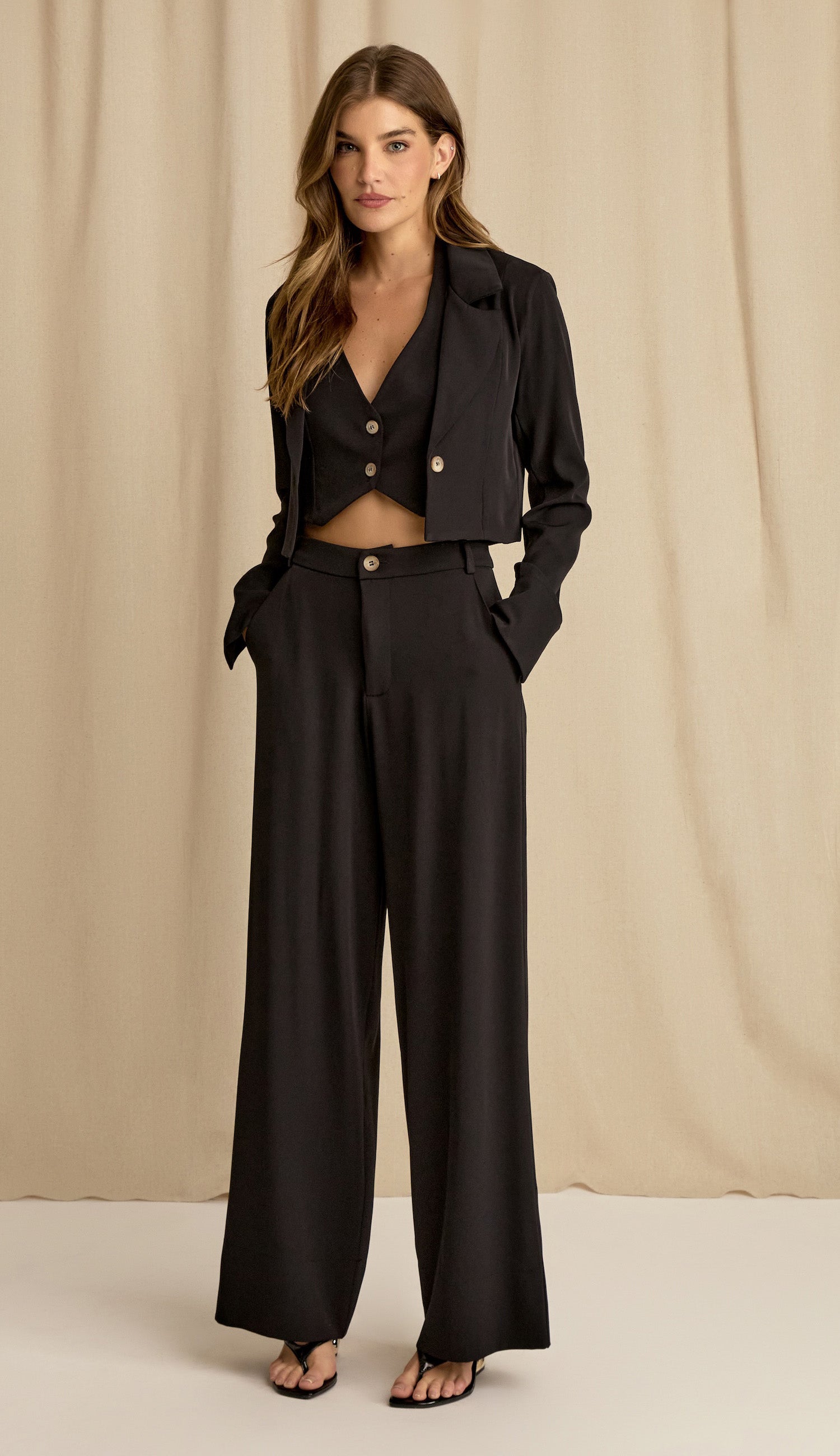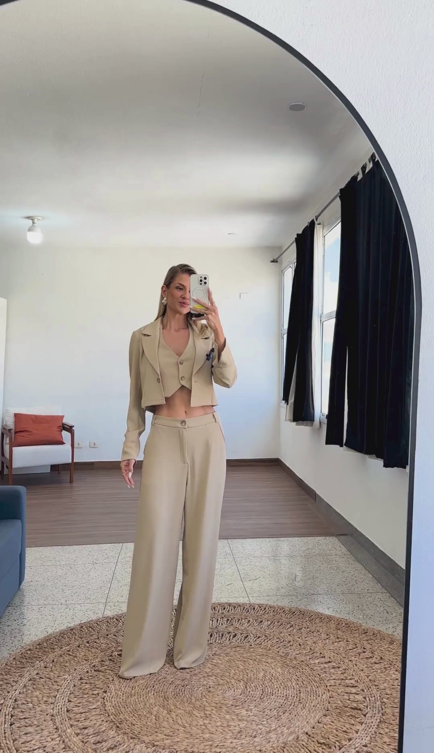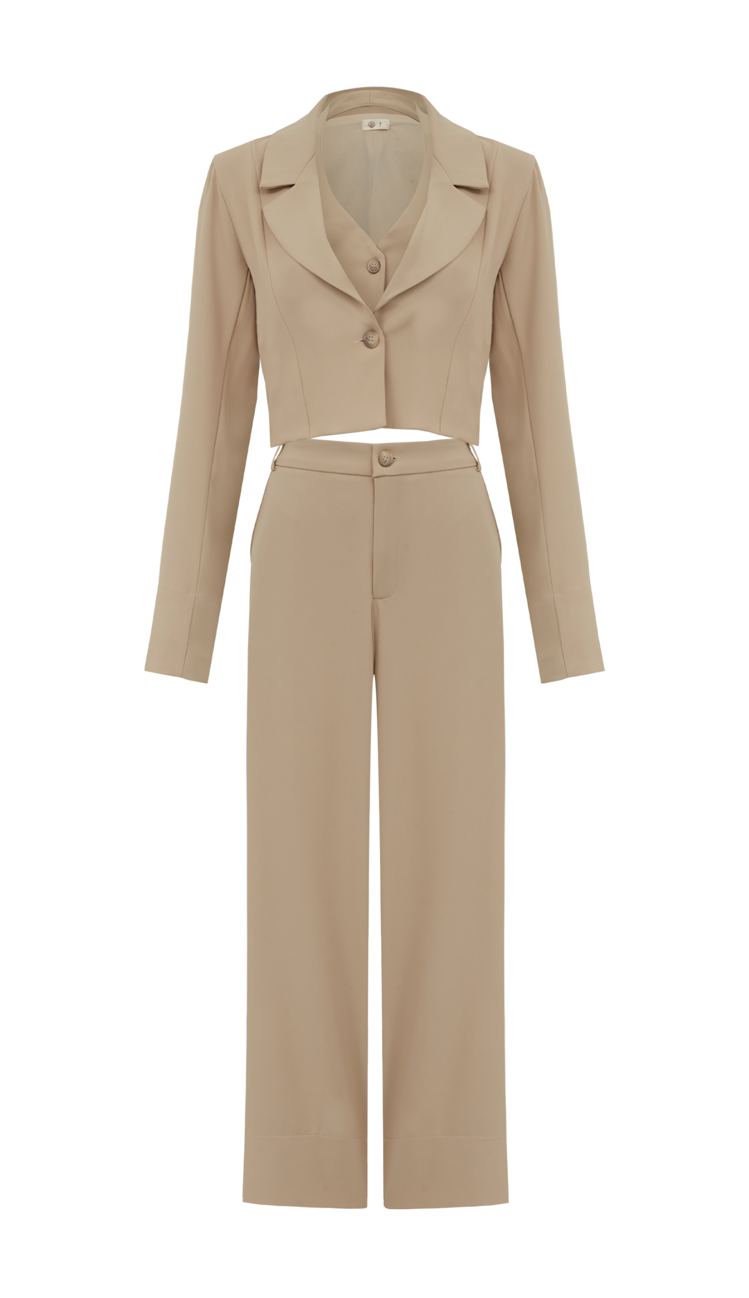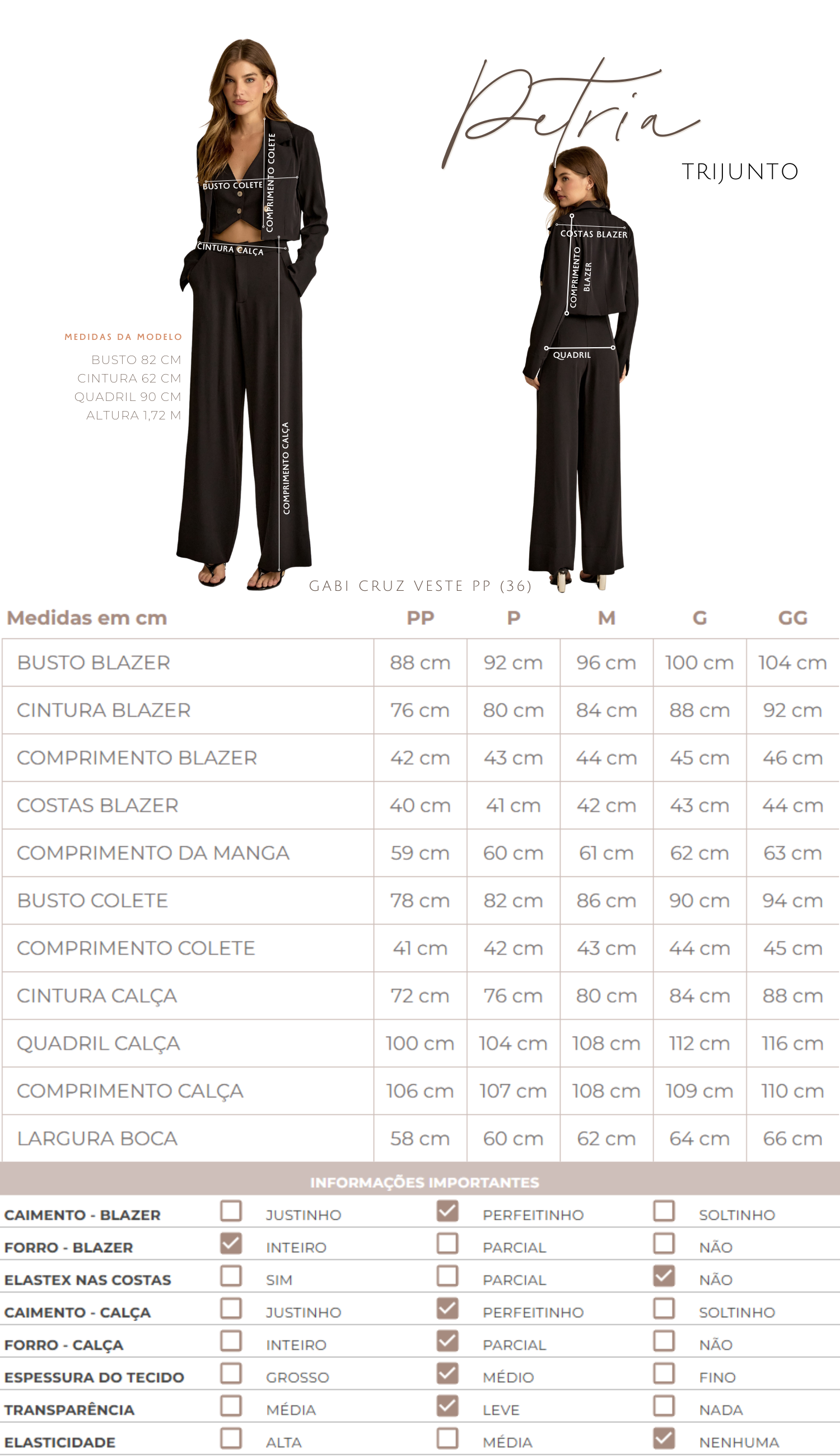 Trijunto confeccionado em alfaiataria com forro. O colete cropped possui modelagem frente única, decote em V, fechamento frontal por botões foscos rajados, alça única no pescoço e recortes que modelam a peça. A calça é reta e possui fechamento frontal por zíper e botão rajado fosco, bolsos laterais e passantes no cós. O casaqueto no estilo blazer cropped possui fechamento frontal por único botão rajado fosco, decote em V com lapela dobrada na gola, recortes que modelam a peça no corpo e mangas longas com punhos largos com aberturinha.