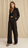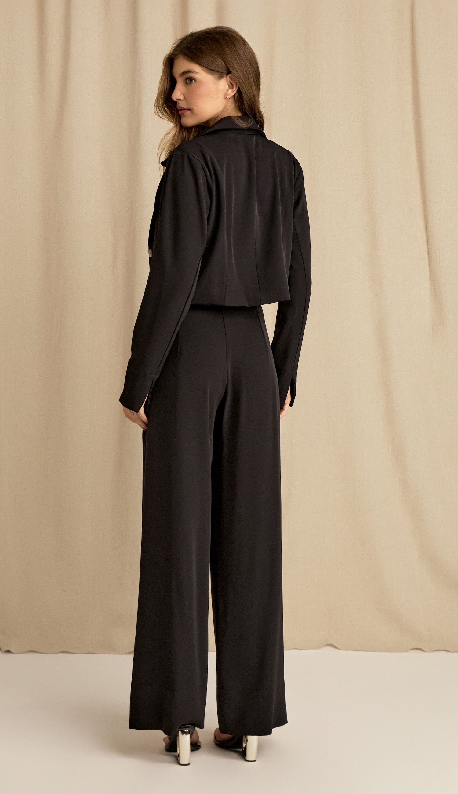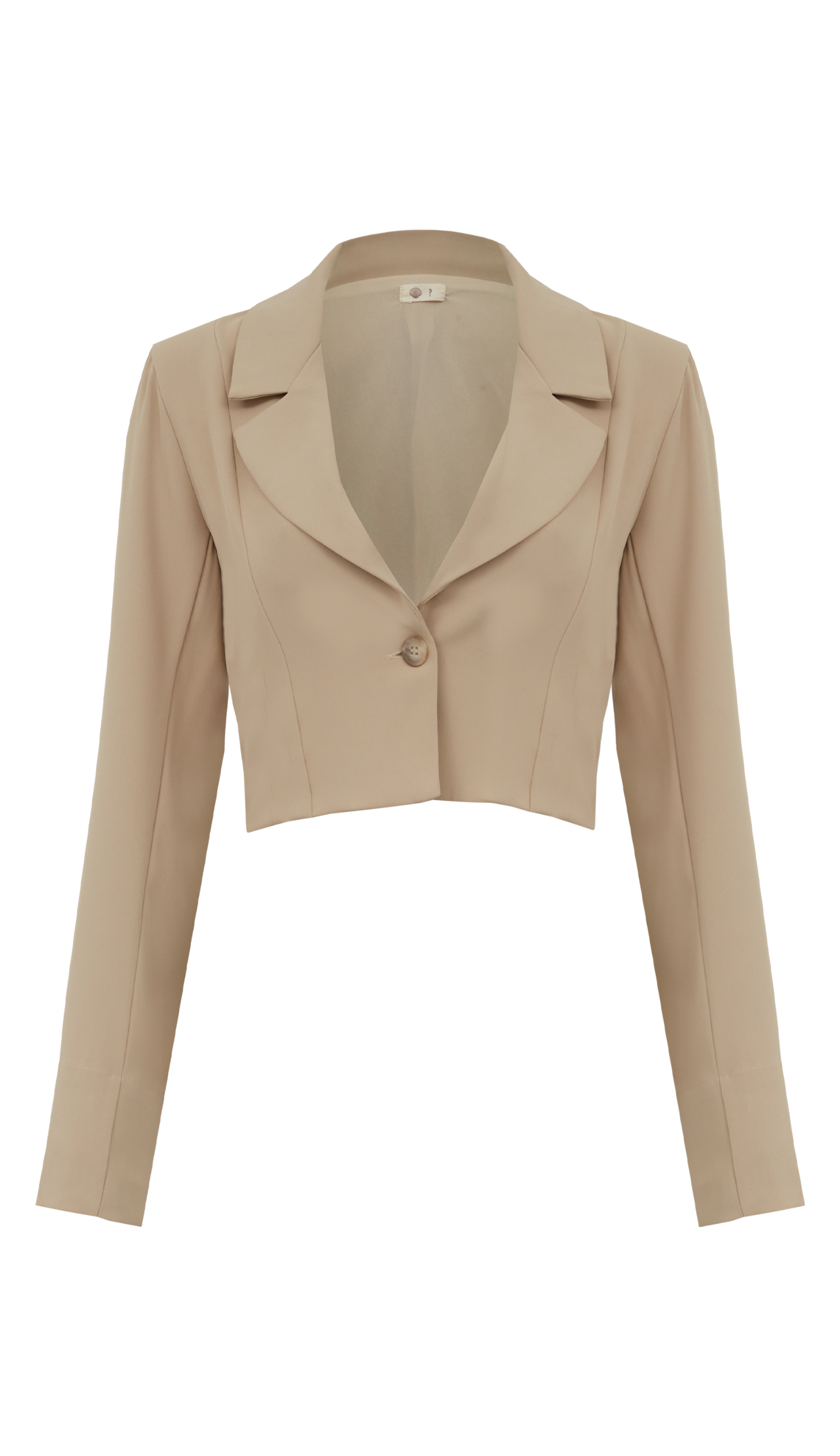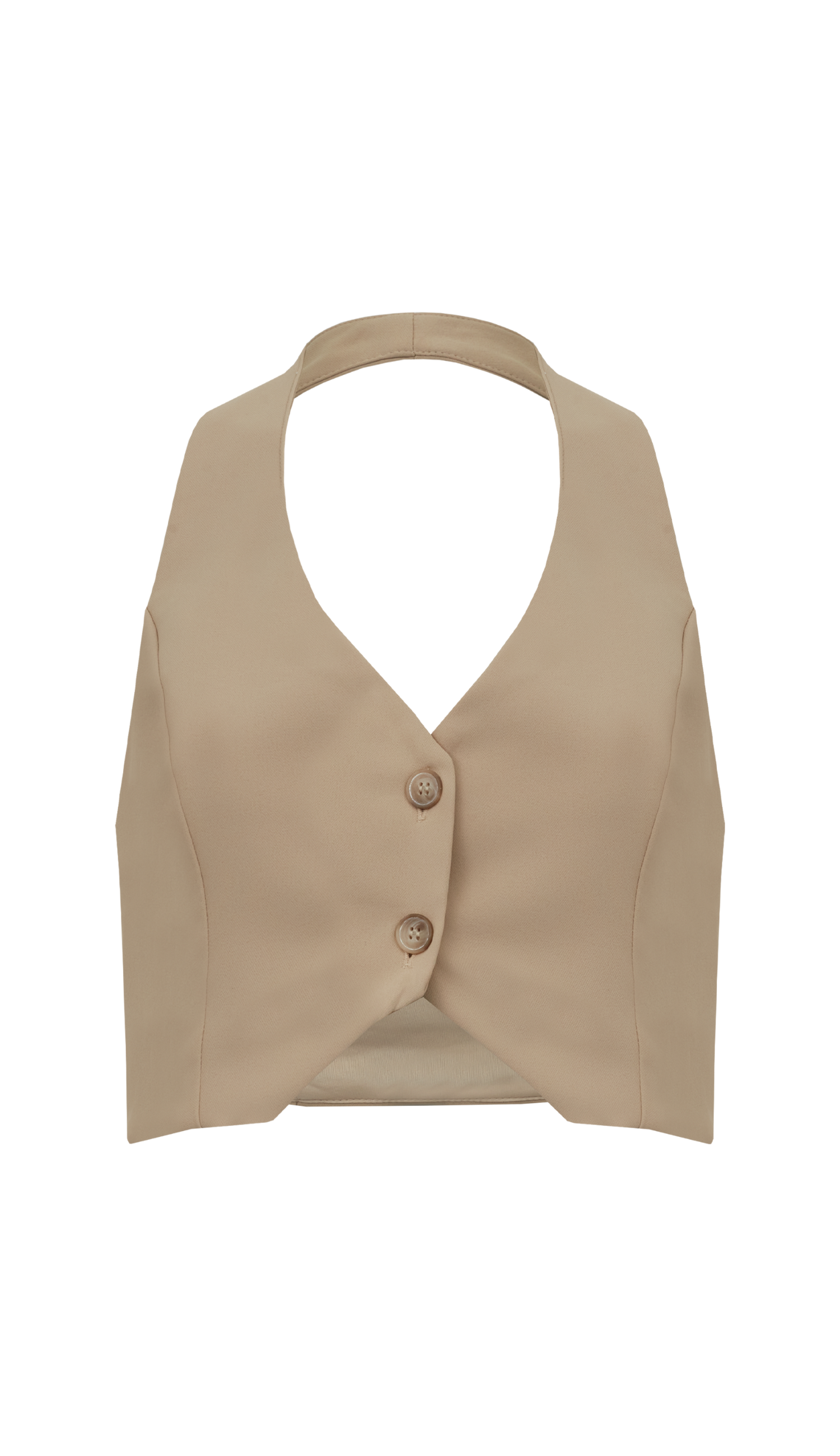 Trijunto confeccionado em alfaiataria com forro. O colete cropped possui modelagem frente única, decote em V, fechamento frontal por botões foscos rajados, alça única no pescoço e recortes que modelam a peça. A calça é reta e possui fechamento frontal por zíper e botão rajado fosco, bolsos laterais e passantes no cós. O casaqueto no estilo blazer cropped possui fechamento frontal por único botão rajado fosco, decote em V com lapela dobrada na gola, recortes que modelam a peça no corpo e mangas longas com punhos largos com aberturinha.