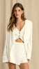 Trijunto com forro confeccionado em malha com aspecto tweed. O colete cropped possui decote em V, fechamento frontal por botõezinhos foscos rajados, alças cruzadas nas costas com elástico franzido embutido e recortes que modelam a peça. O shorts saia possui sobreposição de tecido com recorte assimétrico na frente, bolsos traseiros e fechamento lateral por zíper de metal com pingente que tem o detalhe da conchinha da Laguna gravada no metal. O blazer é aberto, sem fechamento e possui lapela na gola com ponta que fica super charmosa dobrada, conta também com recortes que modelam a peça e mangas longas com martingale e botãozinho fosco rajado para ajuste do comprimento.