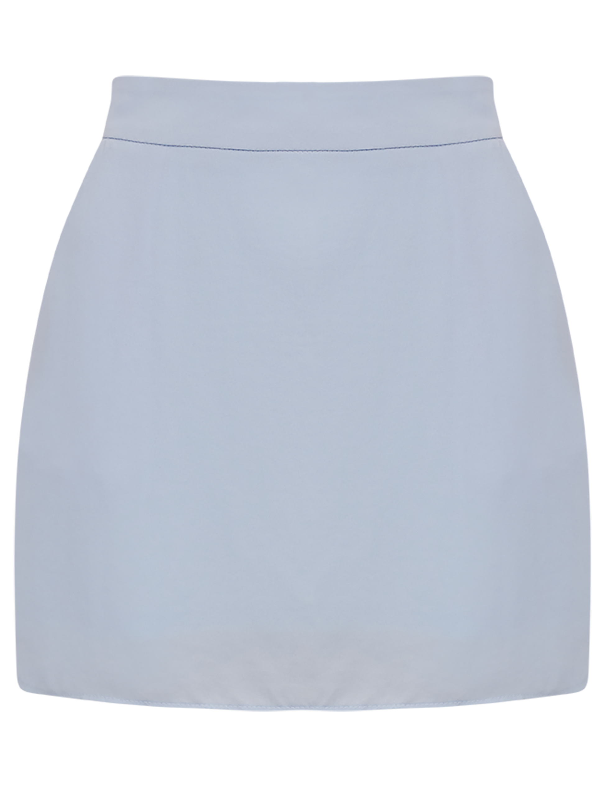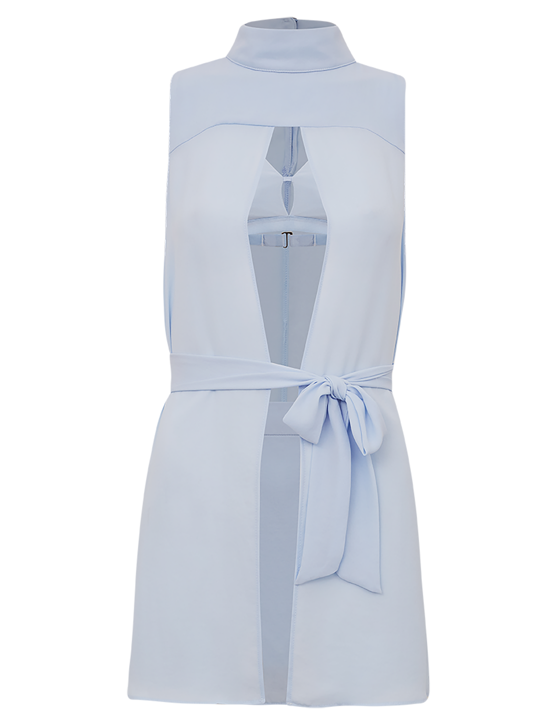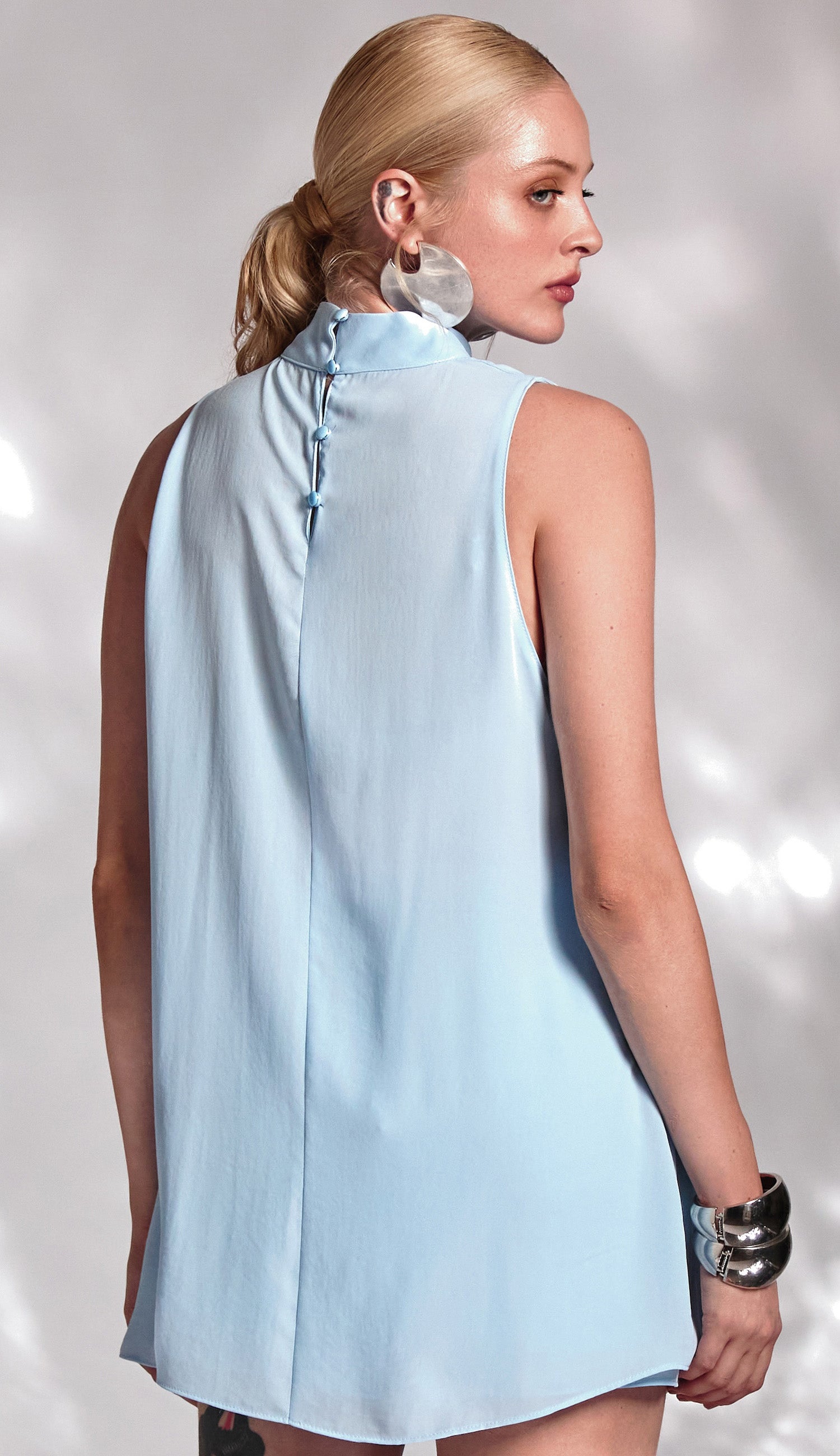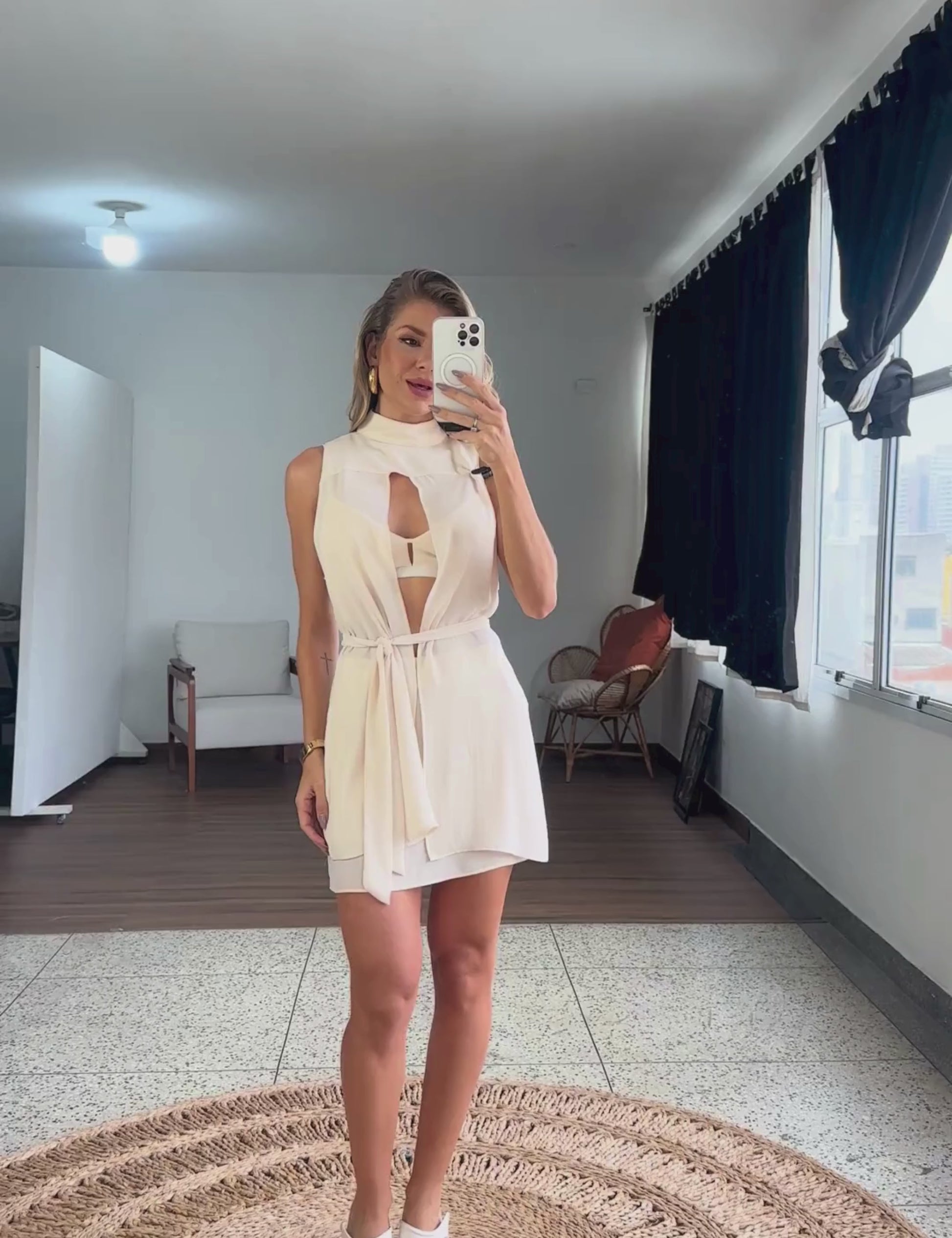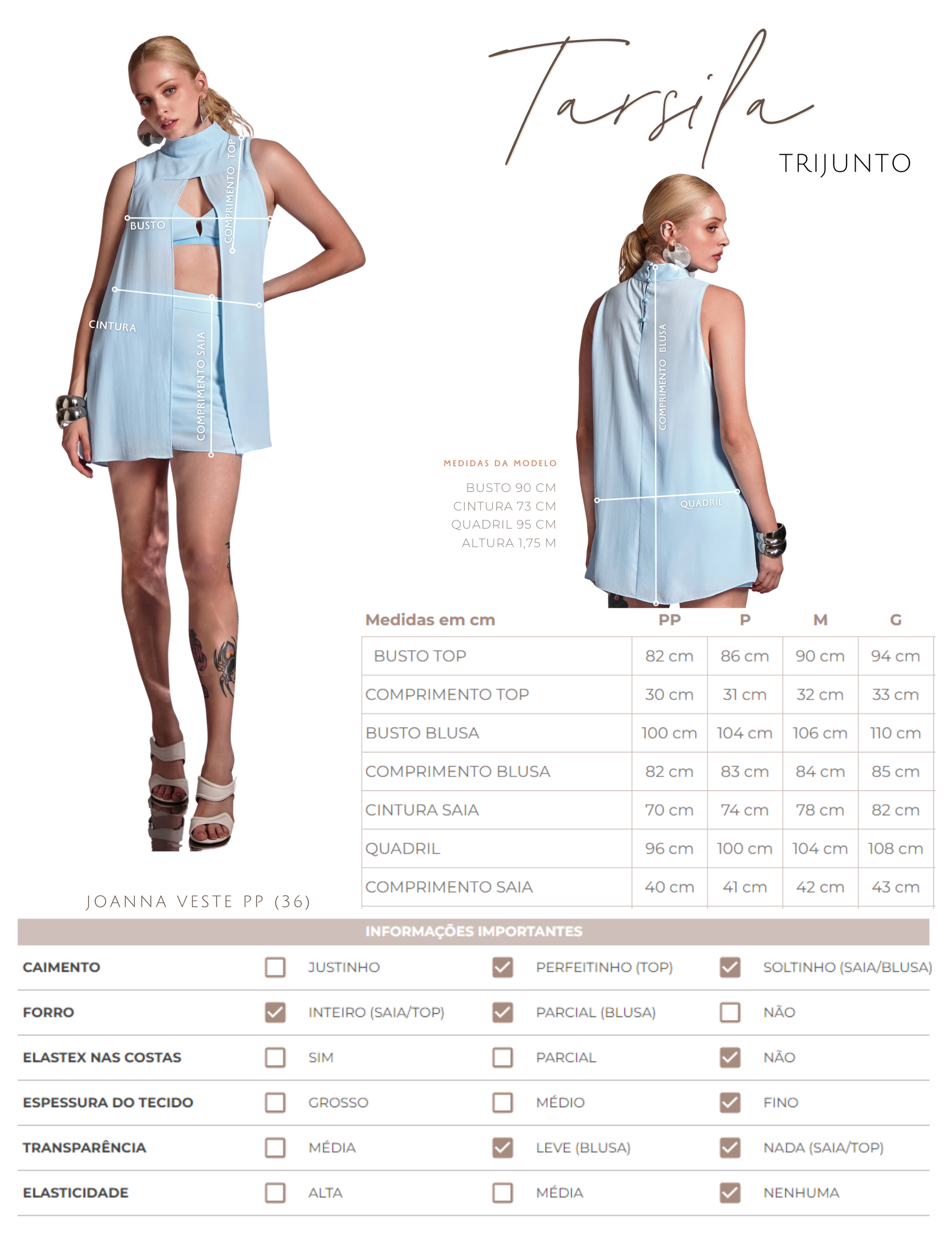 Trijunto confeccionado em crepe. O top possui forro, decote em V, alcinhas reguláveis, elástico abaixo do busto com fechamento traseiro por fecho de metal para encaixe. A blusa é regata e possui modelagem alongada soltinha, gola alta com pala logo abaixo, fechamento nas costas por botões esmaltados recorte frontal com abertura que deixa as demais peças á mostra. A saia é curta e possui modelagem soltinha, bolsos laterais e fechamento traseiro por zíper invisível. Acompanha faixa no mesmo tecido parar amarrar.
