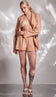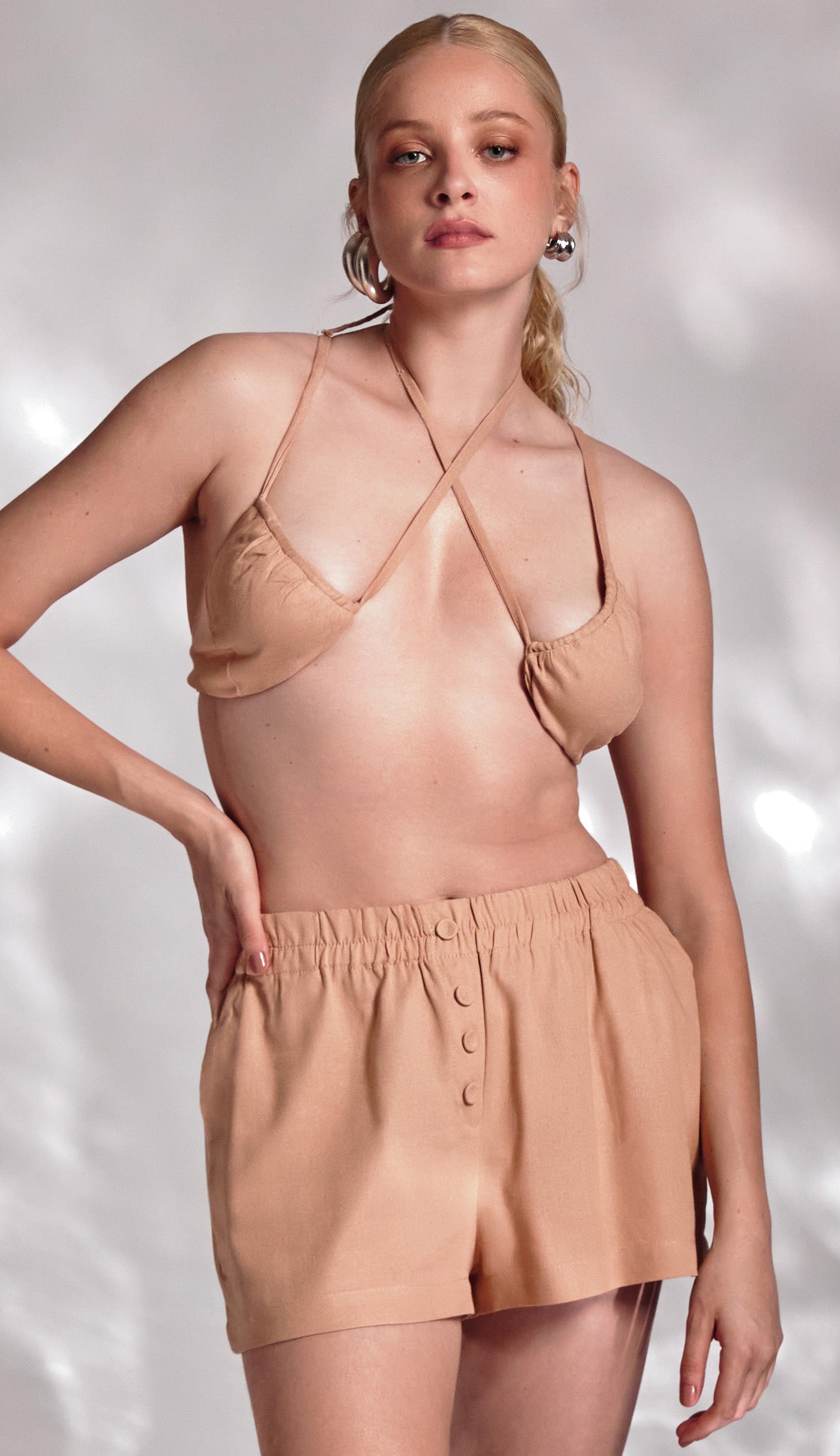 Trijunto confeccionado em linho mais encorpado. O top possui elástico franzido nas costas, decote aberto, com alças finas que passam pelo centro do busto para ajuste e amarração frontal no fechamento da peça, além de contar com elástico fininho interno levemente franzido abaixo do busto. O shorts possui cós em elástico mais grosso franzido, botõezinhos forrados de enfeite na frente, bolsos laterais e pernas soltinhas. O blazer possui forro, modelagem soltinha e alongada, lapelas dobradas na gola, mangas longas com martingale com ajuste das mangas por argolinhas de metal com tirinha, fechamento frontal por um único botão forrado e o charme dos recortes vazados frontais com detalhe de tirinhas e argolas de metal.