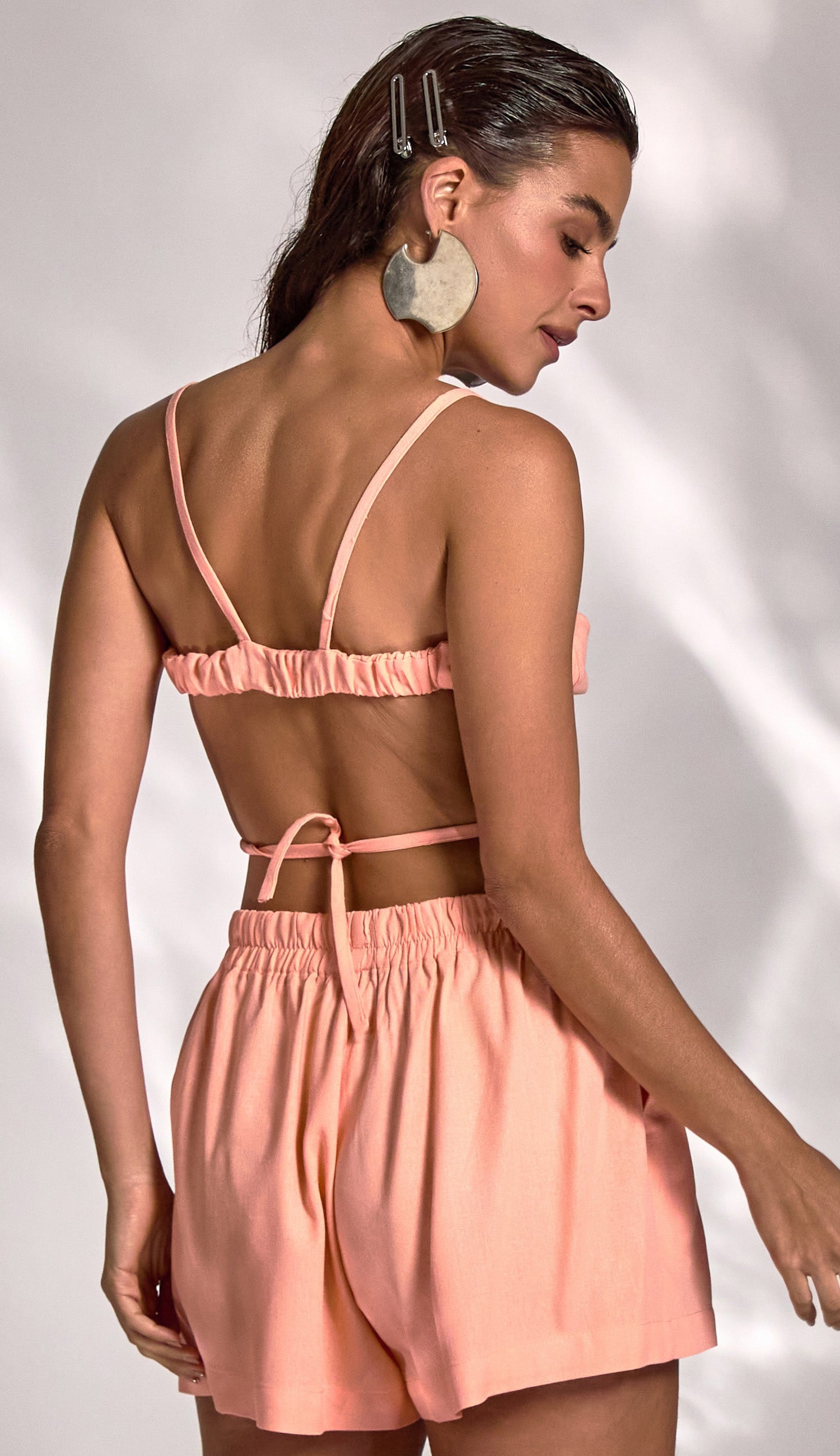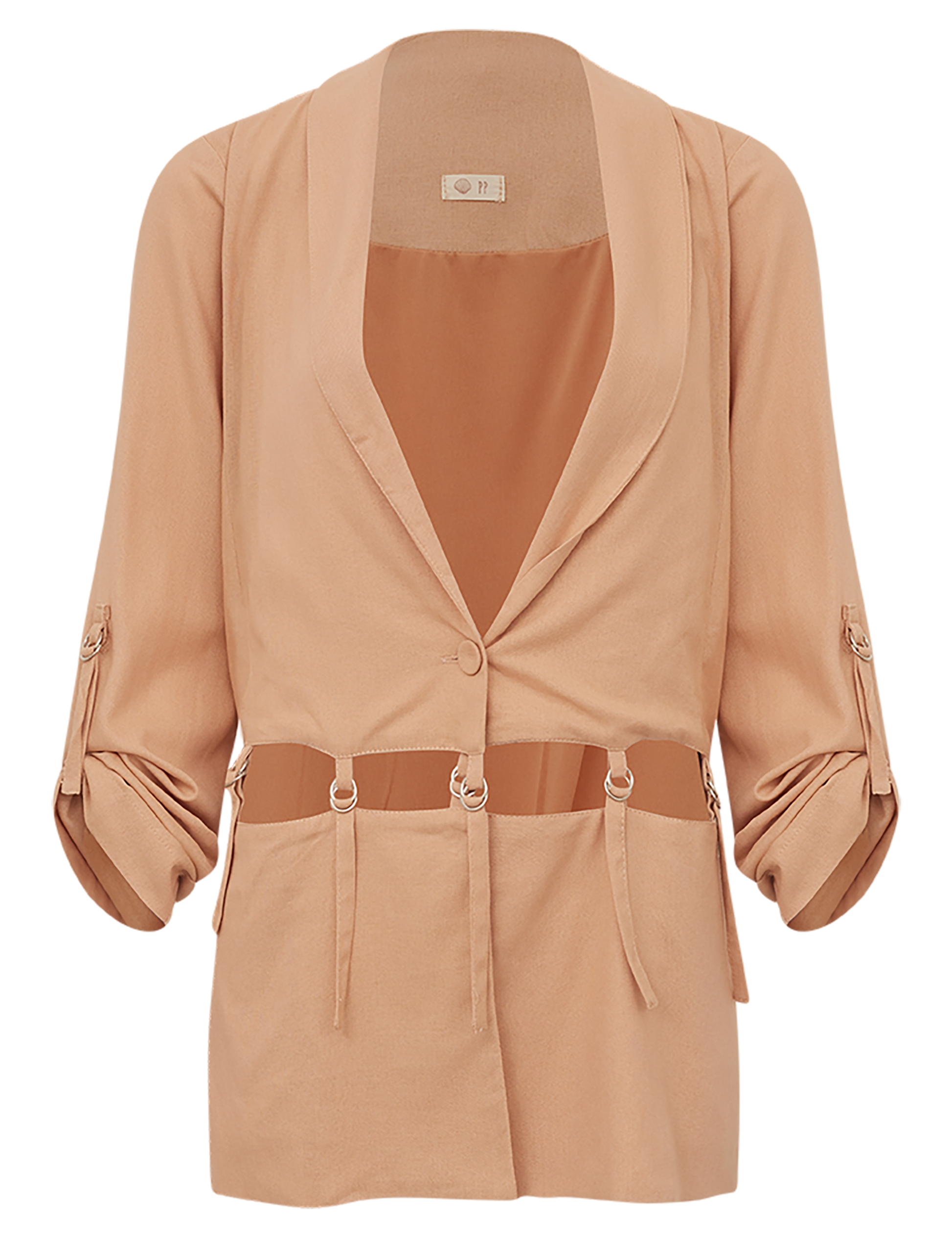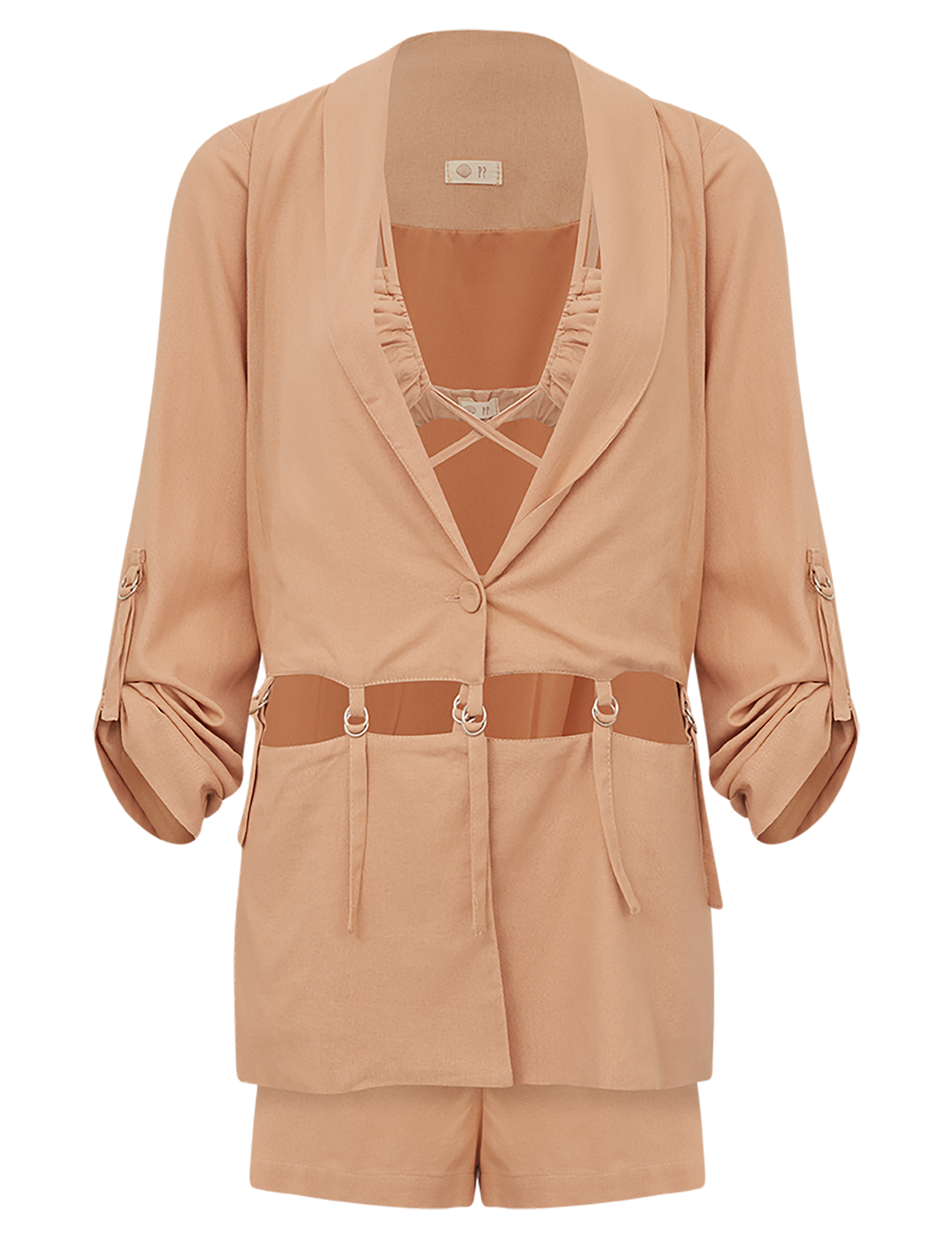 Trijunto confeccionado em linho mais encorpado. O top possui elástico franzido nas costas, decote aberto, com alças finas que passam pelo centro do busto para ajuste e amarração frontal no fechamento da peça, além de contar com elástico fininho interno levemente franzido abaixo do busto. O shorts possui cós em elástico mais grosso franzido, botõezinhos forrados de enfeite na frente, bolsos laterais e pernas soltinhas. O blazer possui forro, modelagem soltinha e alongada, lapelas dobradas na gola, mangas longas com martingale com ajuste das mangas por argolinhas de metal com tirinha, fechamento frontal por um único botão forrado e o charme dos recortes vazados frontais com detalhe de tirinhas e argolas de metal.