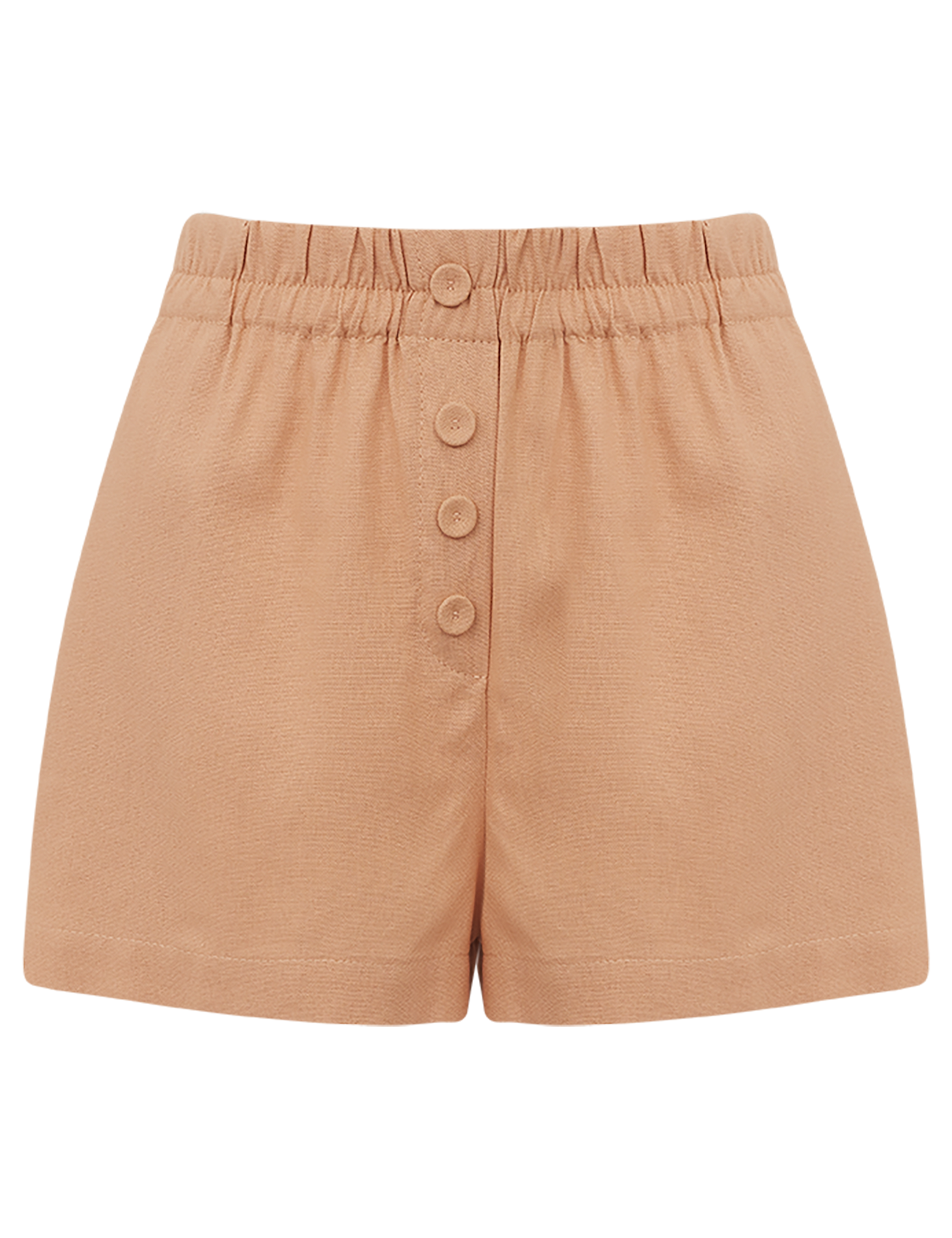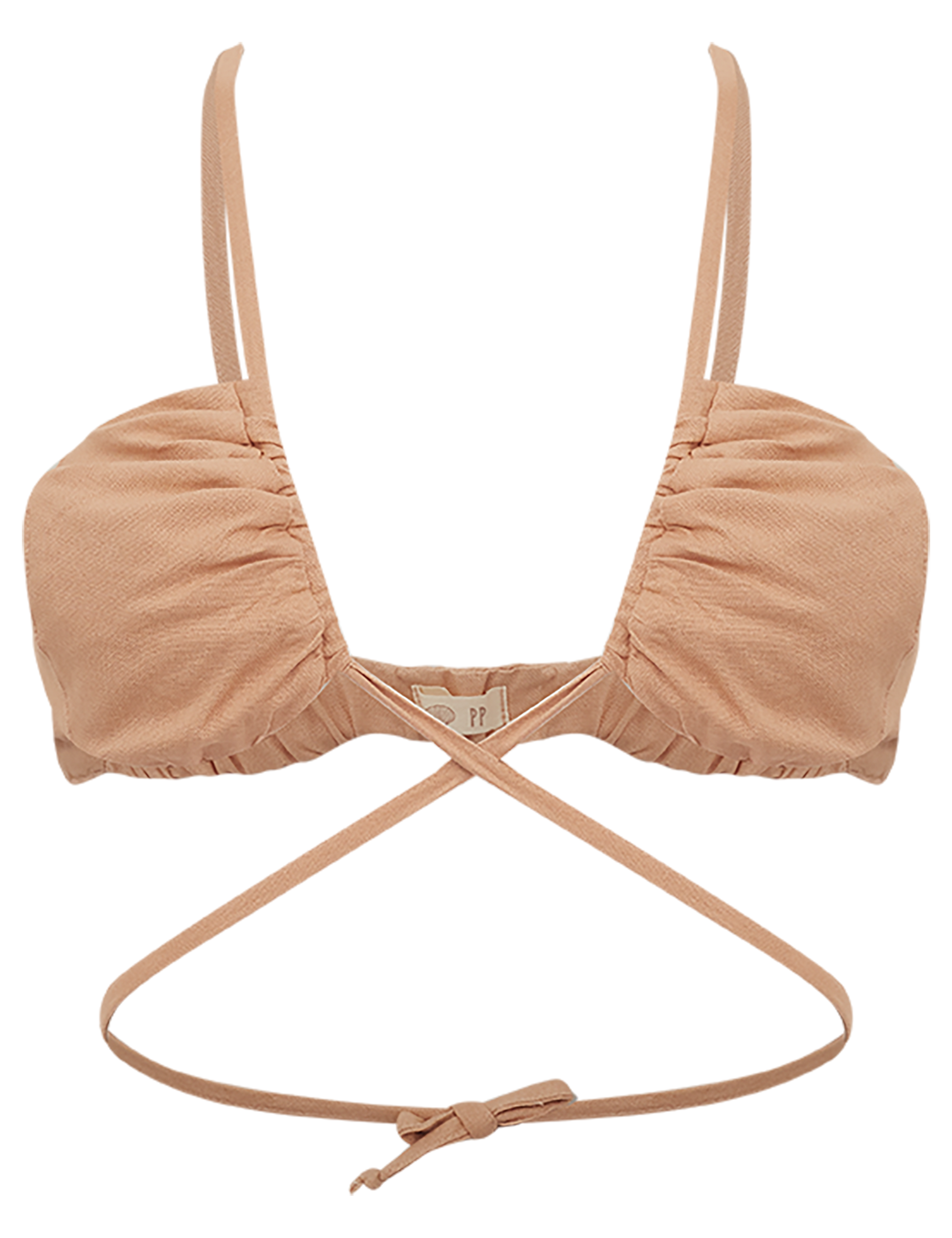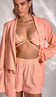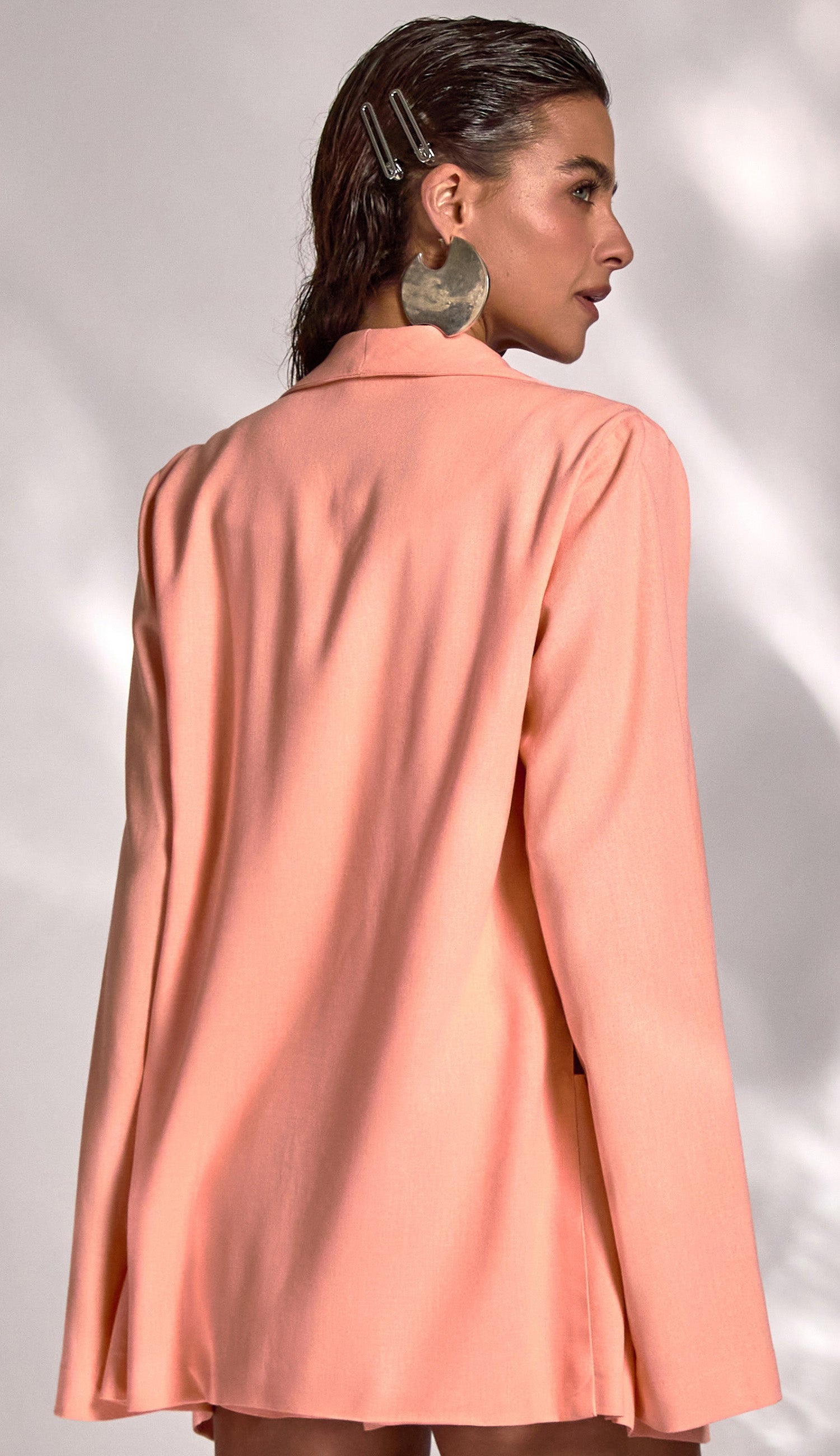 Trijunto confeccionado em linho mais encorpado. O top possui elástico franzido nas costas, decote aberto, com alças finas que passam pelo centro do busto para ajuste e amarração frontal no fechamento da peça, além de contar com elástico fininho interno levemente franzido abaixo do busto. O shorts possui cós em elástico mais grosso franzido, botõezinhos forrados de enfeite na frente, bolsos laterais e pernas soltinhas. O blazer possui forro, modelagem soltinha e alongada, lapelas dobradas na gola, mangas longas com martingale com ajuste das mangas por argolinhas de metal com tirinha, fechamento frontal por um único botão forrado e o charme dos recortes vazados frontais com detalhe de tirinhas e argolas de metal.