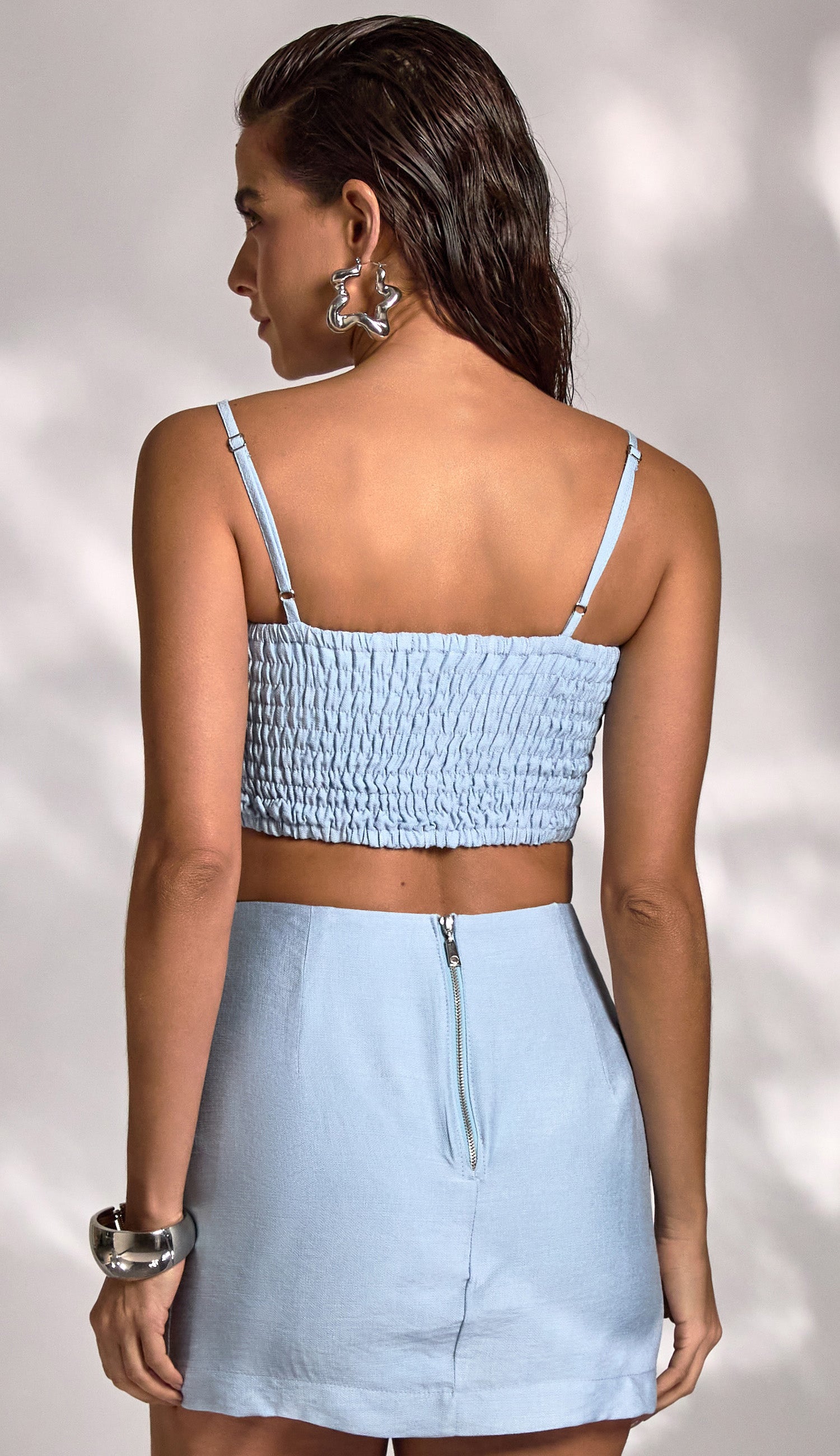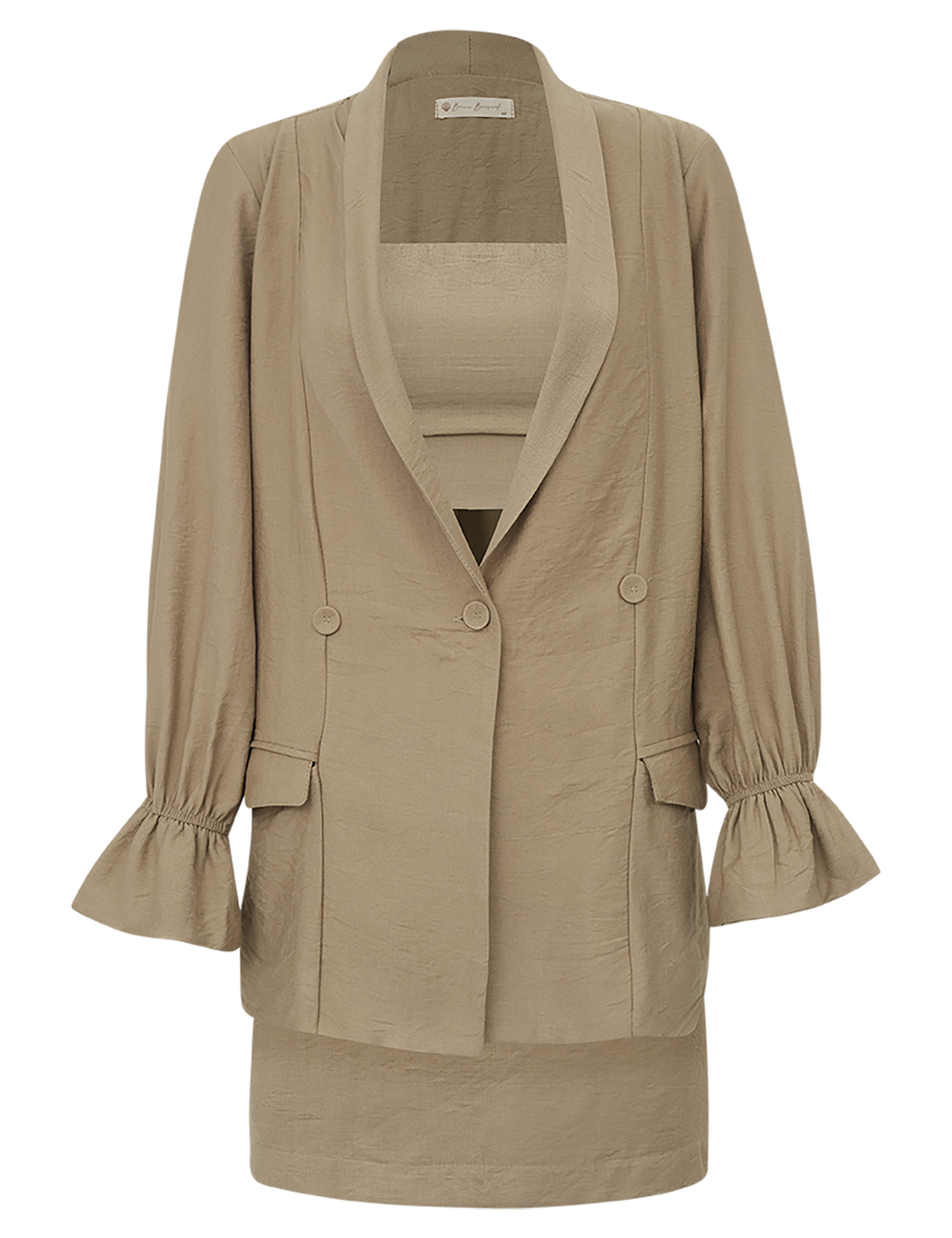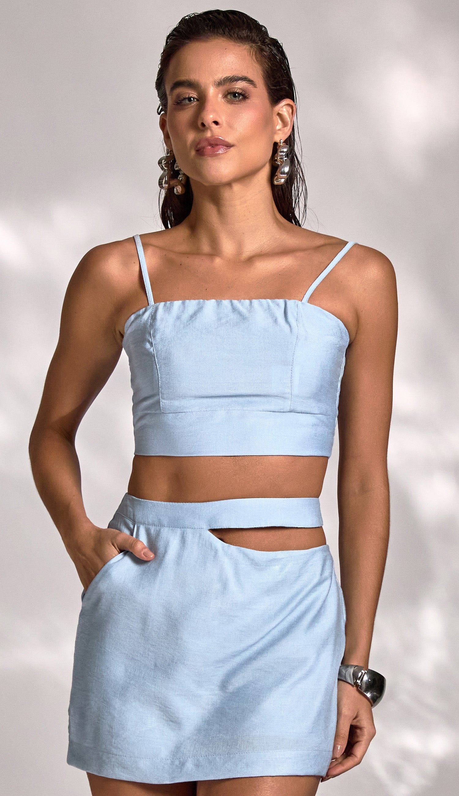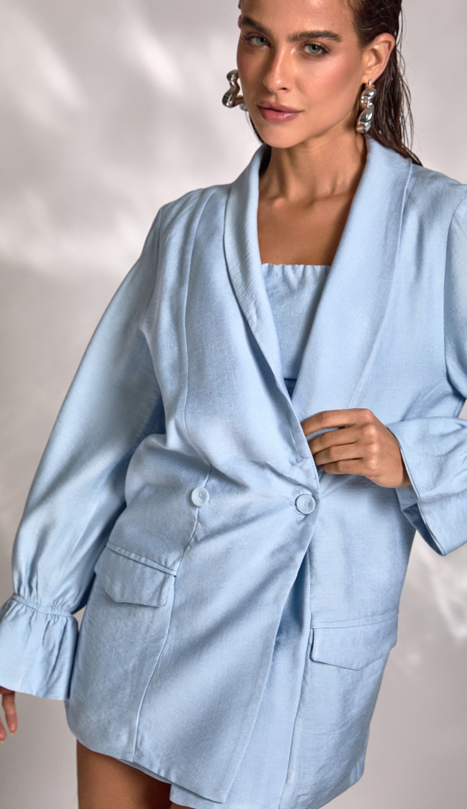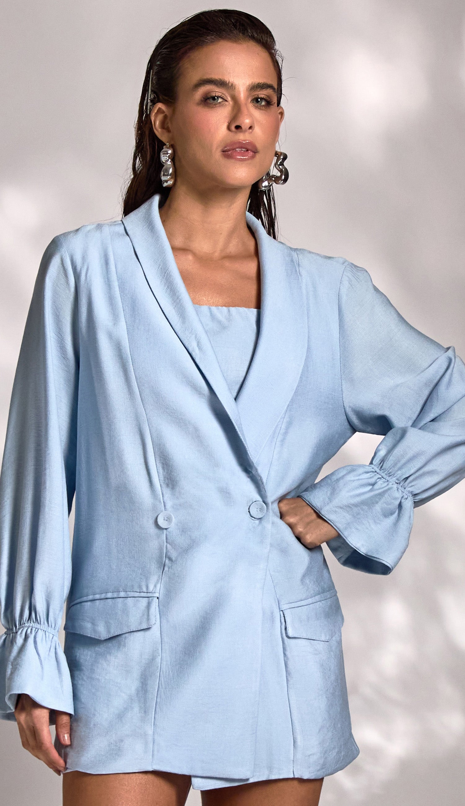 Trijunto confeccionado em poliviscose texturizado com aspecto de linho mais encorpado, efeito amassadinho e aparência levemente cintilante. O top possui forro, decote reto com elástico levemente franzido, alcinhas reguláveis, pala na cintura e lastex nas costas para melhor ajuste ao corpo. O shorts saia possui tecido duplo sobreposto, com shortinhos por baixo e saia por cima, evitando que fique transparente e garantindo mais conforto. Ele conta com bolso na lateral direita, recorte vazado geométrico no cós da lateral esquerda, que dá um charme especial à peça e o fechamento traseiro é por zíper de metal com o delicado detalhe do pingente com a conchinha da Laguna gravada. O blazer possui forro, modelagem alongada, fechamento frontal por único botão forrado com decote em V, lapela dobrada na gola, bolsos frontais também com lapelas e mangas longas com elástico franzido e babadinho nos punhos.