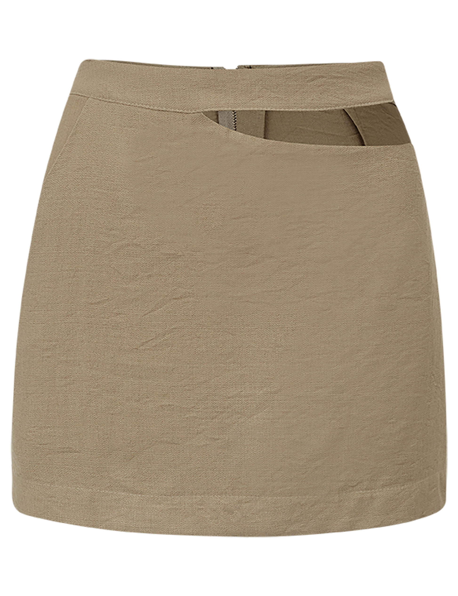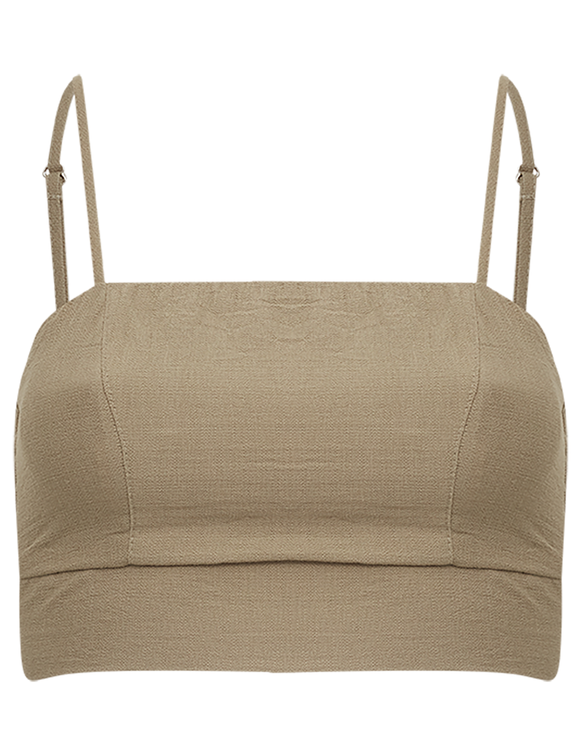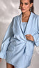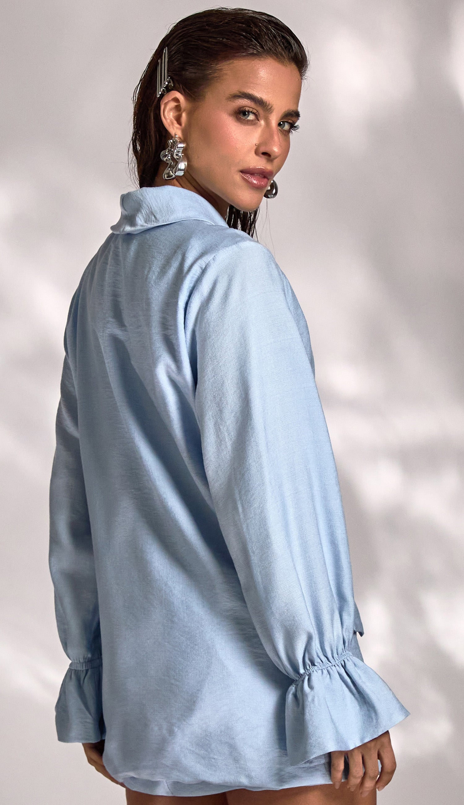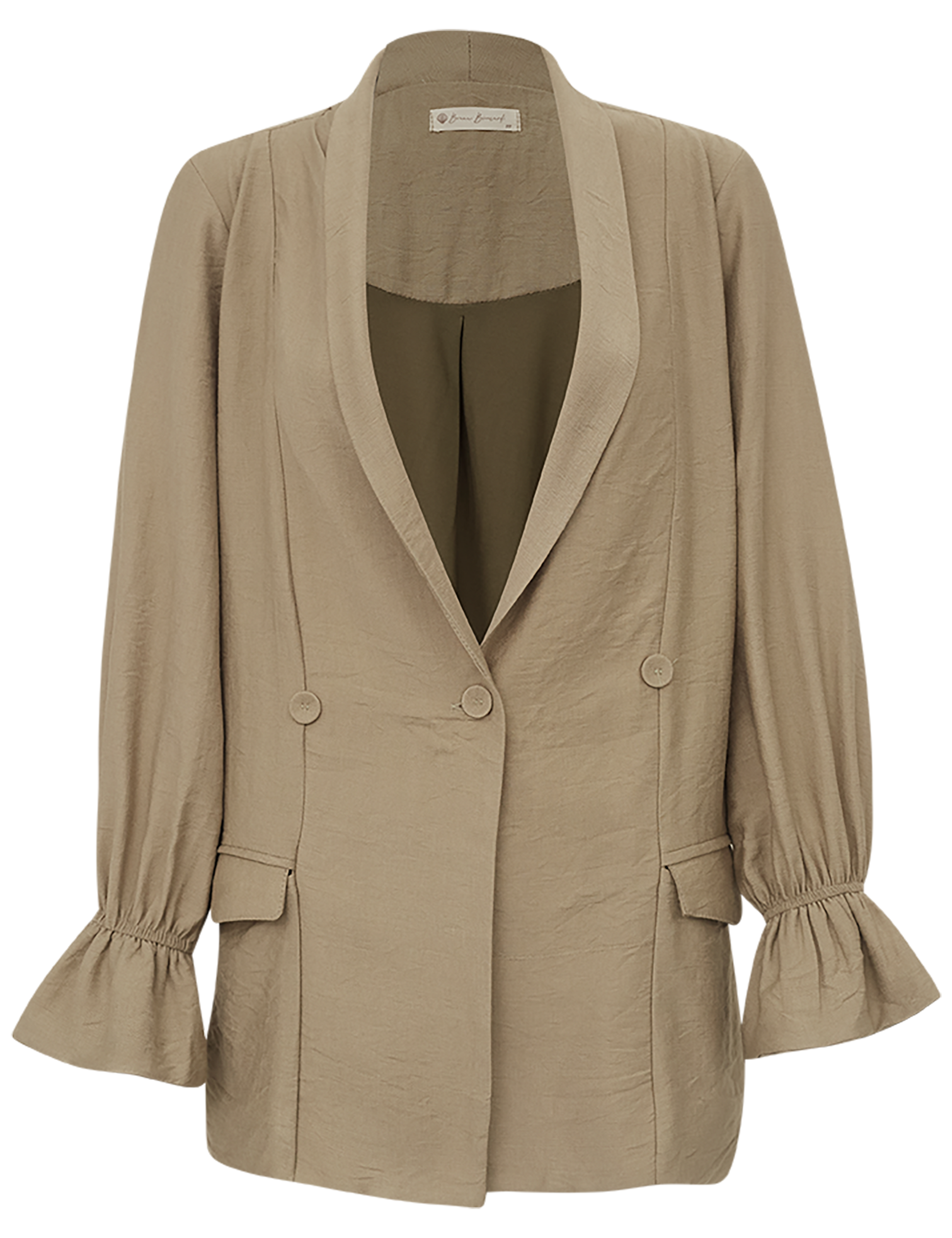 Trijunto confeccionado em poliviscose texturizado com aspecto de linho mais encorpado, efeito amassadinho e aparência levemente cintilante. O top possui forro, decote reto com elástico levemente franzido, alcinhas reguláveis, pala na cintura e lastex nas costas para melhor ajuste ao corpo. O shorts saia possui tecido duplo sobreposto, com shortinhos por baixo e saia por cima, evitando que fique transparente e garantindo mais conforto. Ele conta com bolso na lateral direita, recorte vazado geométrico no cós da lateral esquerda, que dá um charme especial à peça e o fechamento traseiro é por zíper de metal com o delicado detalhe do pingente com a conchinha da Laguna gravada. O blazer possui forro, modelagem alongada, fechamento frontal por único botão forrado com decote em V, lapela dobrada na gola, bolsos frontais também com lapelas e mangas longas com elástico franzido e babadinho nos punhos.