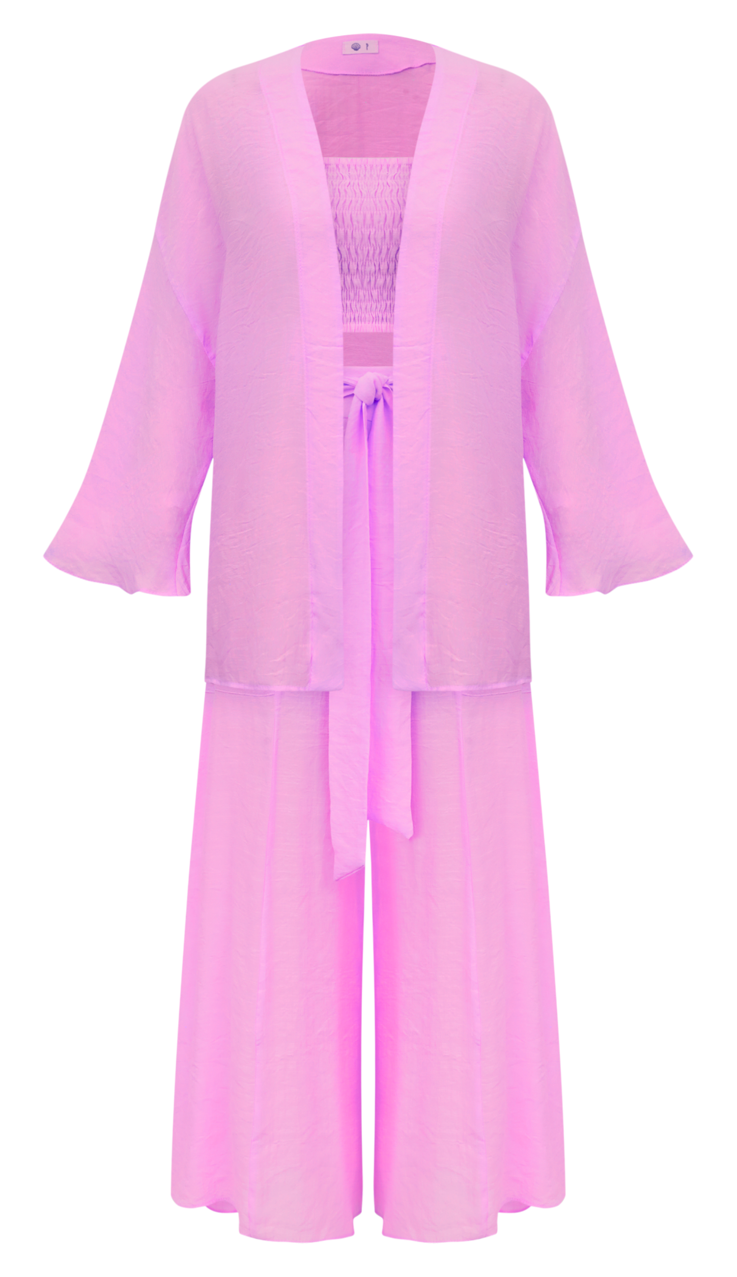 Trijunto confeccionado em poliviscose texturizado com aspecto de linho. O top é inteiro de lastex, o que dá conforto e sustentação. A calça pantacourt com forro possui faixa solta para amarração, bolsos frontais e fechamento por zíper invisível na lateral. O kimono possui mangas sino e abertura nas laterais.