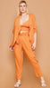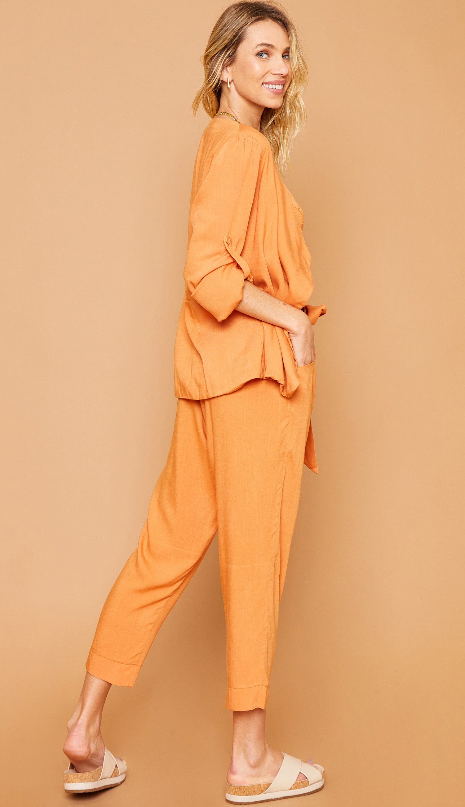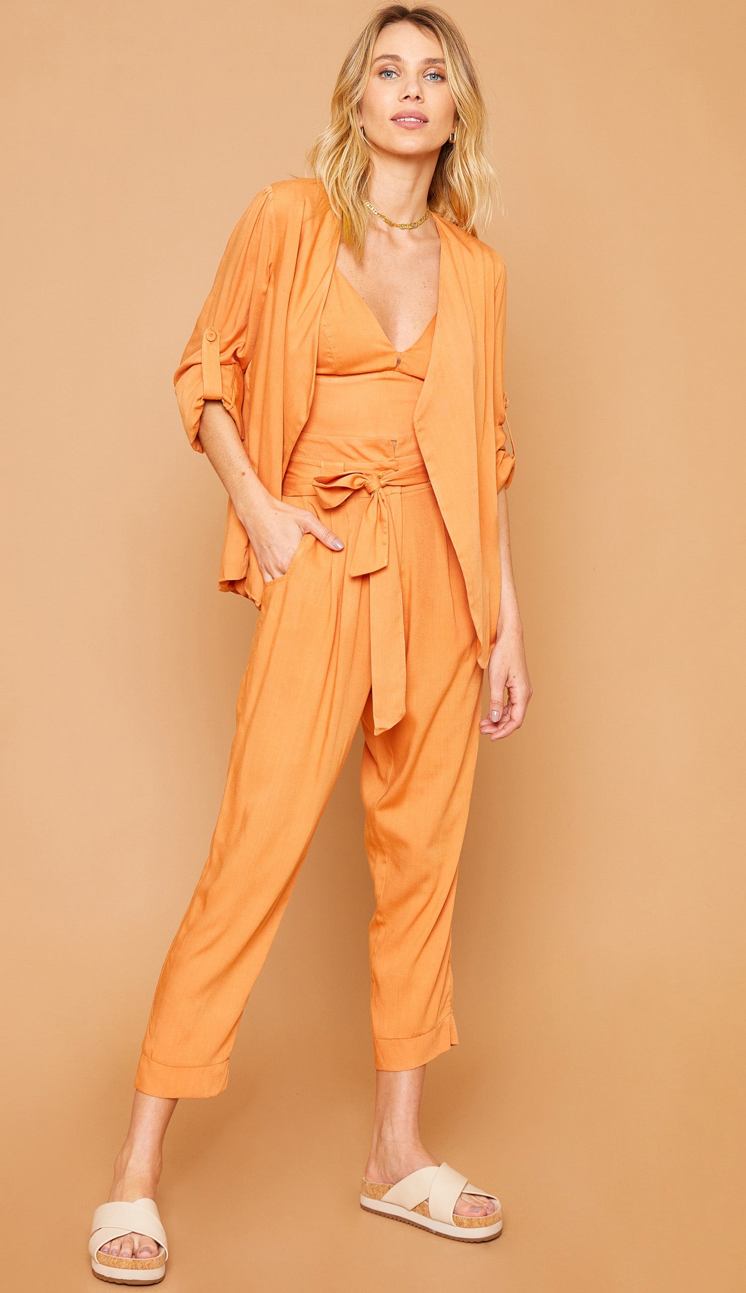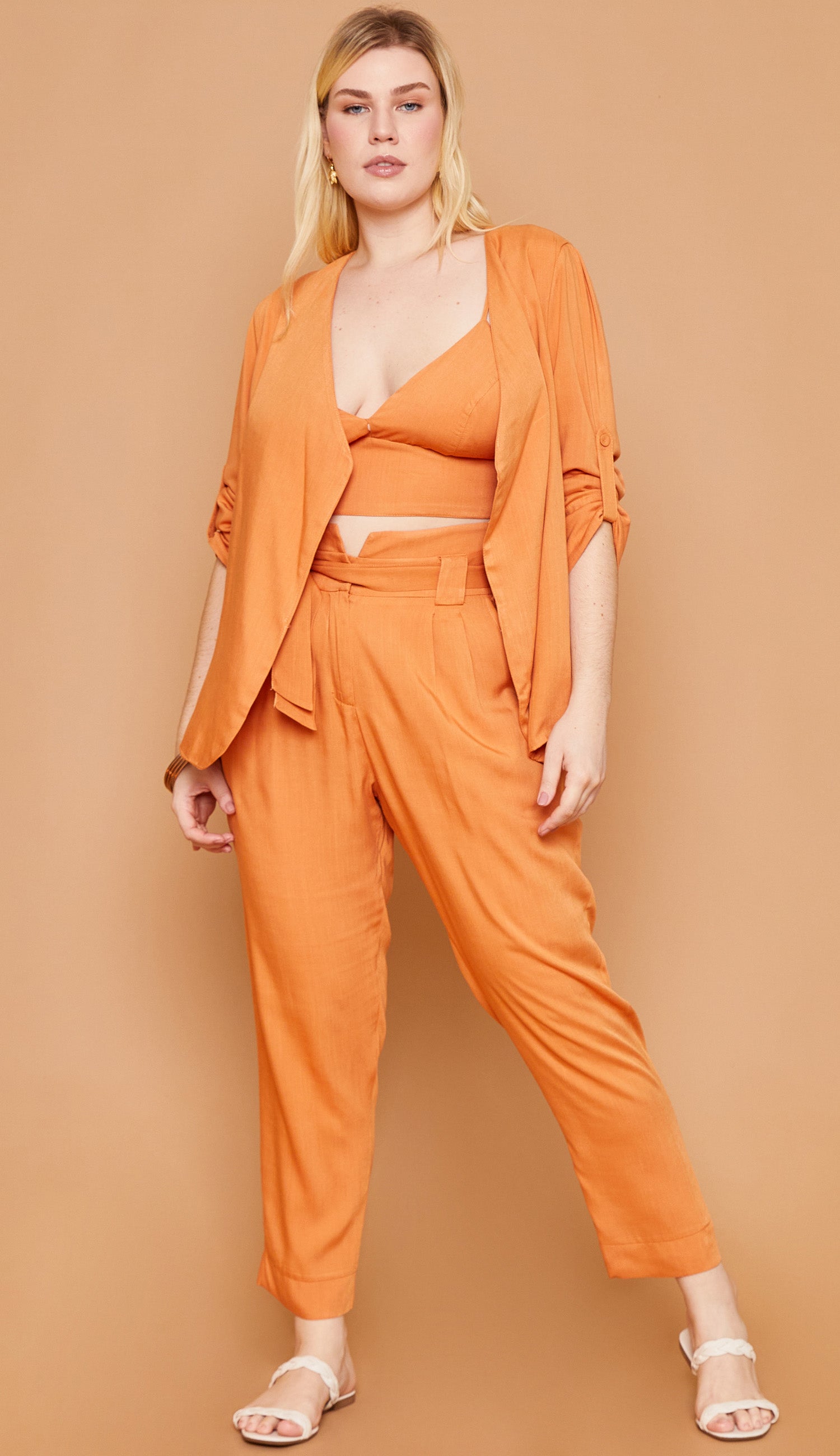 Trijunto confeccionado em viscose com forro. O top possui decote em V, alças finas e reguláveis e lastex franzido nas costas. A calça possui pregas e bolsos frontais, faixa solta para ajustar no cós e barras dobradas. O blazer é mais leve! Com frente assimétrica, mangas longas com martingale e botão forrado.