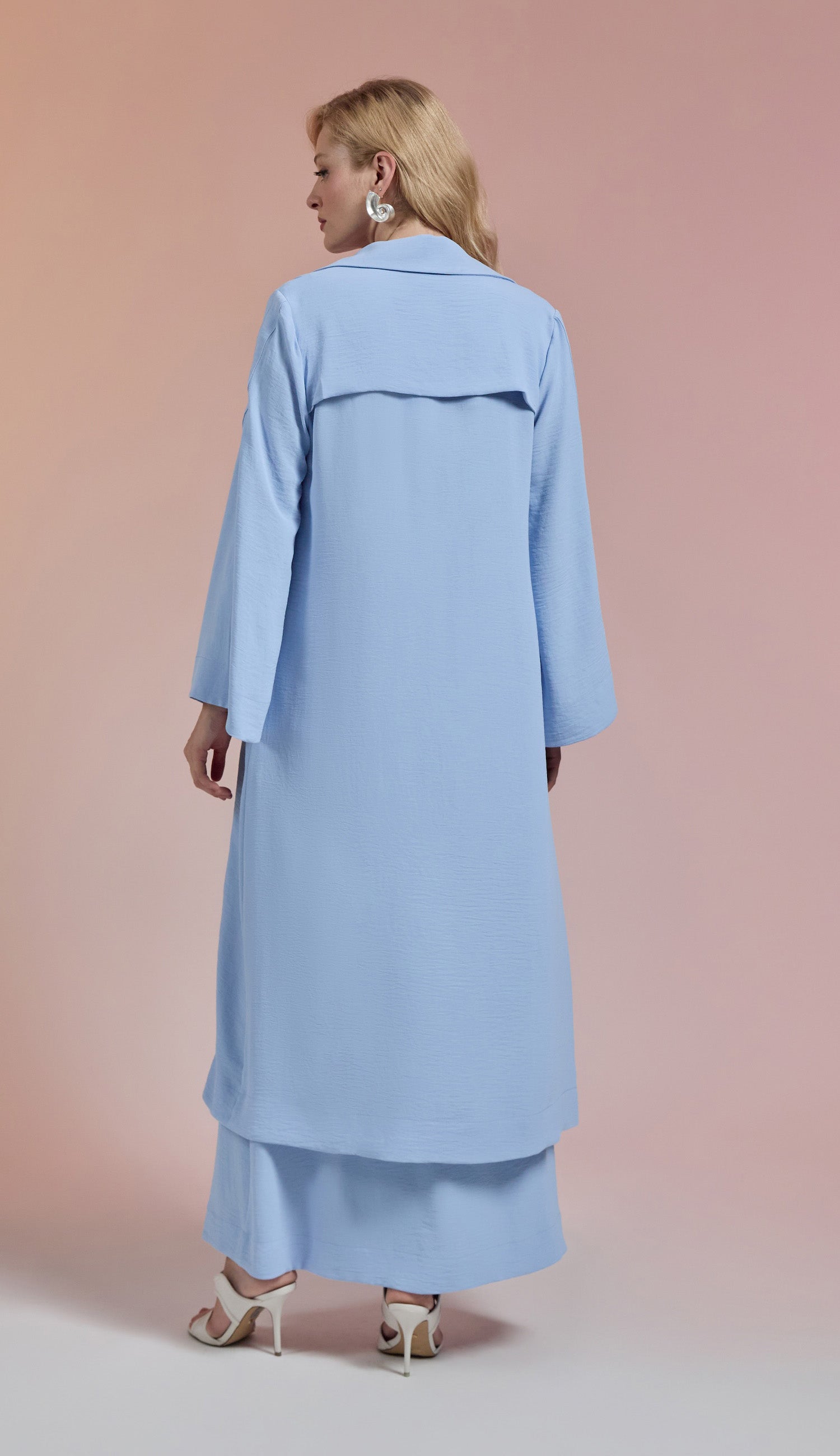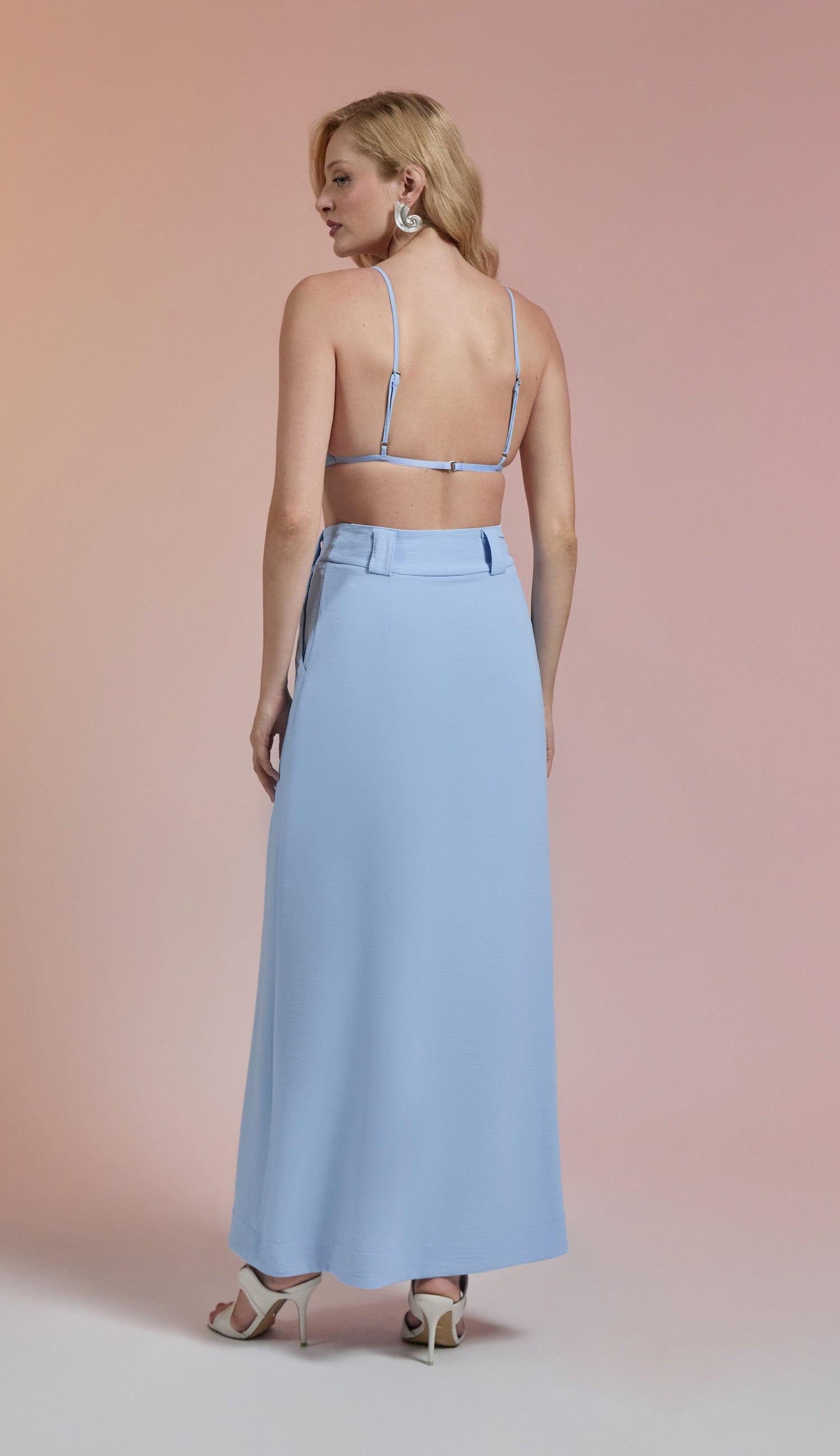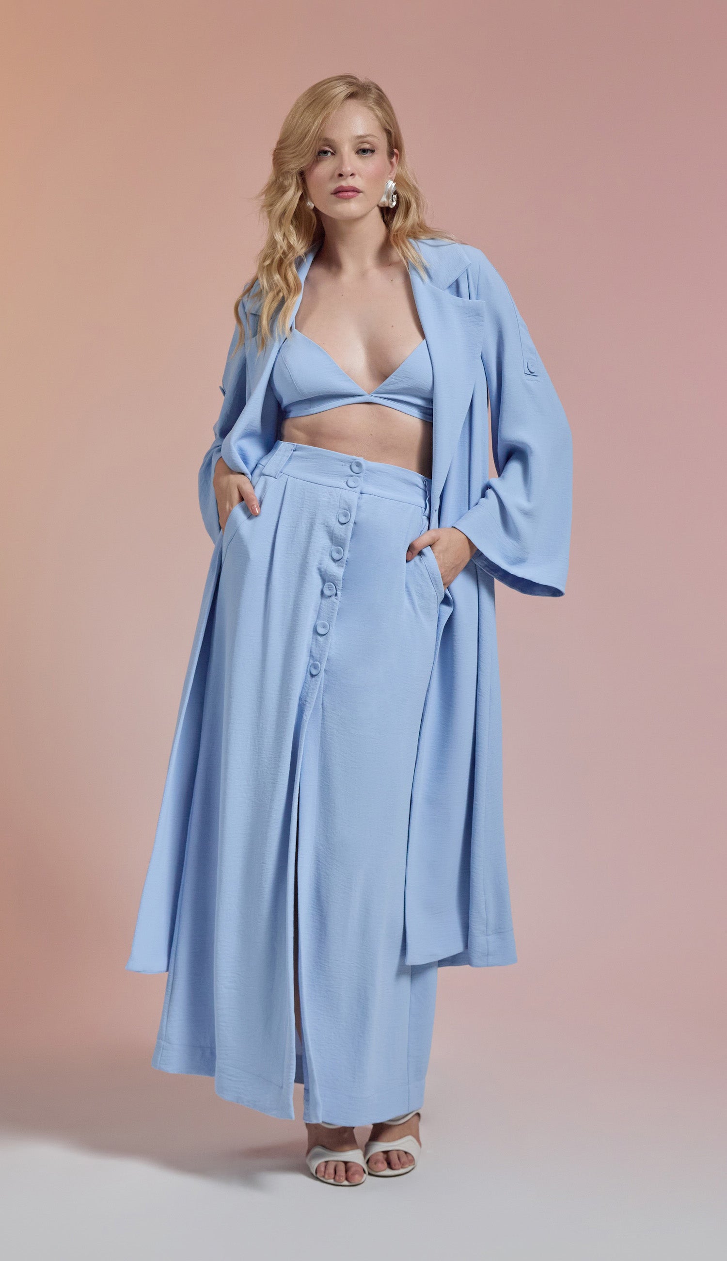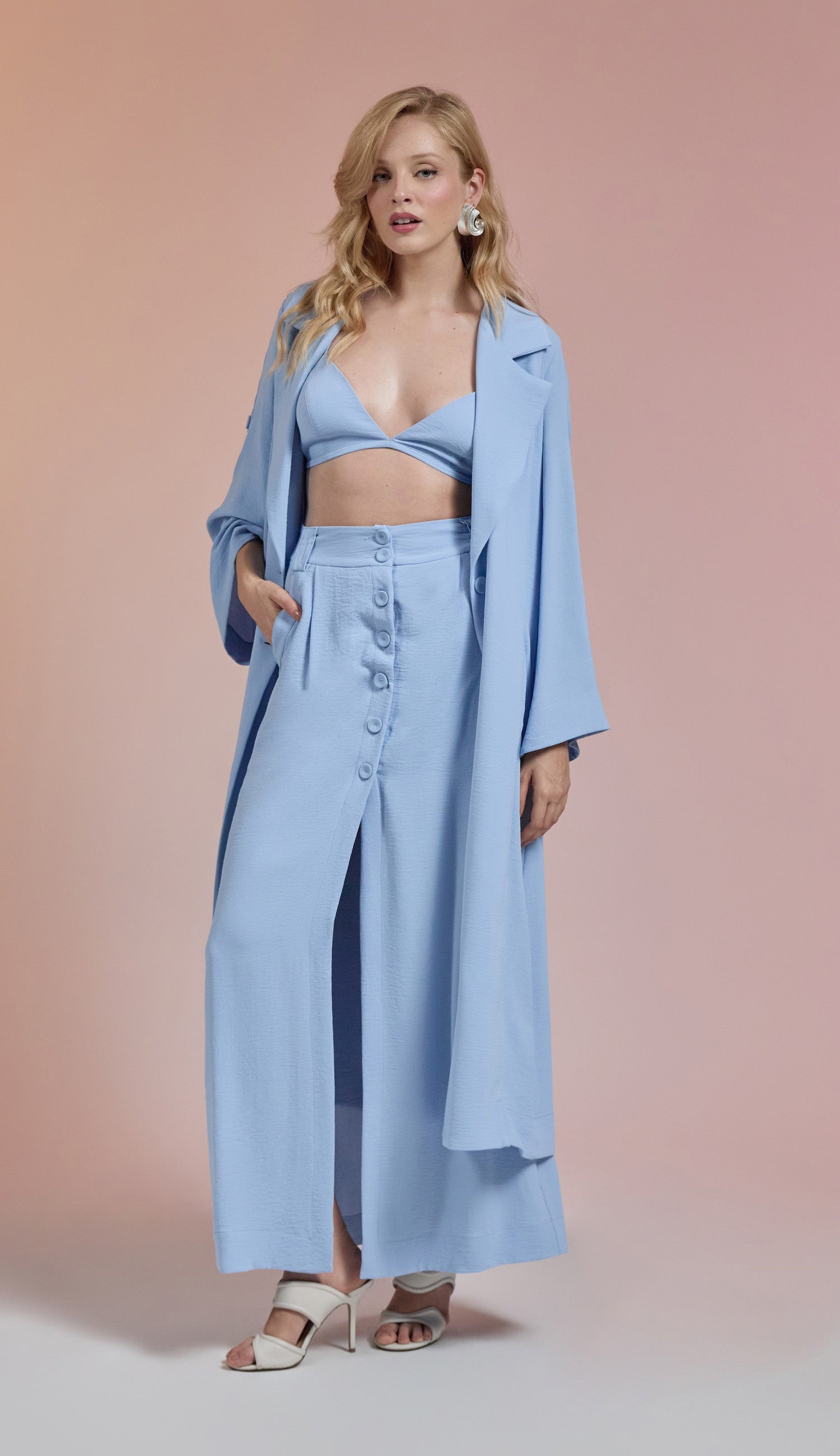 Trijunto em crepe texturizado com efeito amassadinho. O top é tipo "biquini" com decote em V, tecido duplo no busto para não ficar transparente, alcinhas reguláveis e elástico fino logo abaixo do busto com fechamento nas costas por fecho de metal para encaixe. A saia é longa com forro, tem bolsos laterais, fechamento frontal por botões forrados, fenda frontal e passantes no cós. O trench coat é longo com decote em V, lapelas dobradas na gola, fechamento frontal por botões forrados, mangas longas com martingale interno para ajuste na altura.