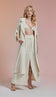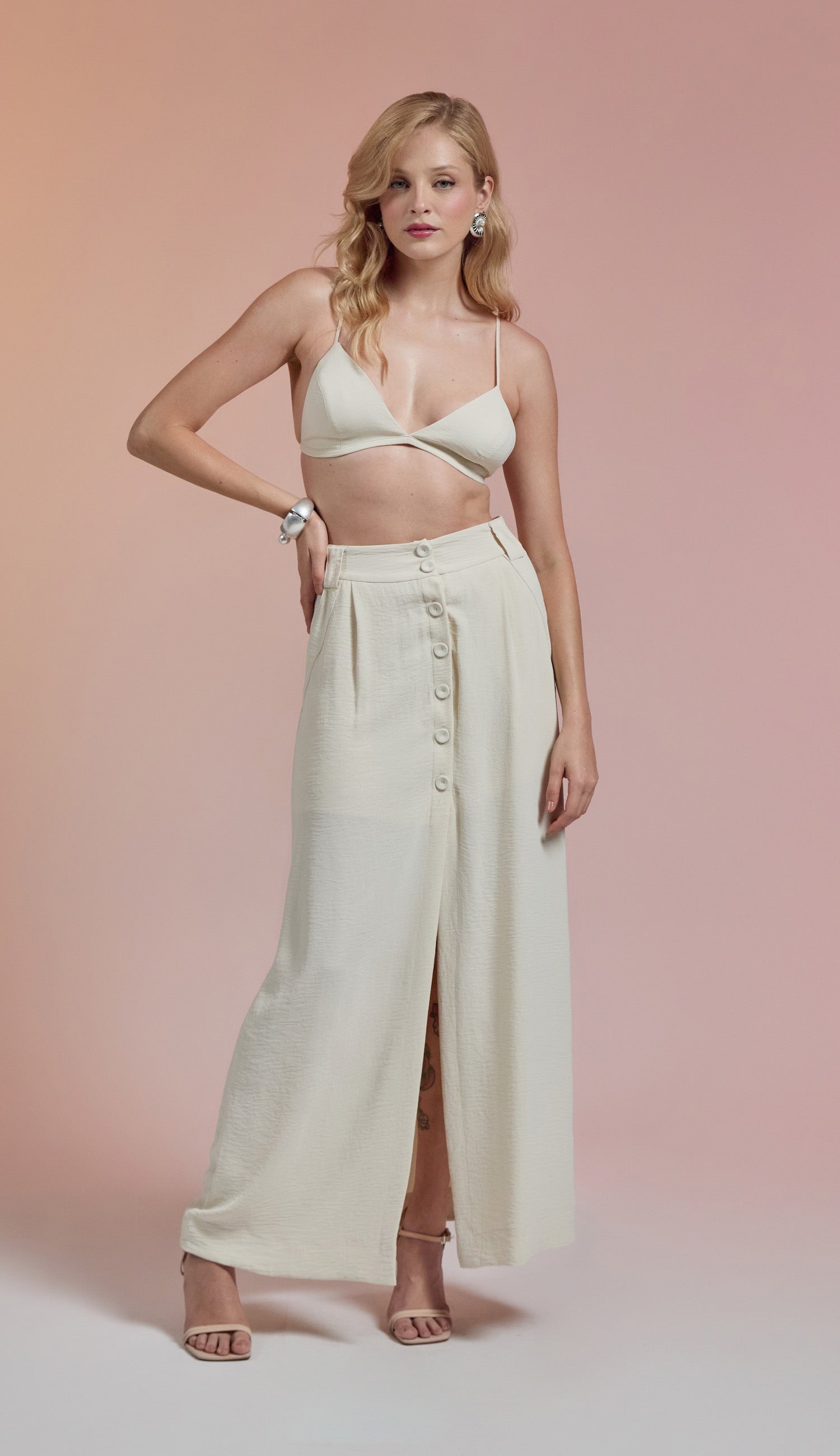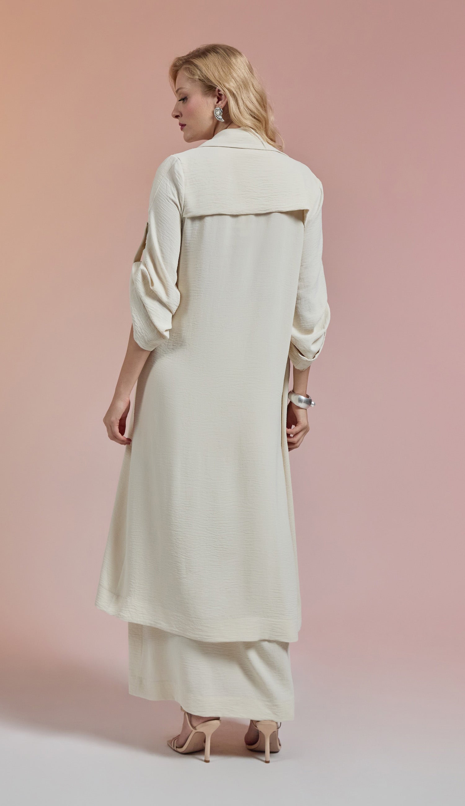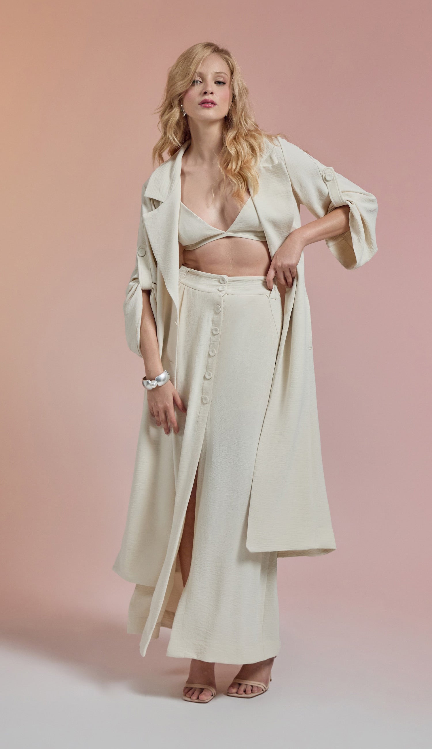 Trijunto em crepe texturizado com efeito amassadinho. O top é tipo "biquini" com decote em V, tecido duplo no busto para não ficar transparente, alcinhas reguláveis e elástico fino logo abaixo do busto com fechamento nas costas por fecho de metal para encaixe. A saia é longa com forro, tem bolsos laterais, fechamento frontal por botões forrados, fenda frontal e passantes no cós. O trench coat é longo com decote em V, lapelas dobradas na gola, fechamento frontal por botões forrados, mangas longas com martingale interno para ajuste na altura.
