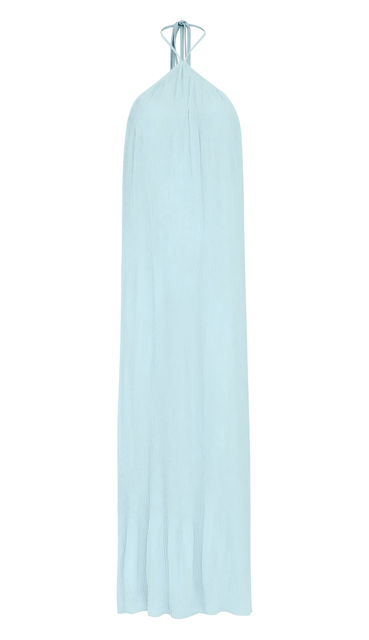 Vestido longo com forro; confeccionado em crepe todo plissado. Possui modelagem reta, decote halter estilo frente única com tirinhas compridas na gola para amarrar no pescoço e tirinha embutida nas costas para ajuste da altura do decote e amarração, ambas com com ponteiras de metal em formato de conchinha.
