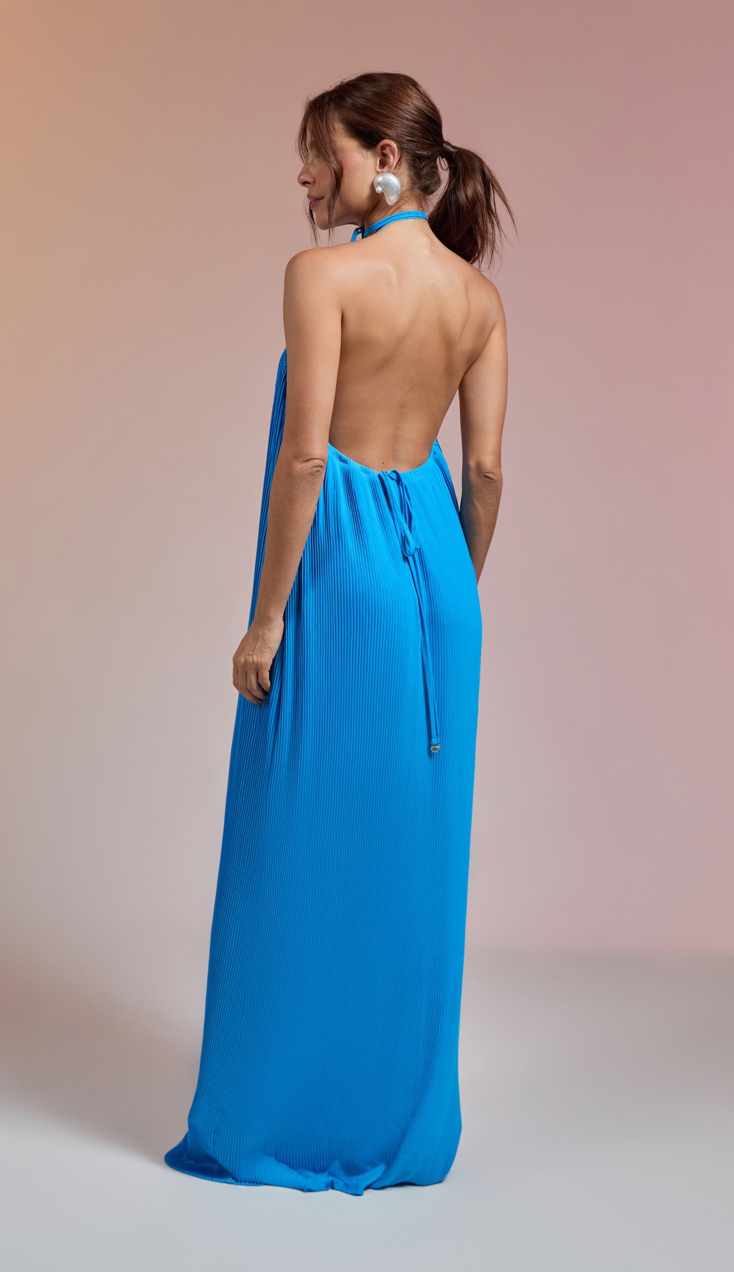 Vestido longo com forro; confeccionado em crepe todo plissado. Possui modelagem reta, decote halter estilo frente única com tirinhas compridas na gola para amarrar no pescoço e tirinha embutida nas costas para ajuste da altura do decote e amarração, ambas com com ponteiras de metal em formato de conchinha.