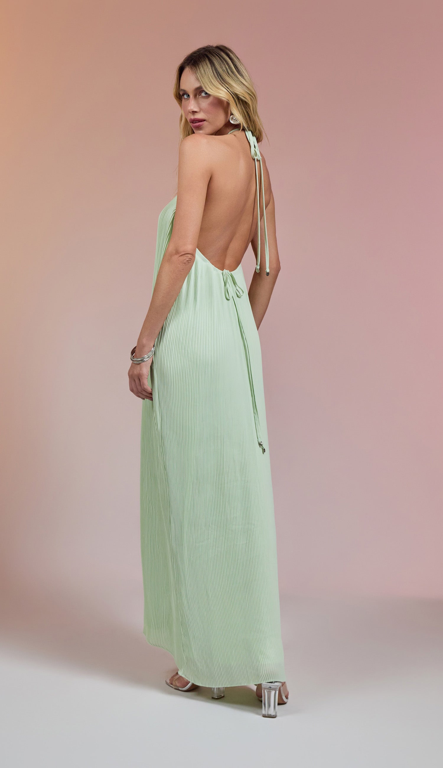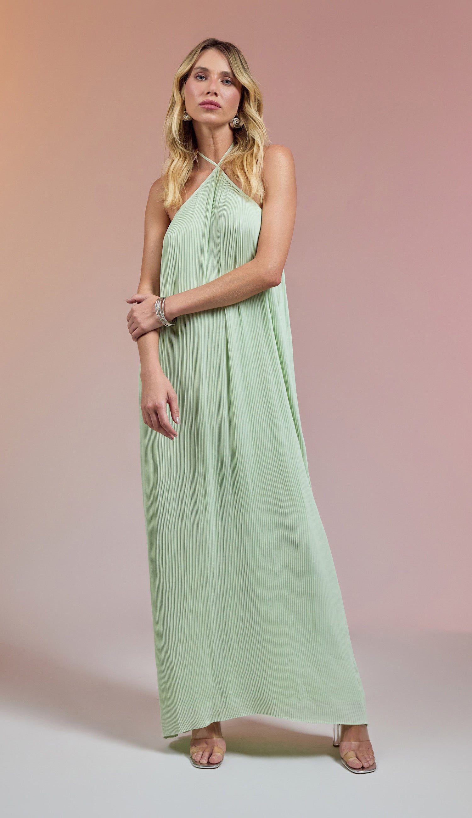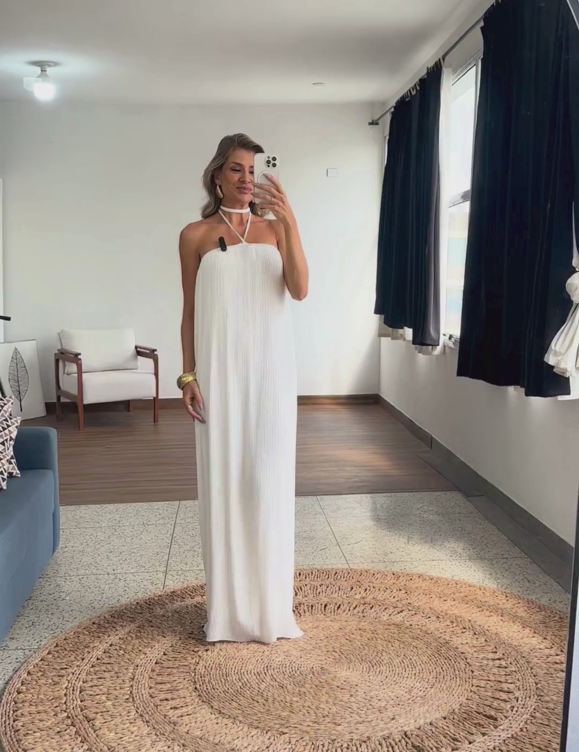 Vestido longo com forro; confeccionado em crepe todo plissado. Possui modelagem reta, decote halter estilo frente única com tirinhas compridas na gola para amarrar no pescoço e tirinha embutida nas costas para ajuste da altura do decote e amarração, ambas com com ponteiras de metal em formato de conchinha.