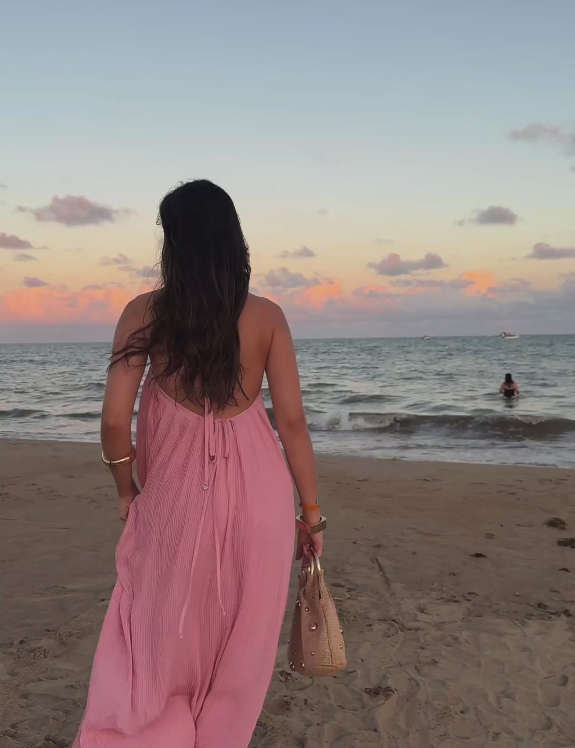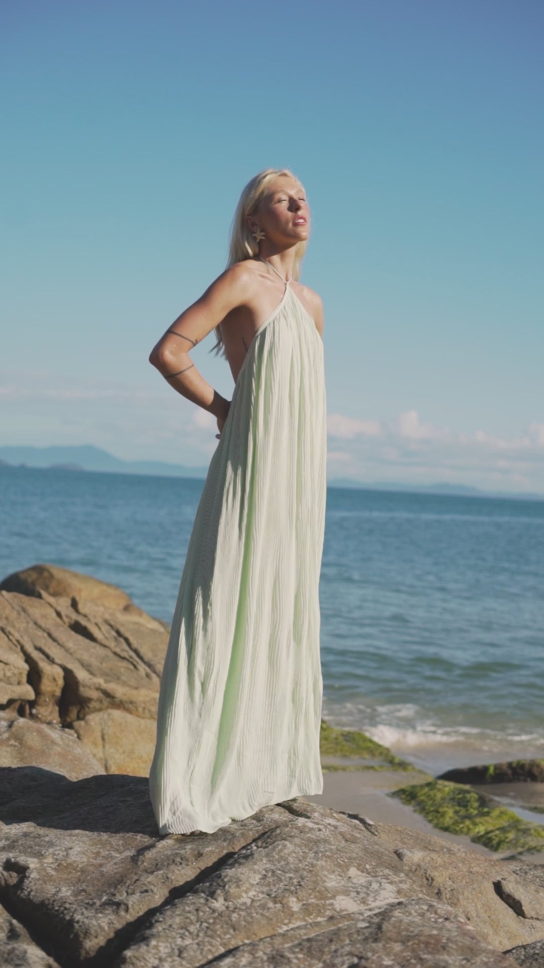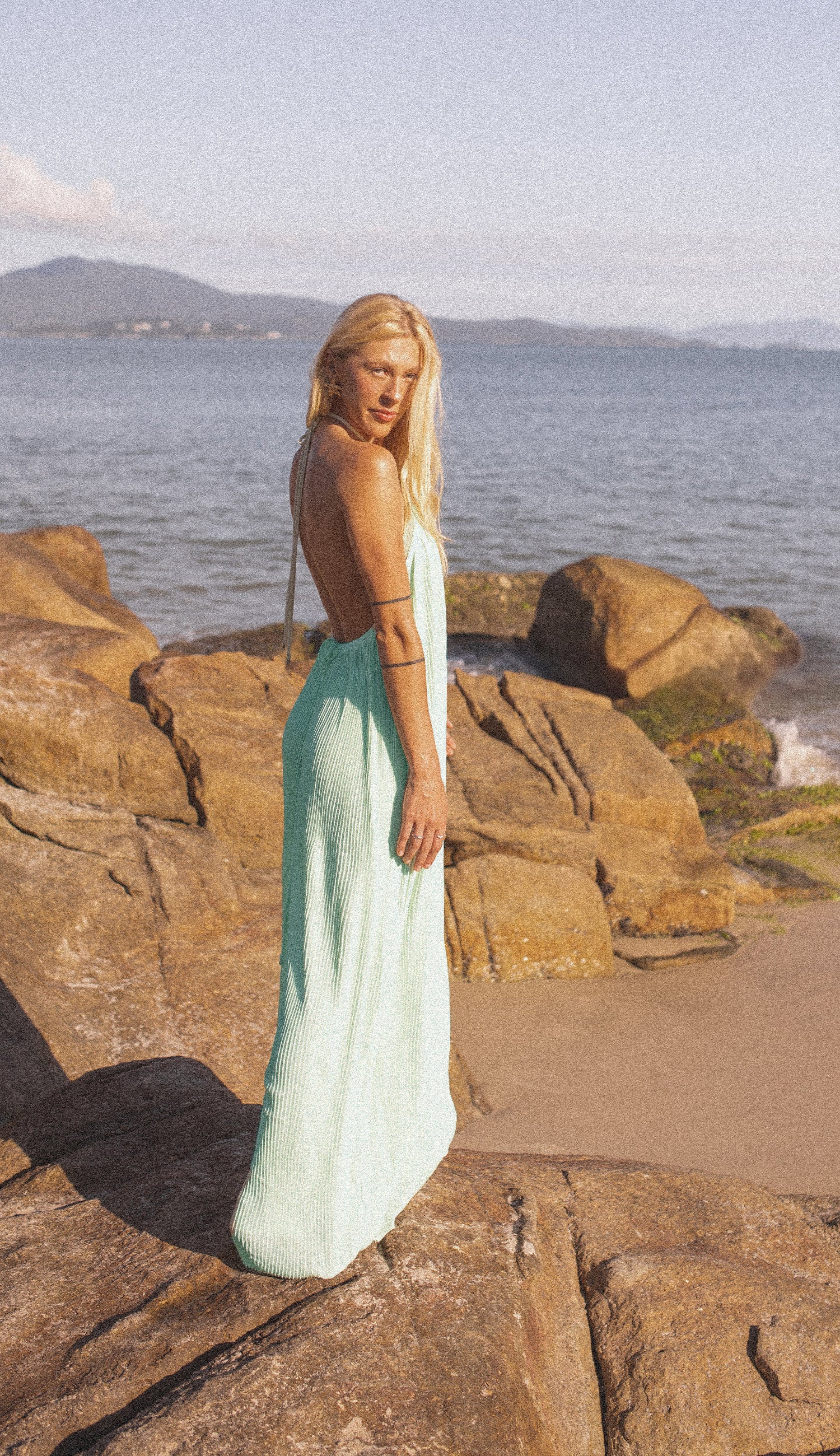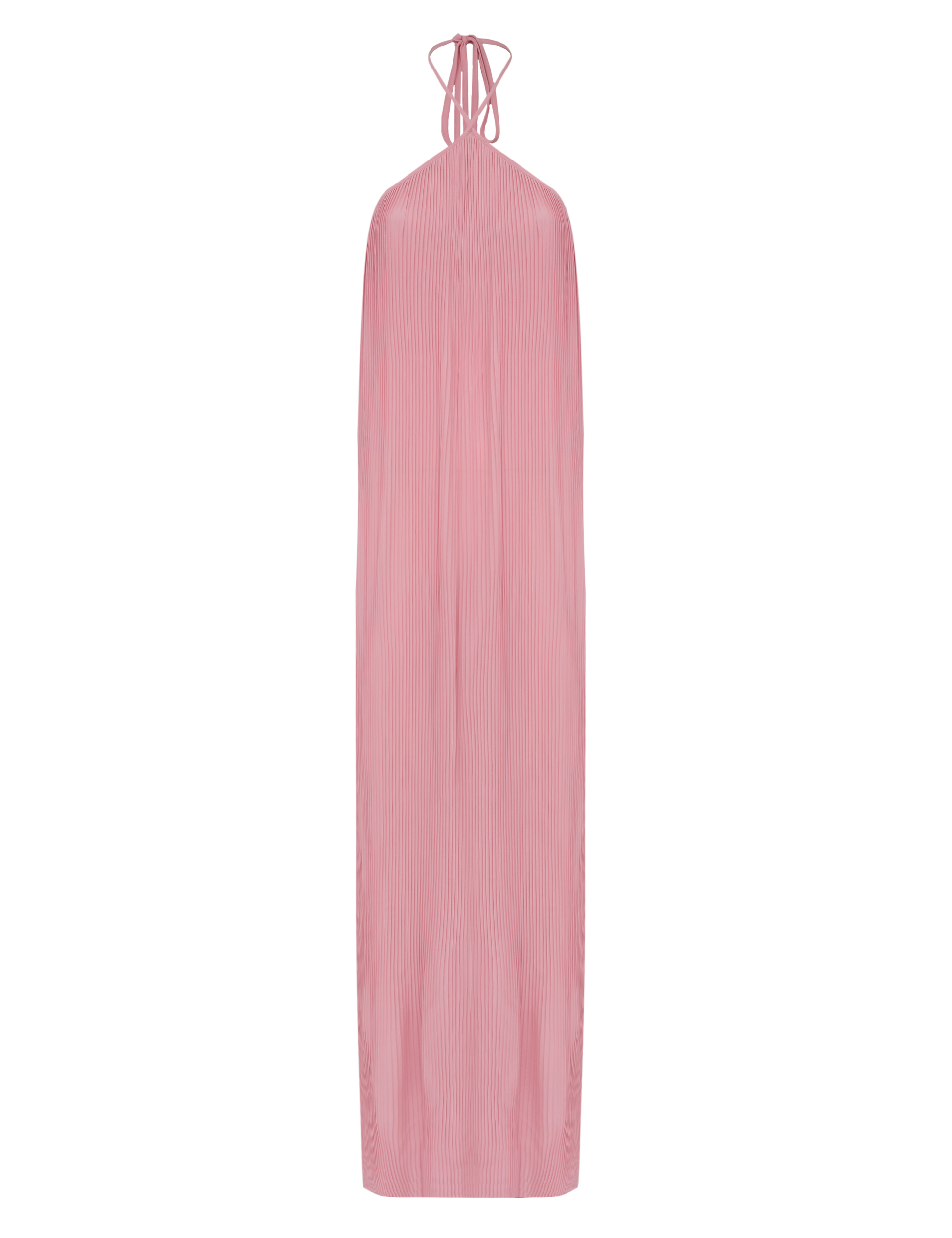 Vestido longo com forro; confeccionado em crepe todo plissado. Possui modelagem reta, decote halter estilo frente única com tirinhas compridas na gola para amarrar no pescoço e tirinha embutida nas costas para ajuste da altura do decote e amarração, ambas com com ponteiras de metal em formato de conchinha.