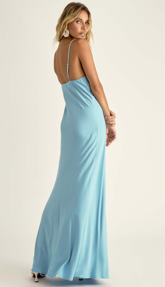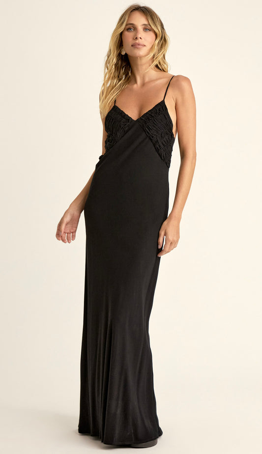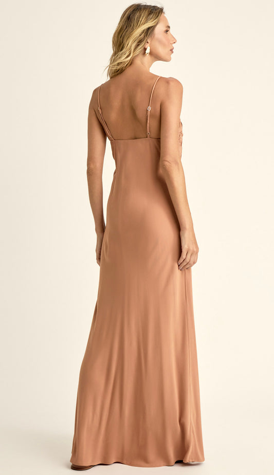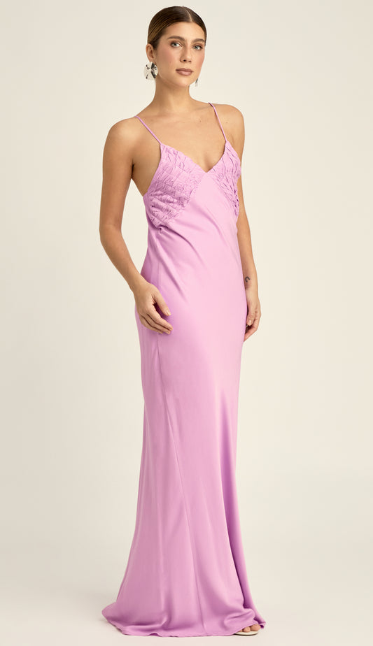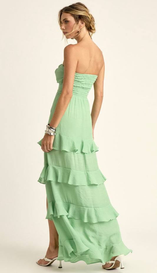 Vestido longo confeccionado em poliviscose texturizado com aspecto de linho. Possui decote ombro a ombro com elástico, tirinhas no meio para amarração no pescoço, top em lastex franzido, e babado sobreposto em todo o busto e costas. A saia possui forro e é separada do busto, fixa somente na frente, deixando uma abertura em toda a região da cintura, que possui elástico e ainda conta com uma linda fenda frontal.