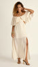 Vestido longo confeccionado em poliviscose texturizado com aspecto de linho. Possui decote ombro a ombro com elástico, tirinhas no meio para amarração no pescoço, top em lastex franzido, e babado sobreposto em todo o busto e costas. A saia possui forro e é separada do busto, fixa somente na frente, deixando uma abertura em toda a região da cintura, que possui elástico e ainda conta com uma linda fenda frontal.