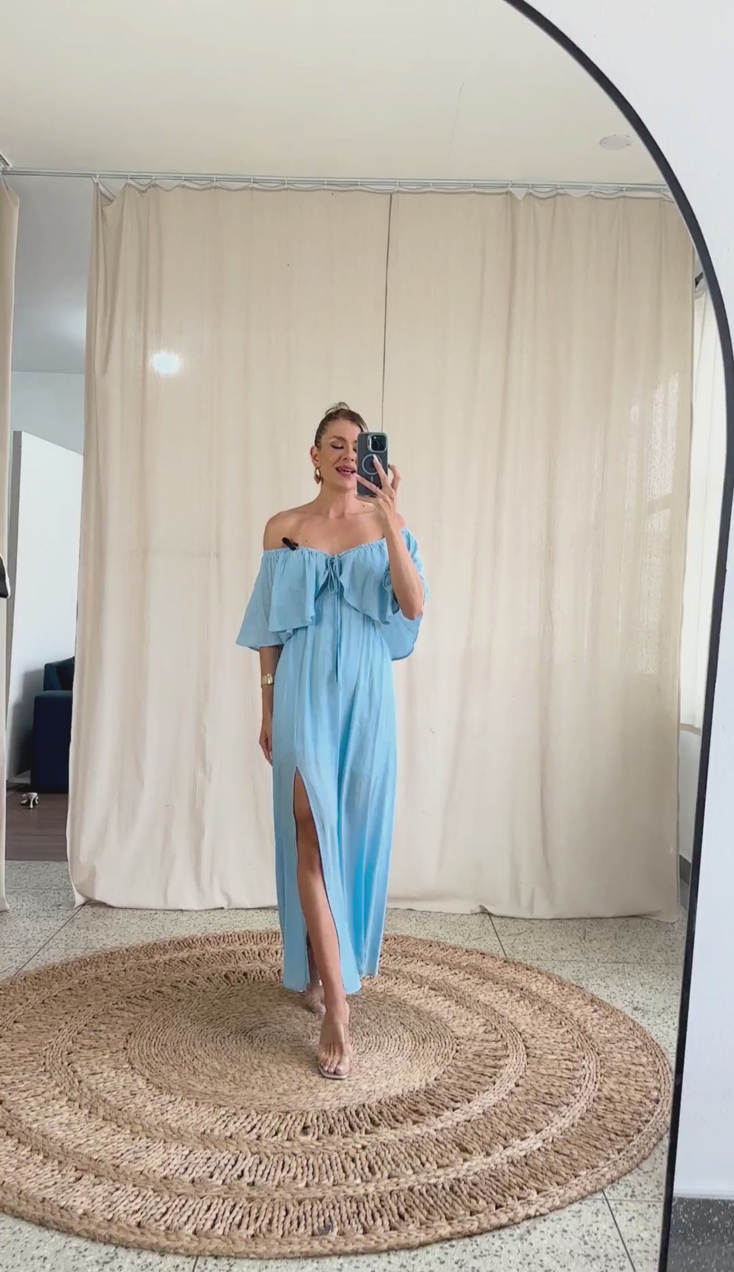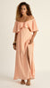 Vestido longo confeccionado em poliviscose texturizado com aspecto de linho. Possui decote ombro a ombro com elástico, tirinhas no meio para amarração no pescoço, top em lastex franzido, e babado sobreposto em todo o busto e costas. A saia possui forro e é separada do busto, fixa somente na frente, deixando uma abertura em toda a região da cintura, que possui elástico e ainda conta com uma linda fenda frontal.