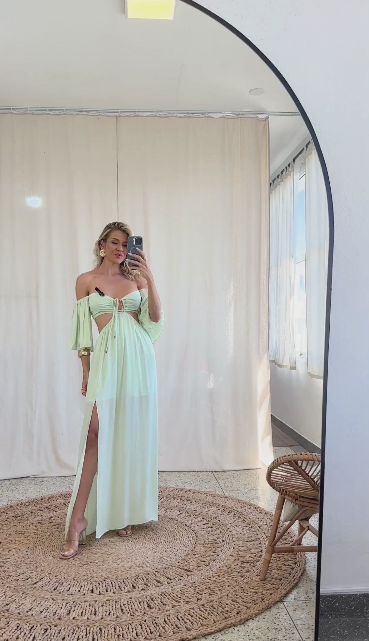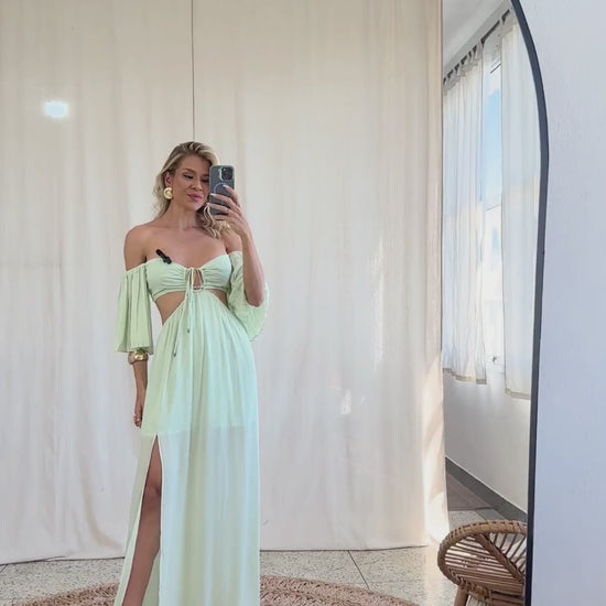 Vestido longo confeccionado em crepe. Possui forro na saia; tecido duplo no busto para não ficar transparente; decote ciganinha; busto aberto com tira comprida embutida no centro para franzir e amarrar no pescoço com ponteiras de metal em formato de conchinha; mangas sino curtas plissadas com elástico nos ombros; lastex franzido nas costas para melhor ajuste ao corpo; busto fixo à saia somente por recorte frontal, deixando toda a região da cintura à mostra; elástico fino na saia e fenda frontal.